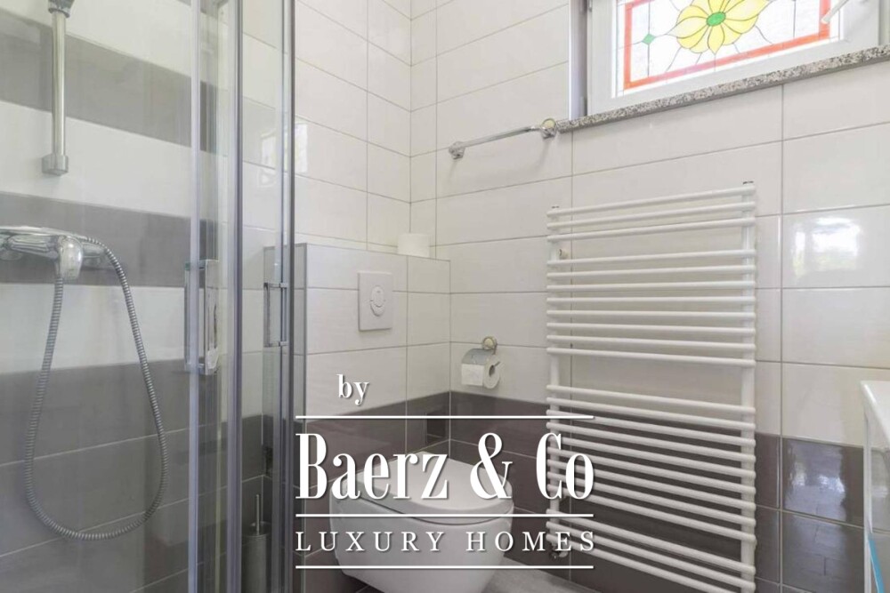 Ascending the central internal staircase leads to five bedrooms, each with a private en suite bathroom, ensuring comfort and discretion for residents and guests. The villa is fully air-conditioned and also offers radiators for added warmth during winter months. Parking is arranged for three vehicles within the garden.