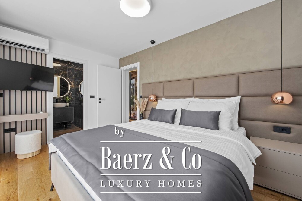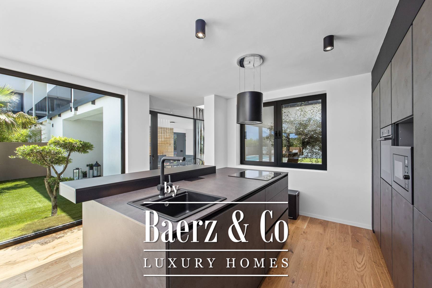 Villa Medulin stands as an example of contemporary design on Croatia’s Adriatic coast. This property, with 220 m² of living space, is set in a tranquil pocket of Medulin, occupying a 500 m² plot where garden and architecture create a measured retreat. The villa’s thoughtful layout spans two levels, with the ground floor featuring a luminous living area anchored by an electric fireplace and an expansive aluminum sliding wall opening directly onto the 40 m² pool. This pool, designed for use throughout the seasons, becomes the heart of indoor-outdoor living.