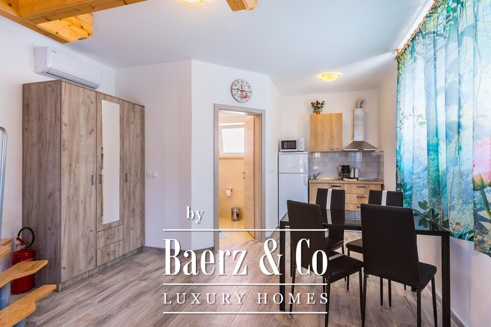The property’s layout creates a sense of rhythm and purpose, allowing each apartment to function autonomously. Residents enjoy panoramic sea views from the attic and access to a landscaped garden with parking for nine vehicles. The land at the front extends possibilities further, permitting the creation of a swimming pool, summer kitchen, gathering spaces, or even an additional house if desired.