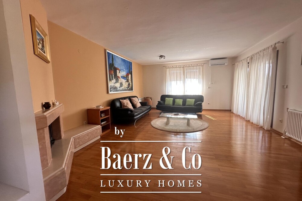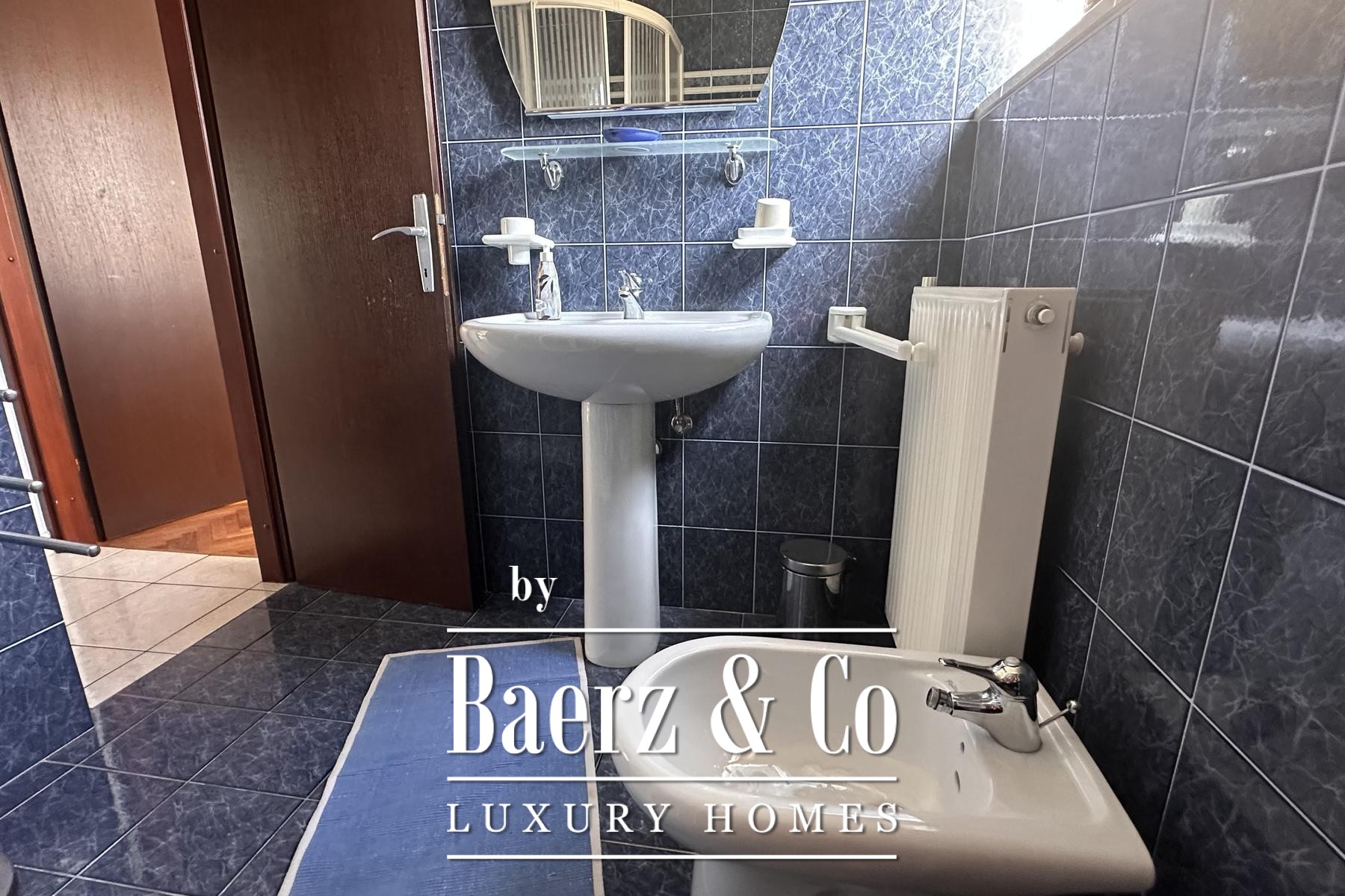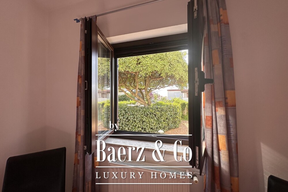 Designed for flexibility and comfort, the ground floor apartment is arranged with one bedroom, a bathroom, an open living area, and a kitchen that extends into a glass-enclosed terrace. The surrounding garden presents both tranquility and the prospect of a private pool, with project planning already completed. Storage and a 40 m² garage provide practical support while an additional outdoor parking space adds versatility.