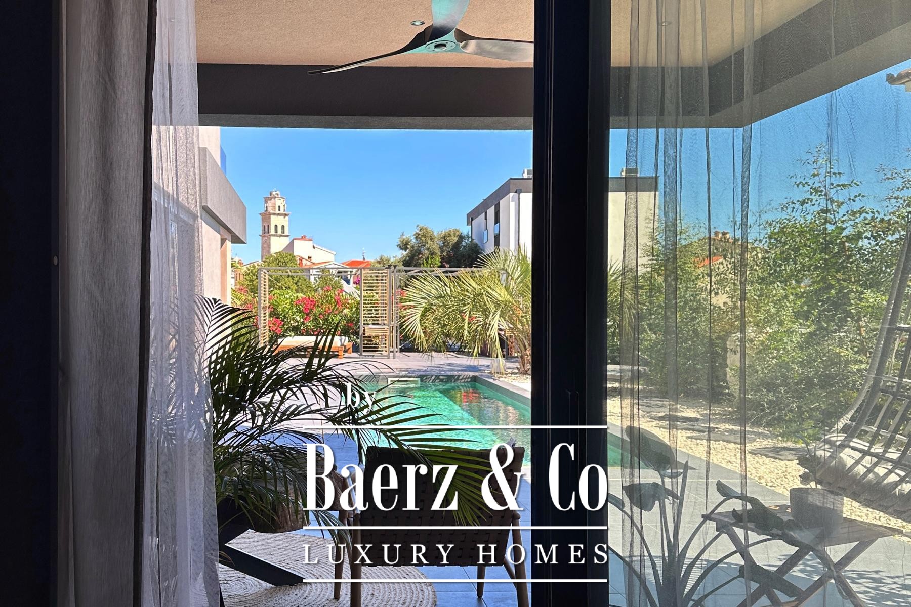 Villa Premantura Medulin is set on a carefully landscaped 710 m² plot at the southern edge of the Istrian peninsula. This property extends over 205 m², offering a sense of tranquility with understated architectural lines and natural light shaping each space. The ground floor welcomes you into a large living room, defined by warm tones, custom furnishings, and a fireplace that anchors the atmosphere. Floor-to-ceiling glass opens to reveal the swimming pool and garden, forging a seamless blend between indoors and out. A comfortable kitchen, a bedroom, a guest toilet, utility rooms, and access to the backyard encourage both relaxed living and practical intention.