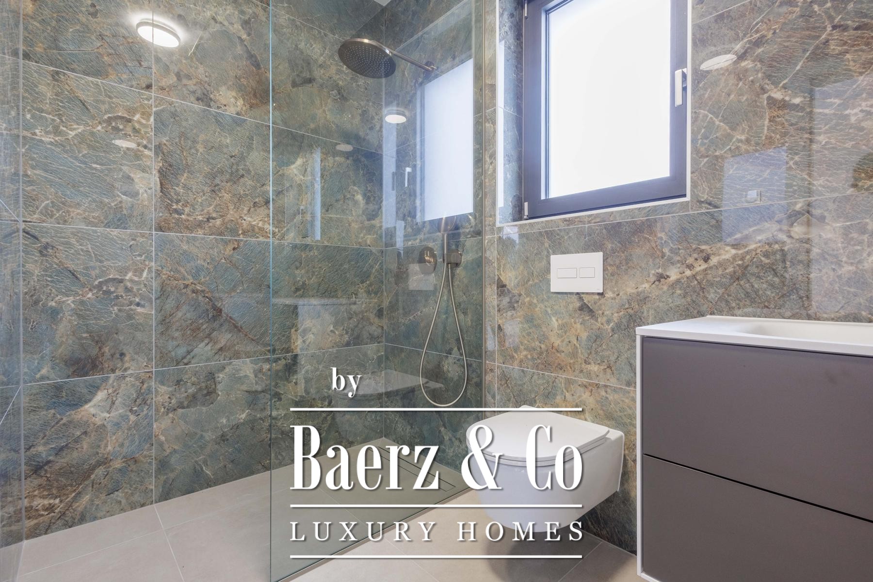 Ascending to the first floor, three bedrooms each come with private bathrooms, while four covered terraces create opportunities for quiet coastal views and privacy. The crowning rooftop terrace of 35 m² offers a secluded space for daytime sun or evenings spent by the sea. Material choices throughout are precise and premium, complemented by air conditioning, underfloor heating, and a heat pump system for year-round comfort. Four parking spaces, including two covered, underscore convenience and discretion.