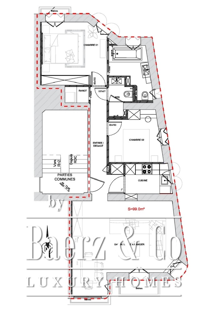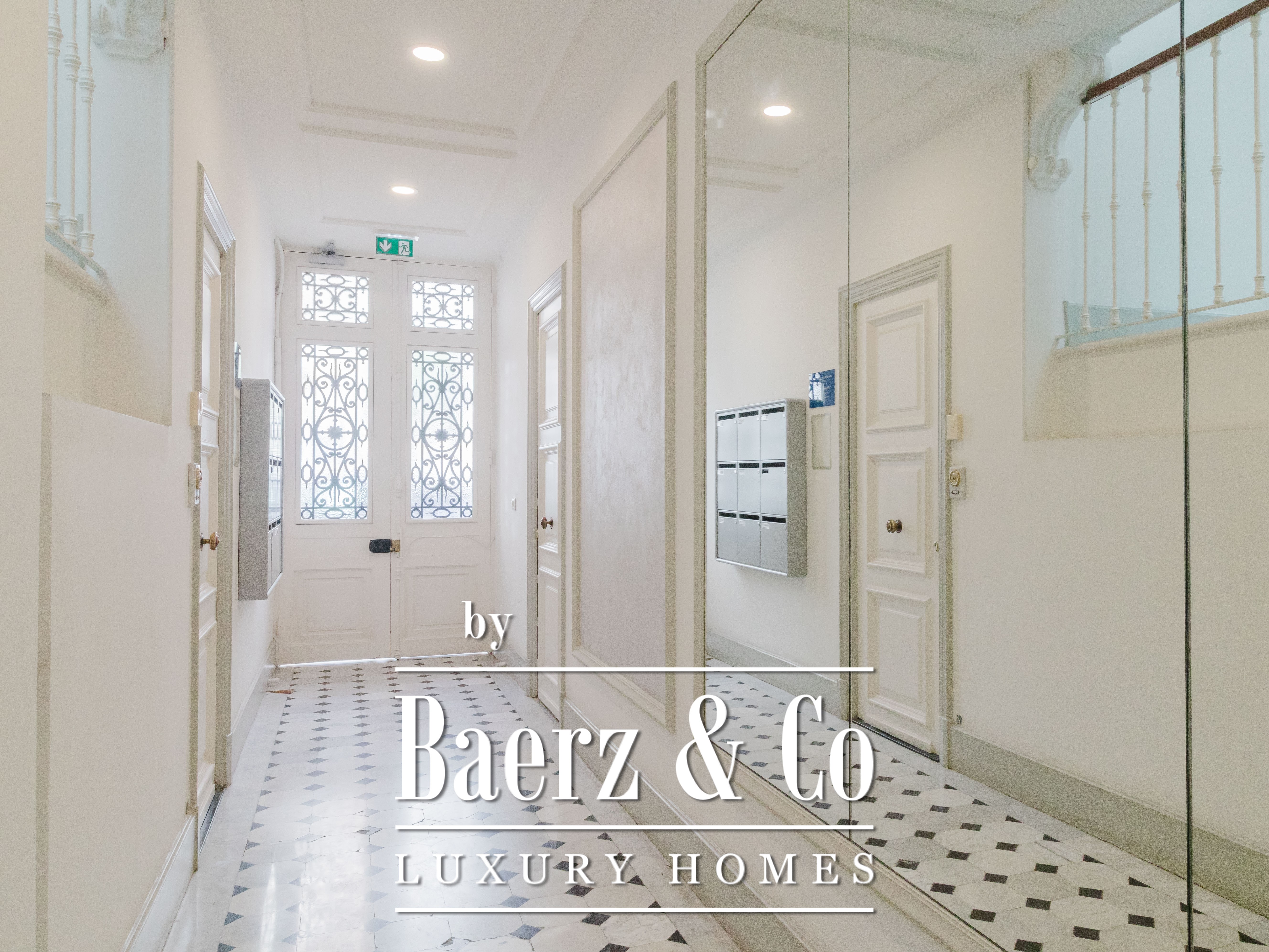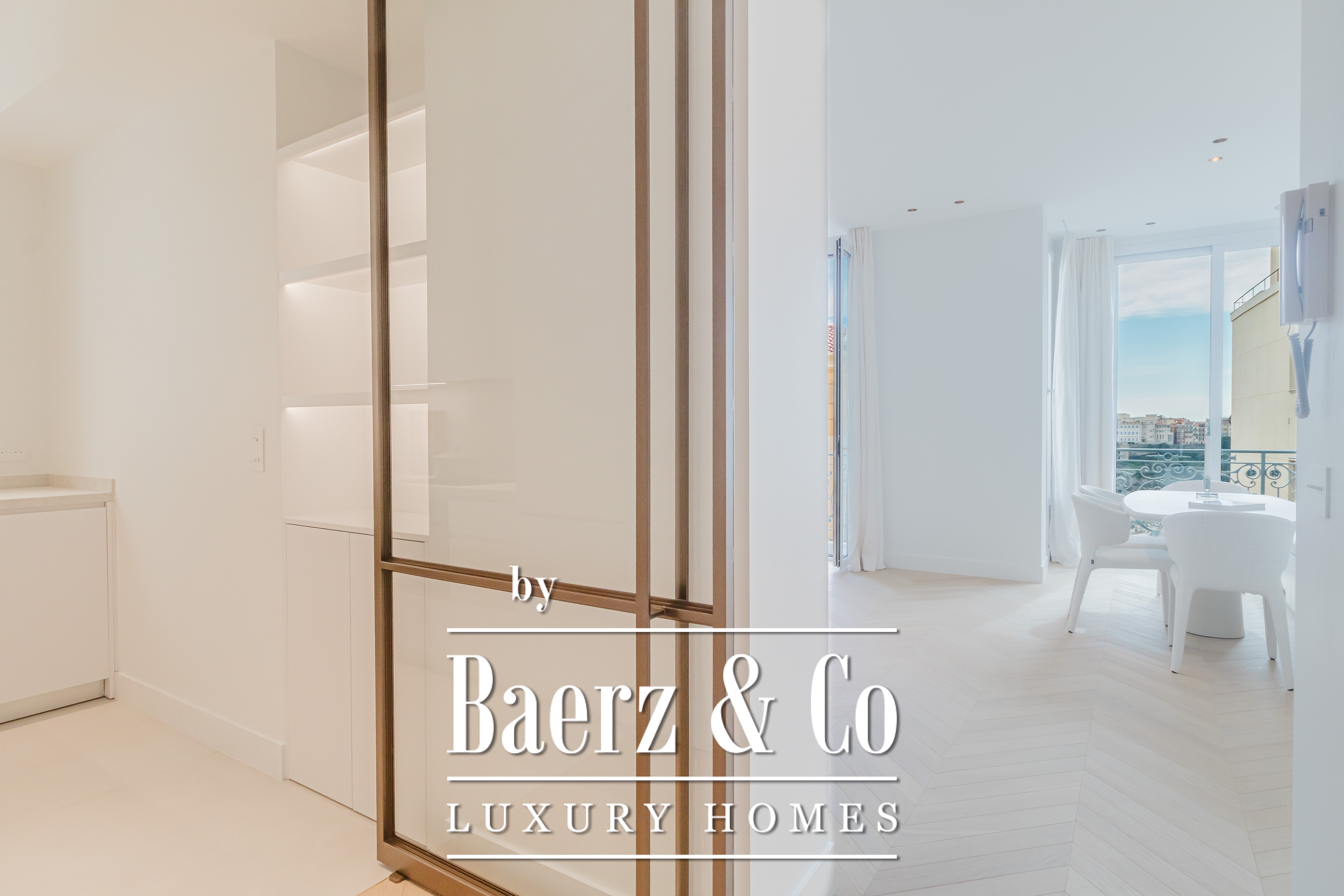 The property has been thoughtfully renovated and currently features two bedrooms and two bathrooms. The generous double living room opens to a private balcony, while a separate kitchen provides both privacy and functionality. Throughout the apartment, contemporary interiors are complemented by luxurious finishes such as a Corian bathtub, fitted wardrobes, new aluminium window frames, and dimmable LED lighting.