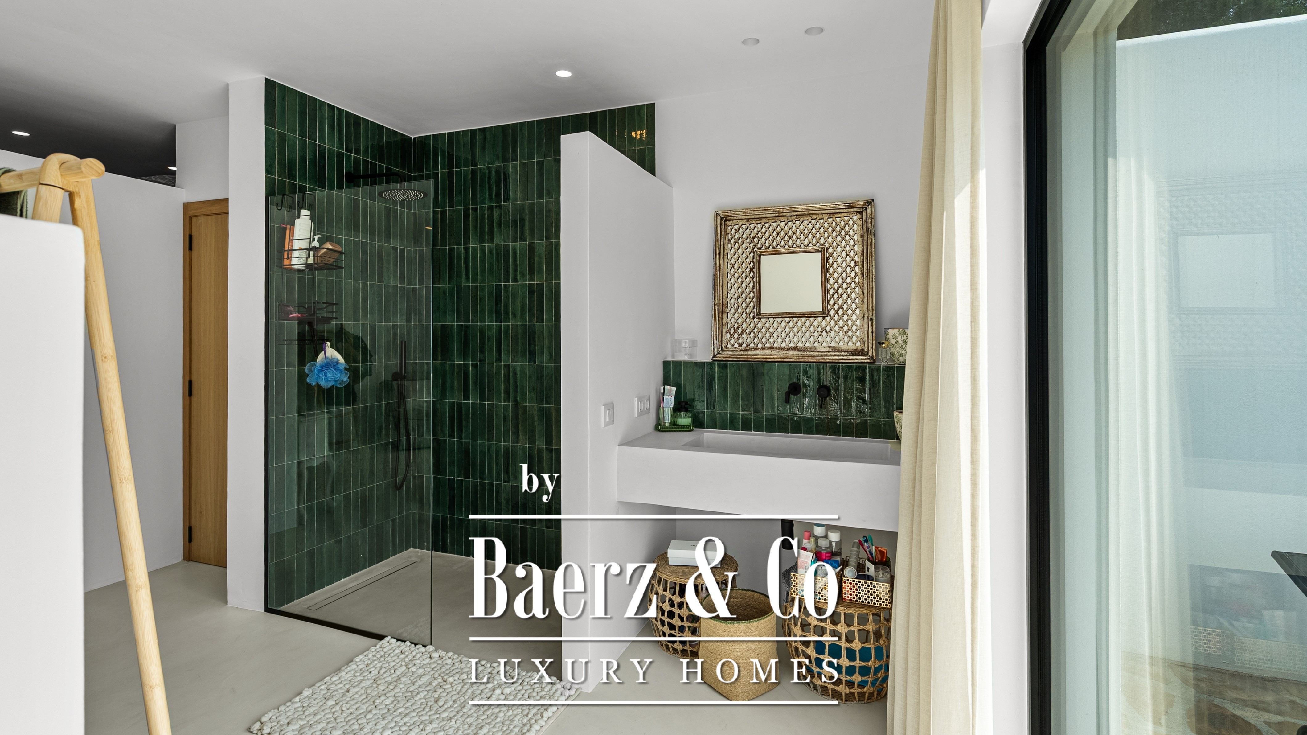 The villa offers four spacious bedrooms and three refined bathrooms, including a master suite with a unique detail: sea views even from the shower – a daily touch of luxury.