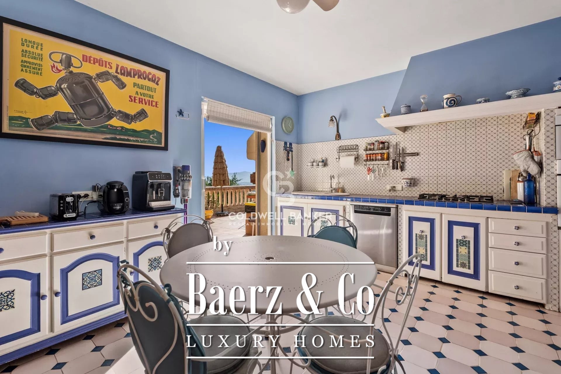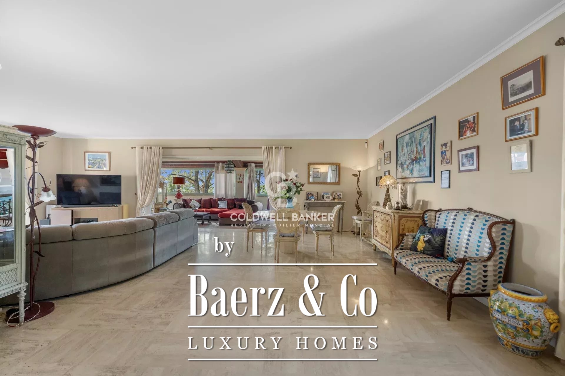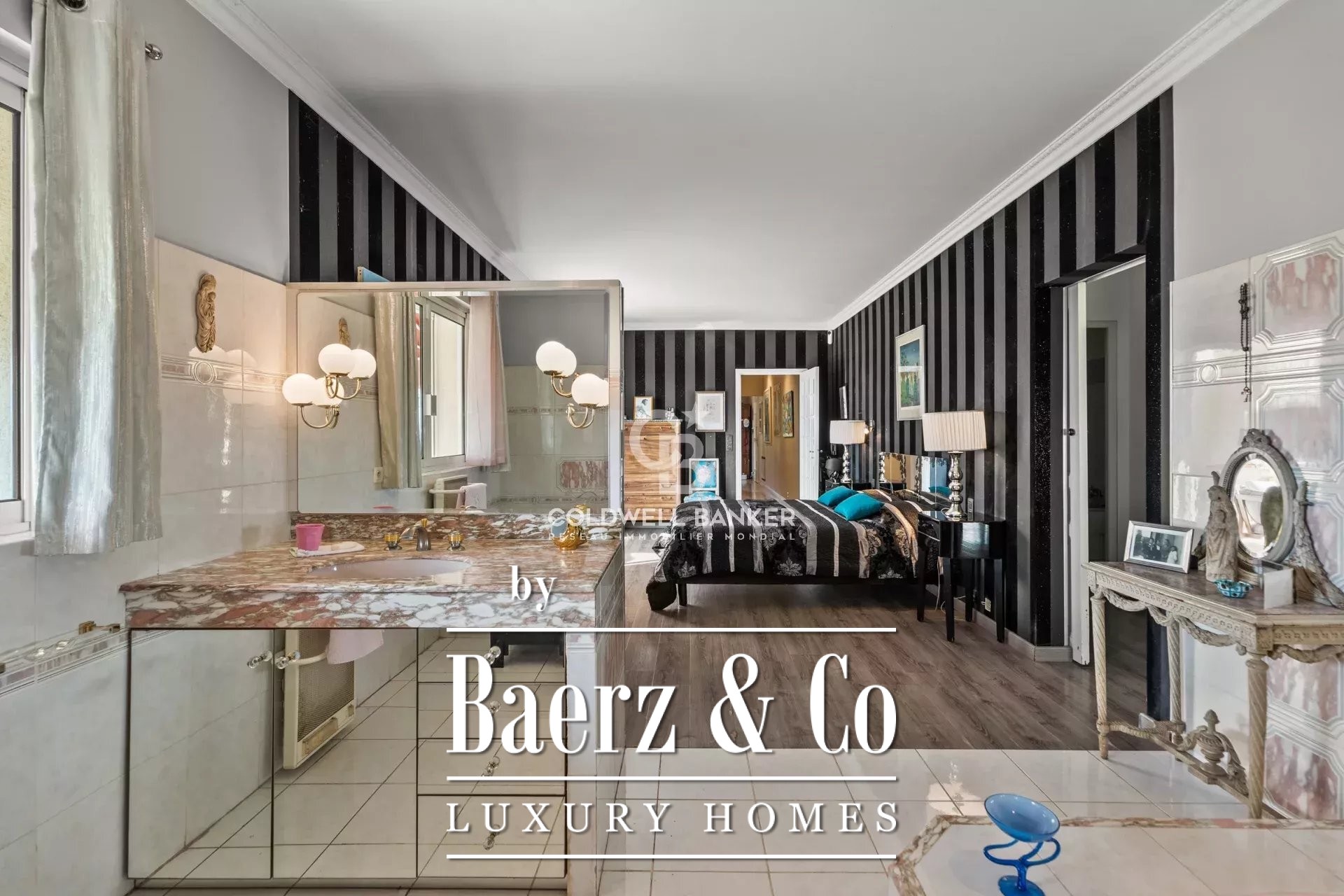Wide terraces spill out into the landscaped garden, anchored by a striking swimming pool. The 370 m² villa also features air-conditioning, a fireplace, double glazing, alarm and electric gate for security, and thoughtful amenities. A carport for four vehicles and a 60 m² enclosed garage, easily adaptable as a guest or caretaker’s residence, provide further autonomy. This luxury villa for sale in Mougins offers an understated sanctuary with sea views and enduring quality.