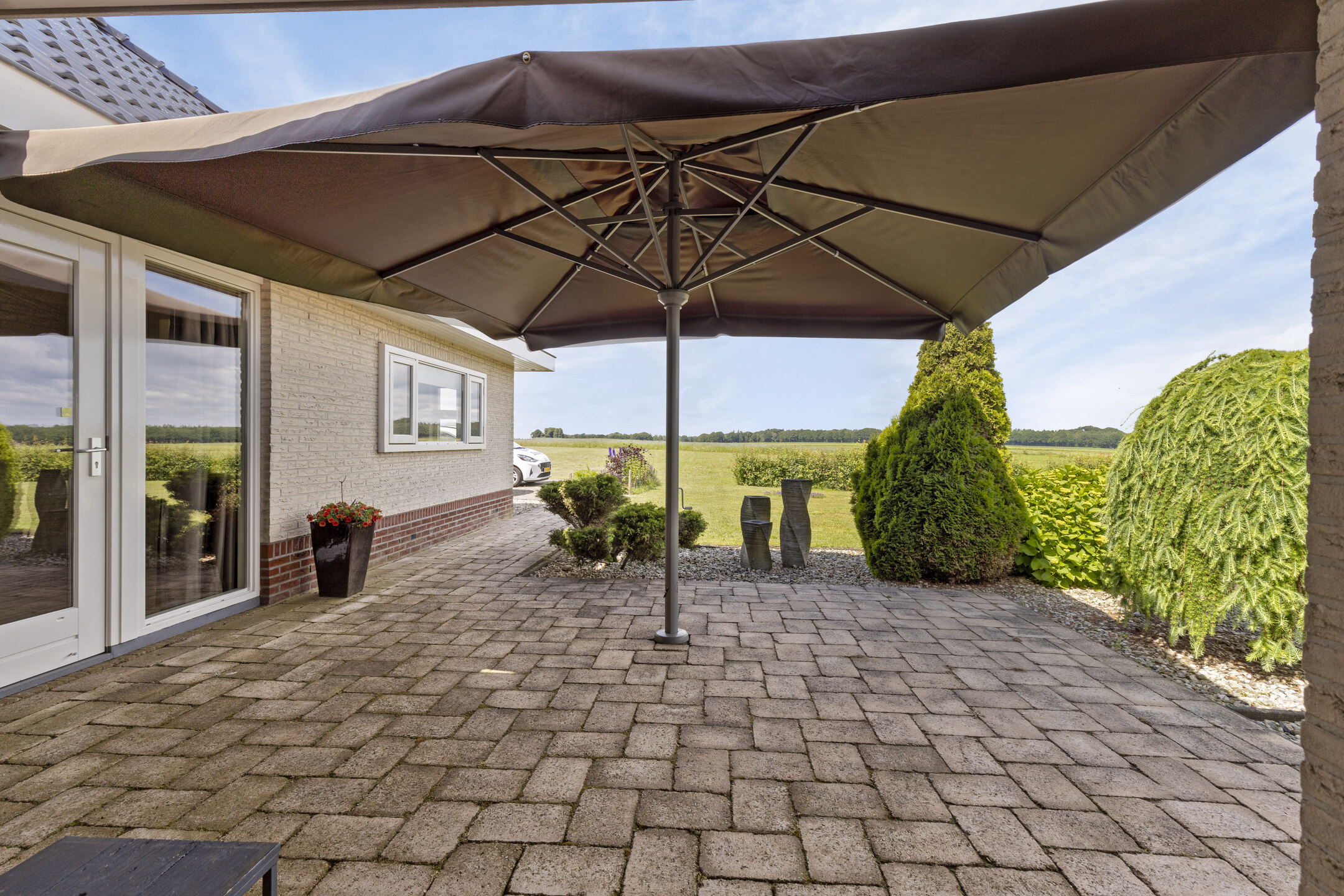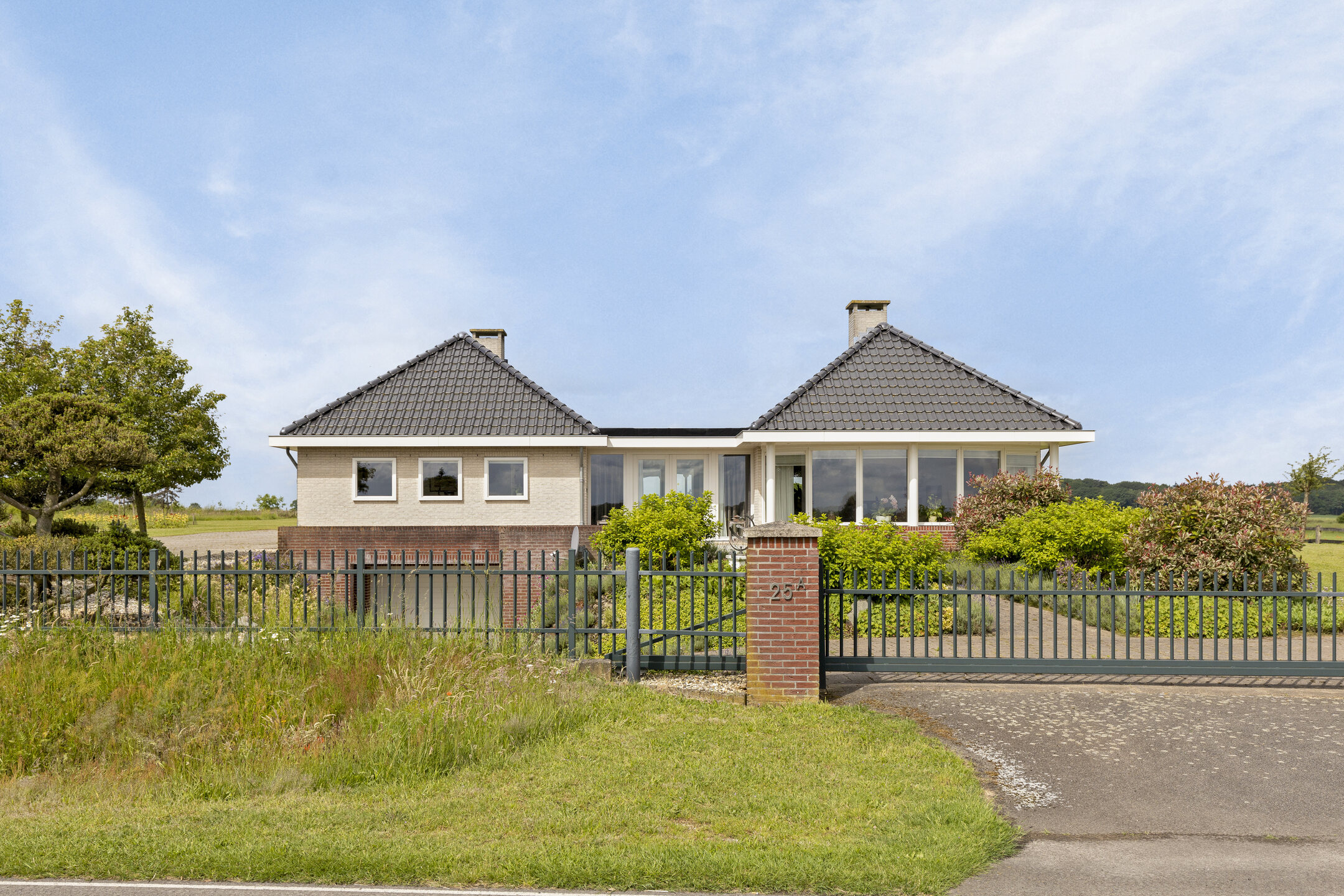 ... for there lies an impressive 1.2ha waiting for you. At the front, the plot is accessed by an electric gate, allowing you to drive straight into the garage. Surface parking is also possible, because the driveway has room for at least eight cars. There is also a charging station, so you always drive away with a full battery.