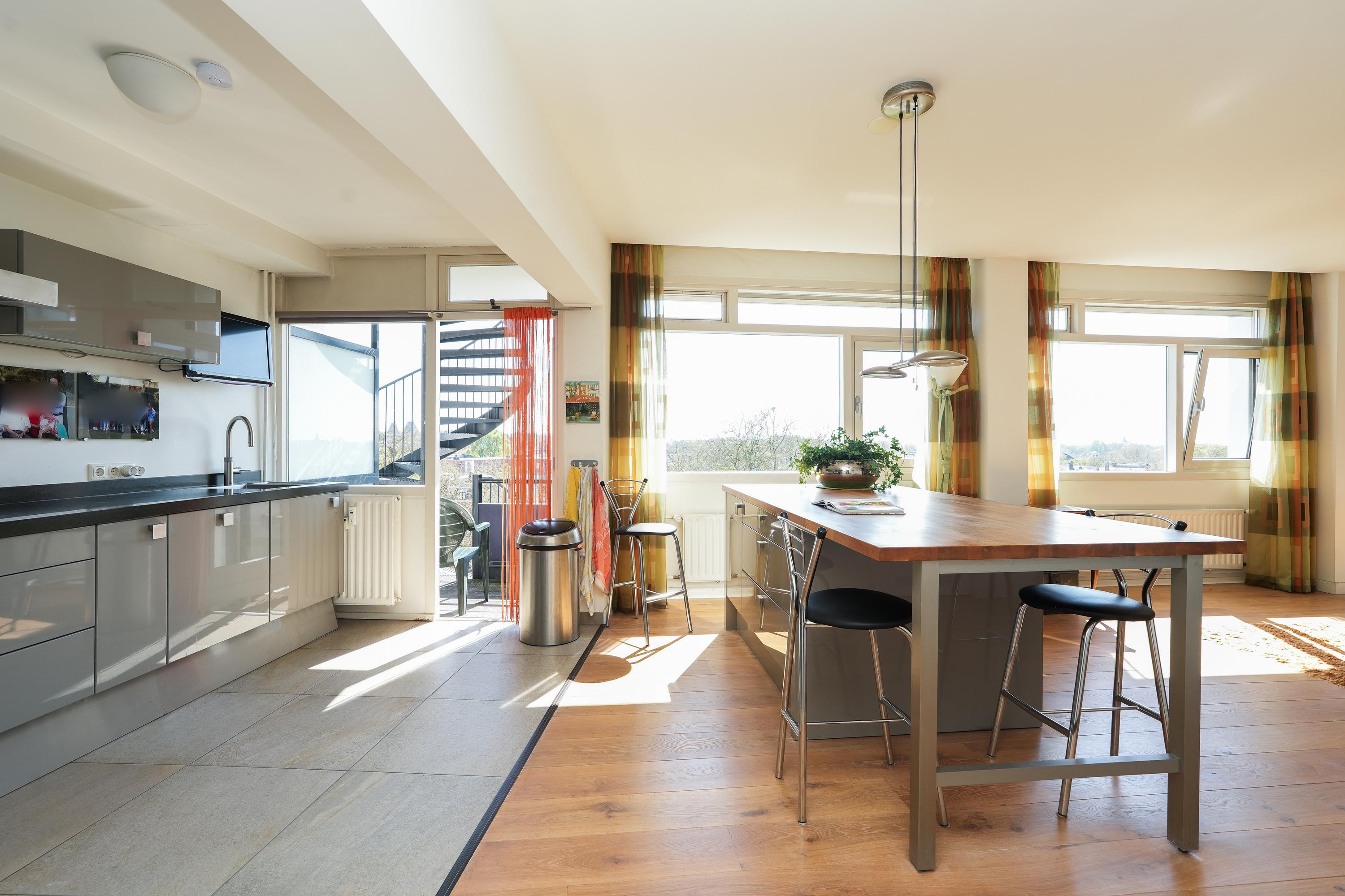 The kitchen is equipped with various built-in appliances and provides access to the first, south-facing balcony. Adjacent to the kitchen is an internal utility room offering additional storage and workspace. From the living room and the balcony there are beautiful views over the city of Nijmegen and Radboud University. A gas fireplace separates the dining area from the television/lounge area on the south-west side. The west-facing balcony offers lovely views towards the River Waal and the iconic Waal Bridge.