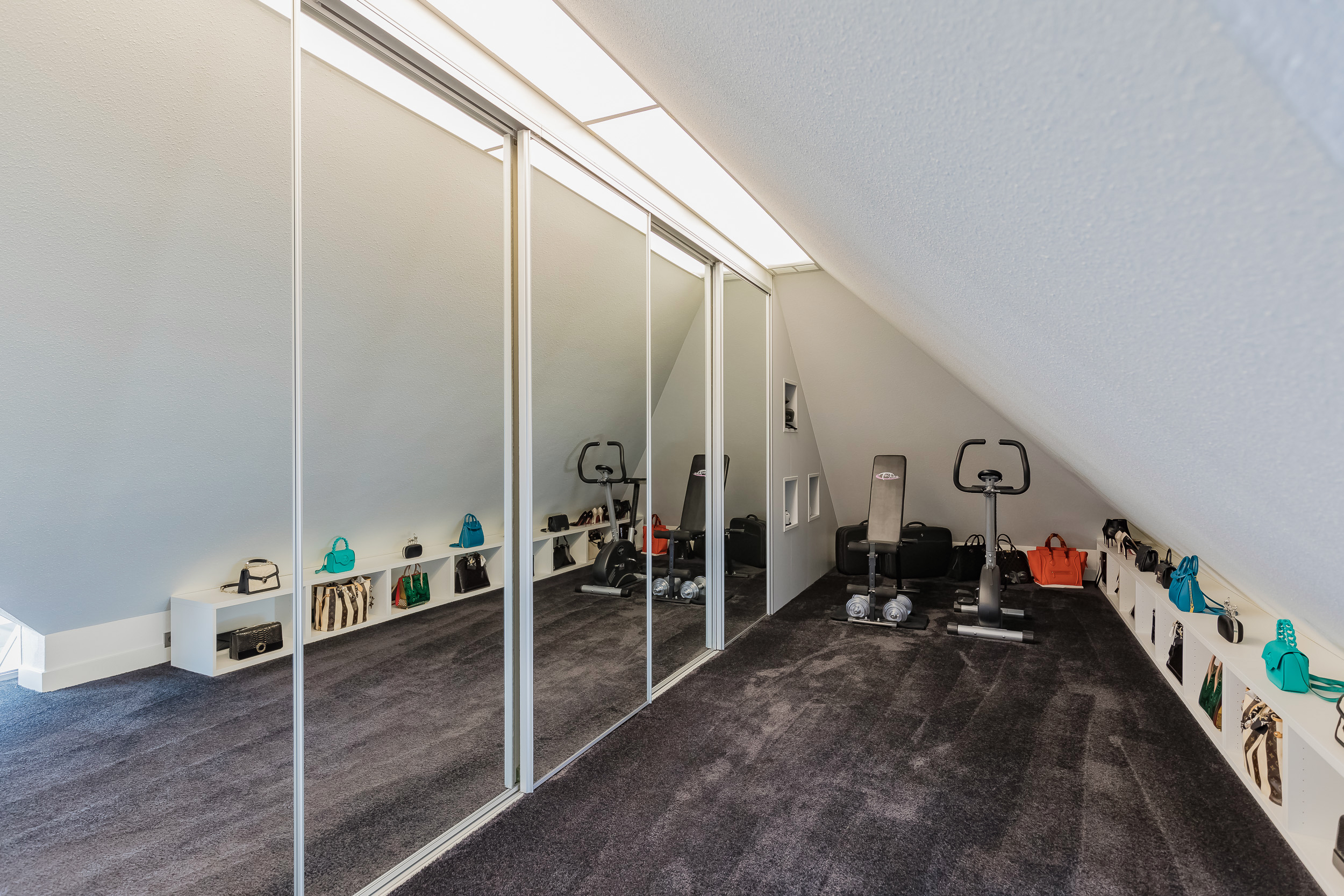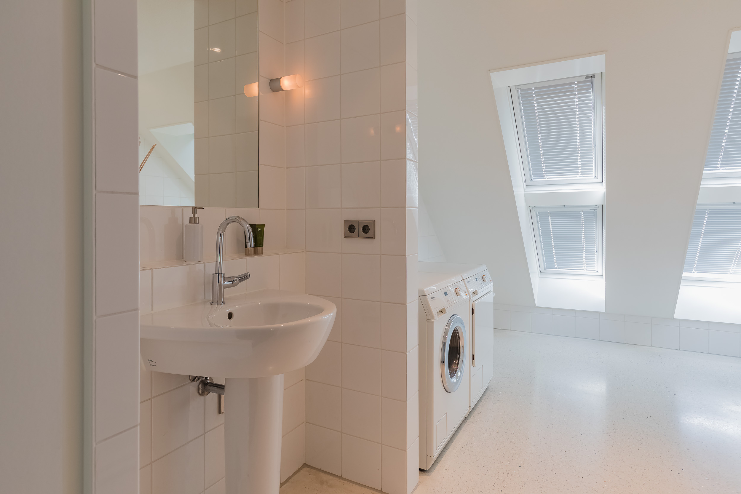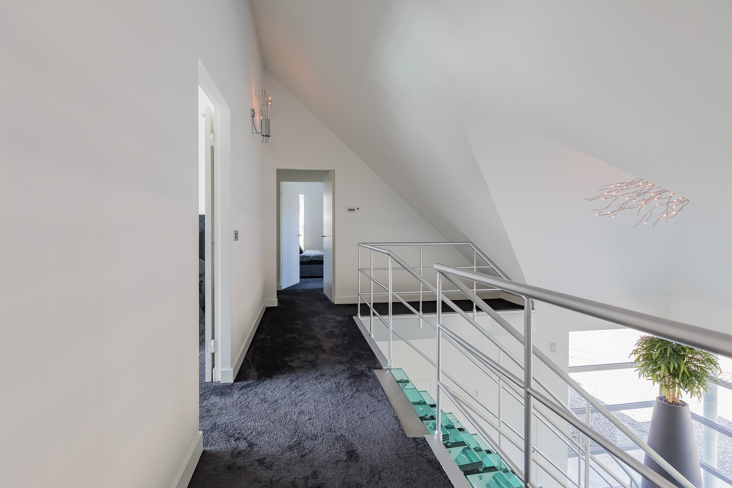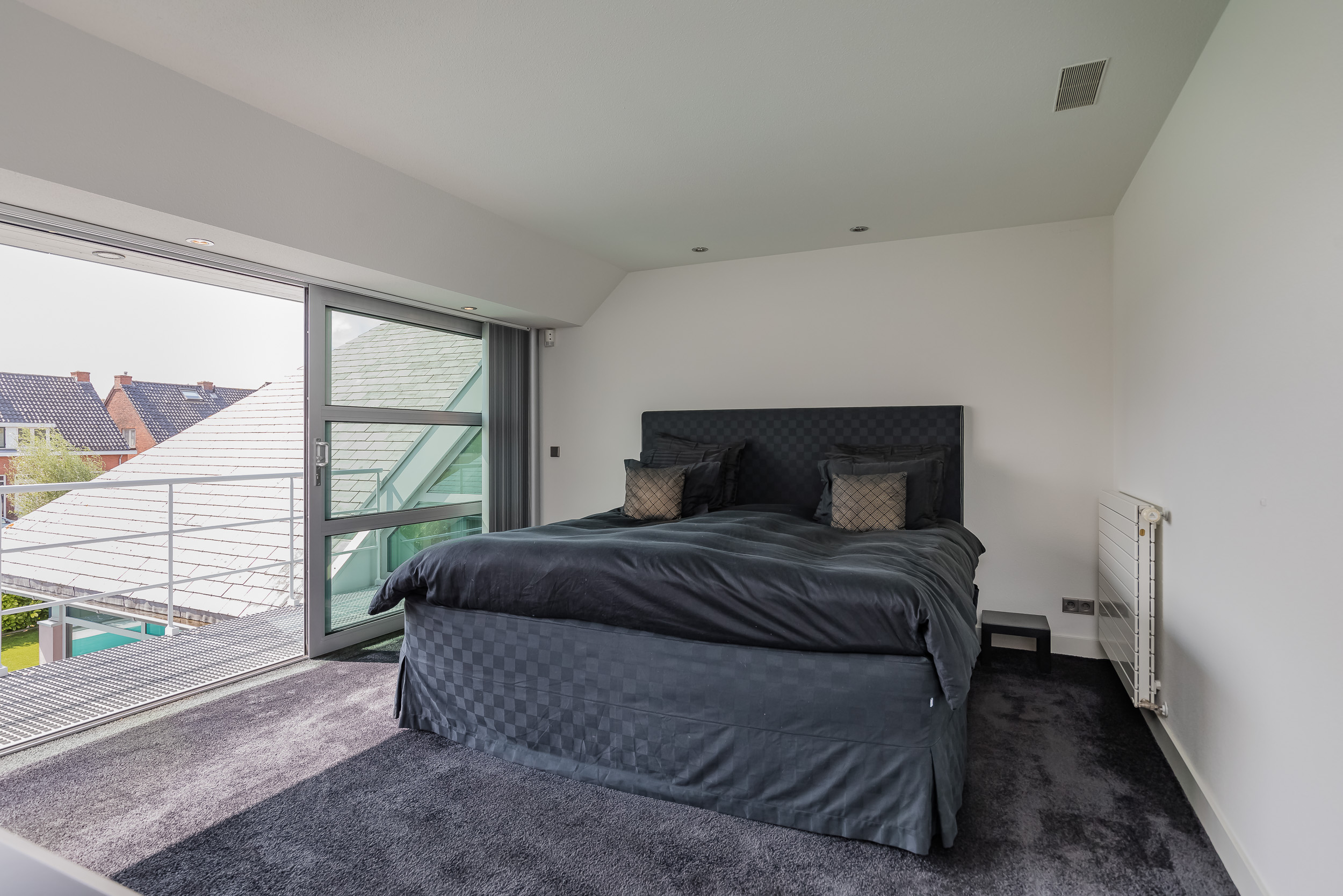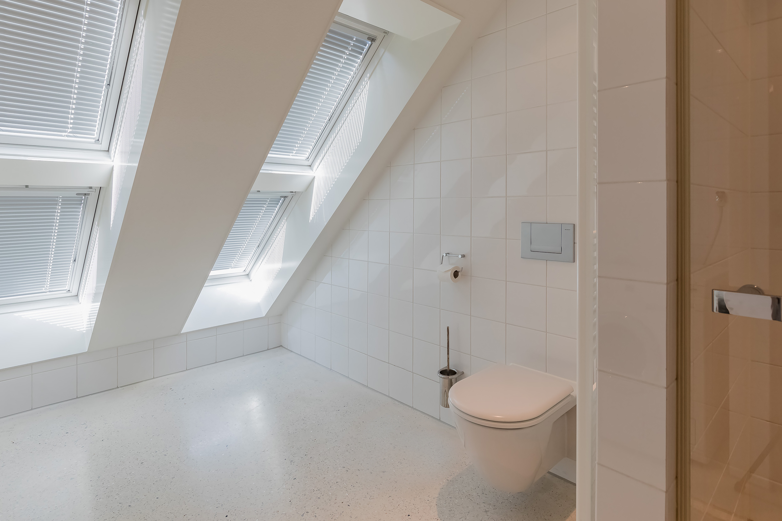 On this floor are 3 bedrooms, 2 bathrooms and a large storage room. The very generous master bedroom has its own luxurious bathroom and a spacious dressing room. The balcony can only be accessed from this room. 20 Skylights provide extra light and also here the symmetry is continued.