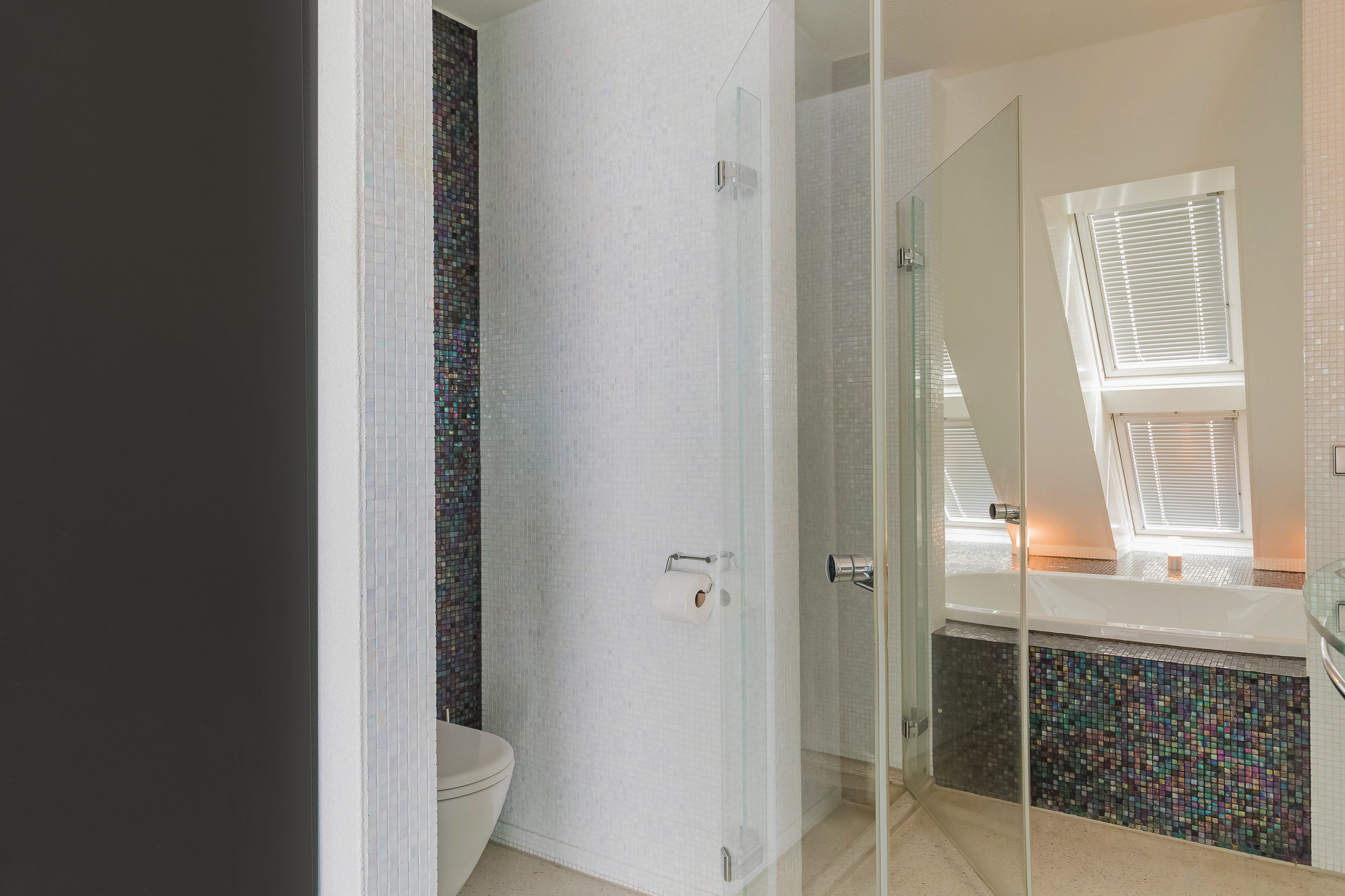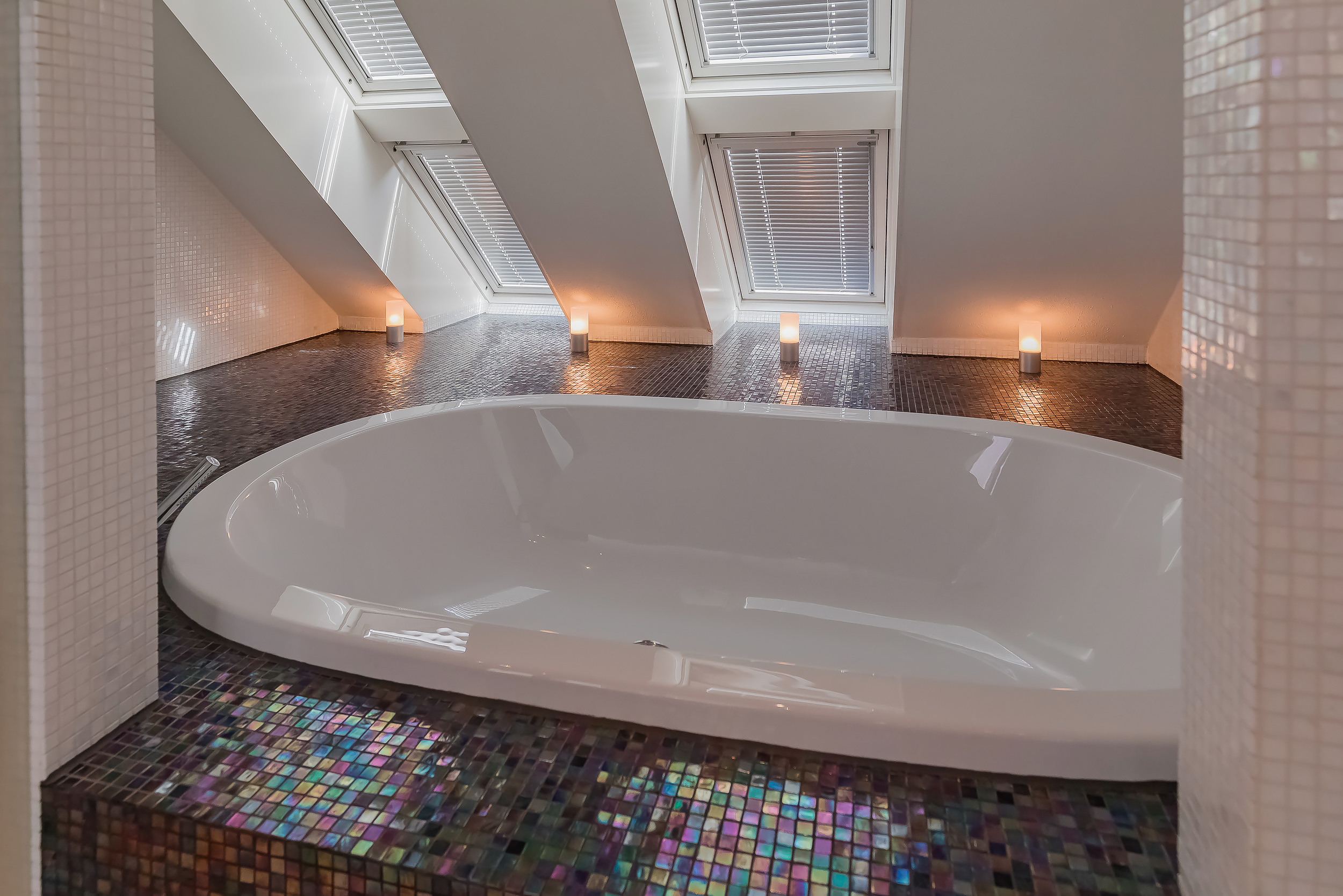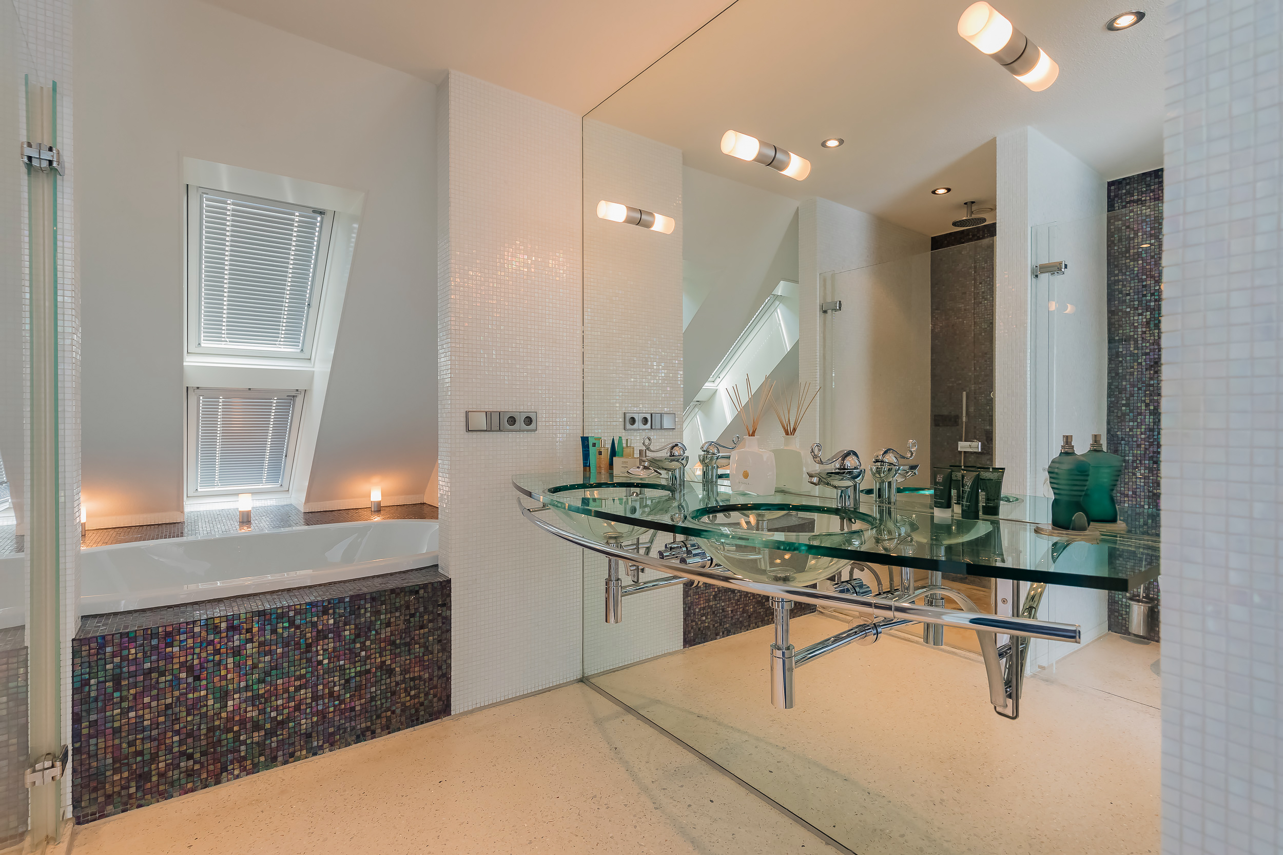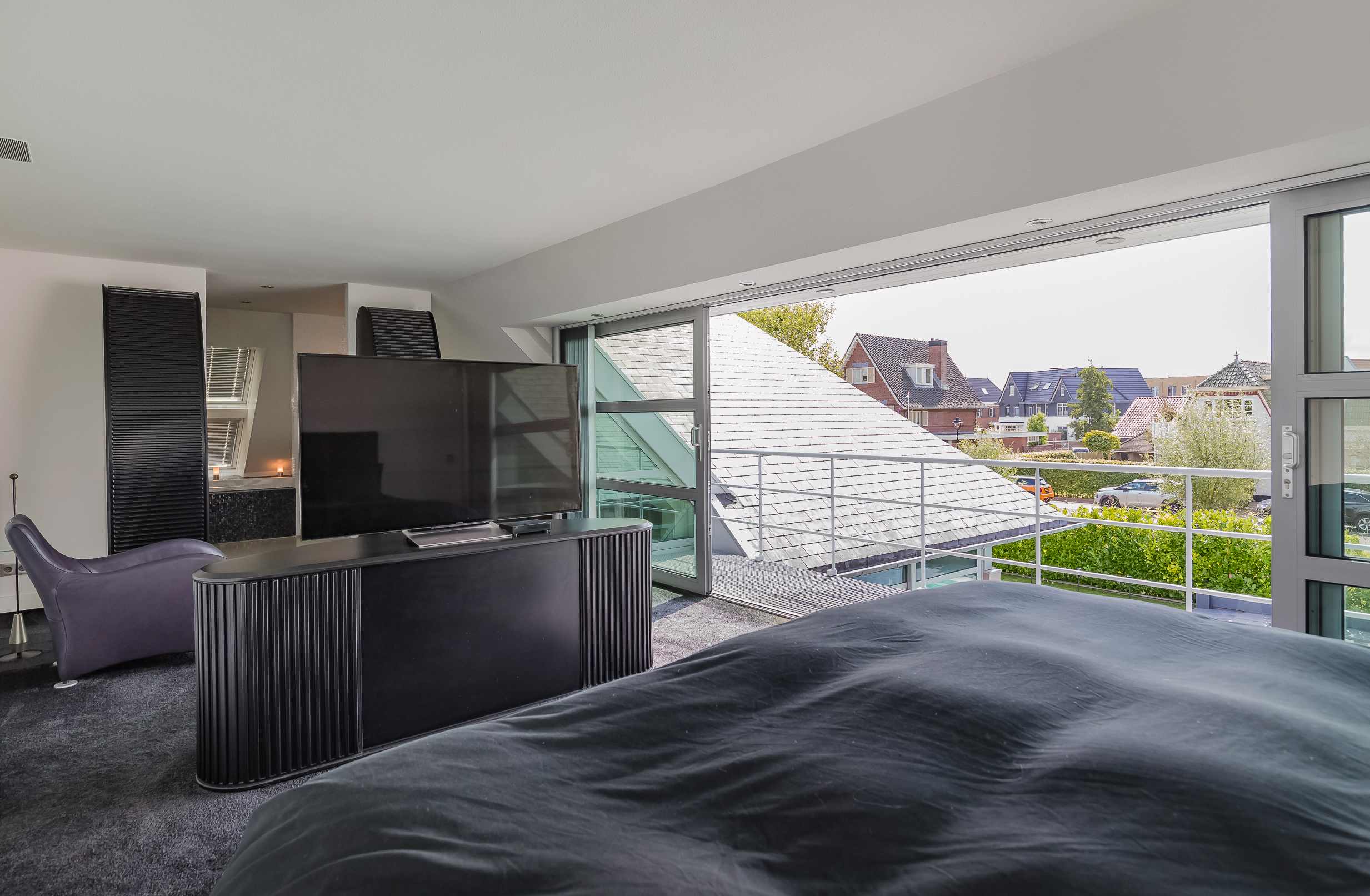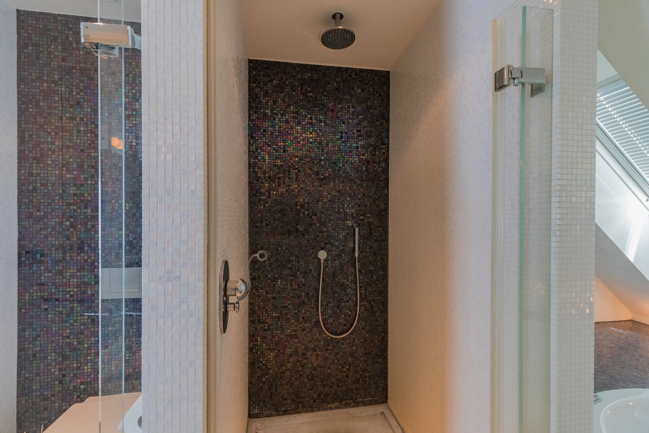 On this floor are 3 bedrooms, 2 bathrooms and a large storage room. The very generous master bedroom has its own luxurious bathroom and a spacious dressing room. The balcony can only be accessed from this room. 20 Skylights provide extra light and also here the symmetry is continued.