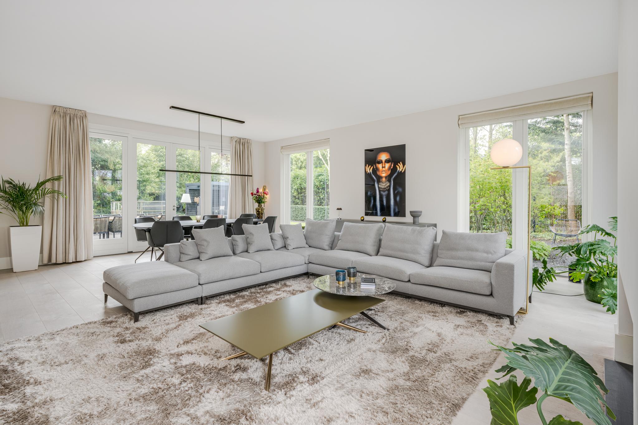 The modern kitchen is equipped with all desirable equipment, with the cooking island having a double sink, dishwasher, refrigerator and a gas and induction hob. The high wall provides space for the steam oven, combination microwave oven and coffee machine. In addition to cooking, the kitchen offers space for a very spacious dining table with a cozy gas fireplace. The double doors from the kitchen give access to the spacious terrace. Next to the kitchen is the utility room, equipped with a sink, plenty of cupboard space and a door to the garden.