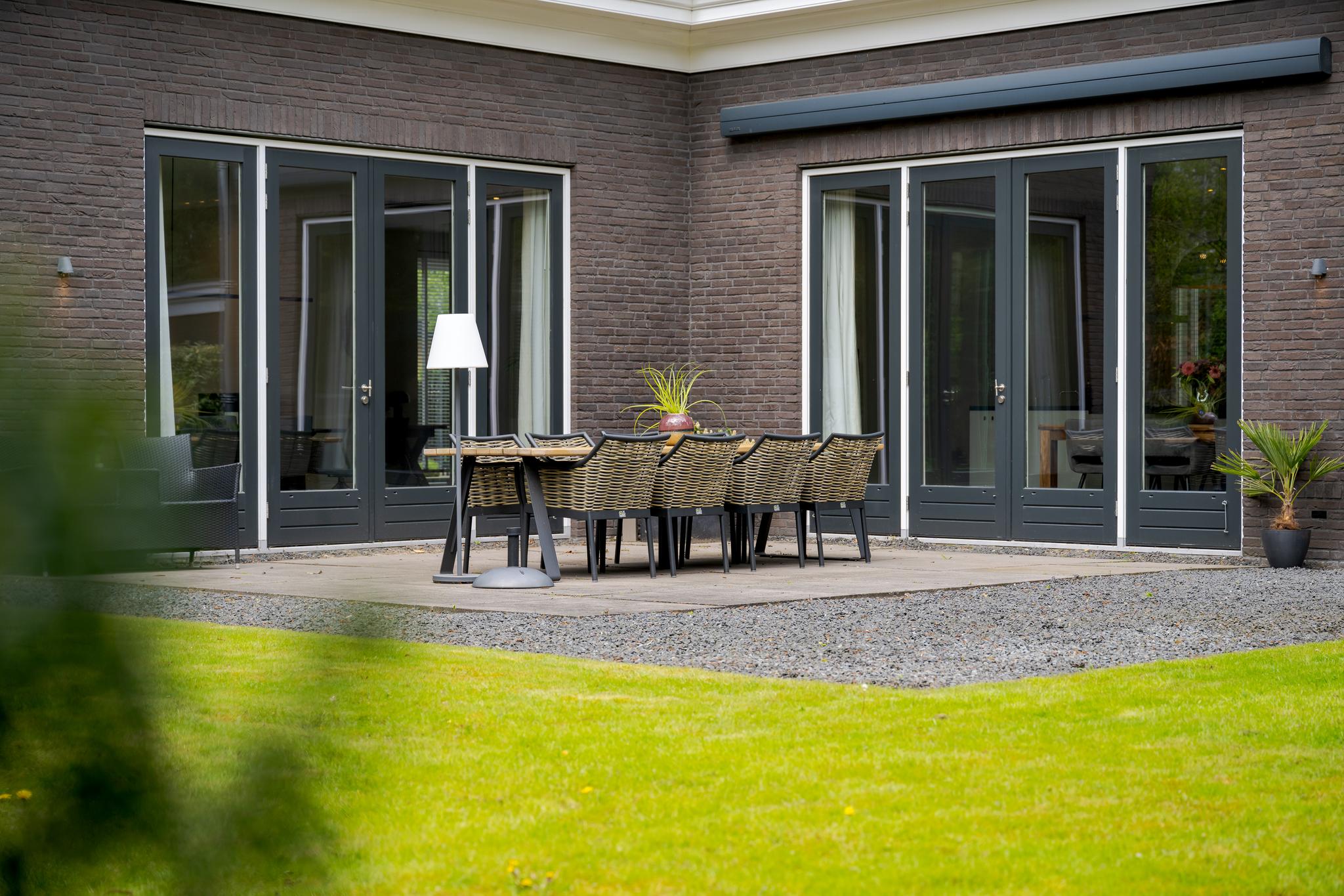 The garden has a very favorable sunny position. The sun shines on the plot from early in the morning until late in the evening. At the back of the garden is a seating area with a canopy and outdoor kitchen, a wonderfully sheltered place to have a BBQ or drink a nice glass of wine in the summer. The large terrace adjacent to the lawn faces south and various seating areas have been created around the house, so that you can enjoy the sun or shade at any time of the day.