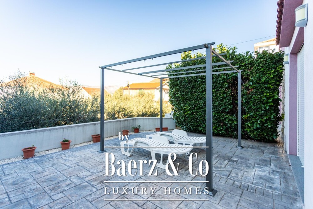 Townhouse Okrug stands a few steps from the Adriatic in Croatia, set amid a plot of 879 m². This property spans 282 m², organized across two floors designed for both functionality and comfort. The ground floor offers two distinct two-bedroom apartments of 59 m² each, each featuring private terraces, open-plan kitchen and living zones, and a dedicated bathroom. Both have a proven history of consistent tourist rental returns, quietly affirming their sought-after position.