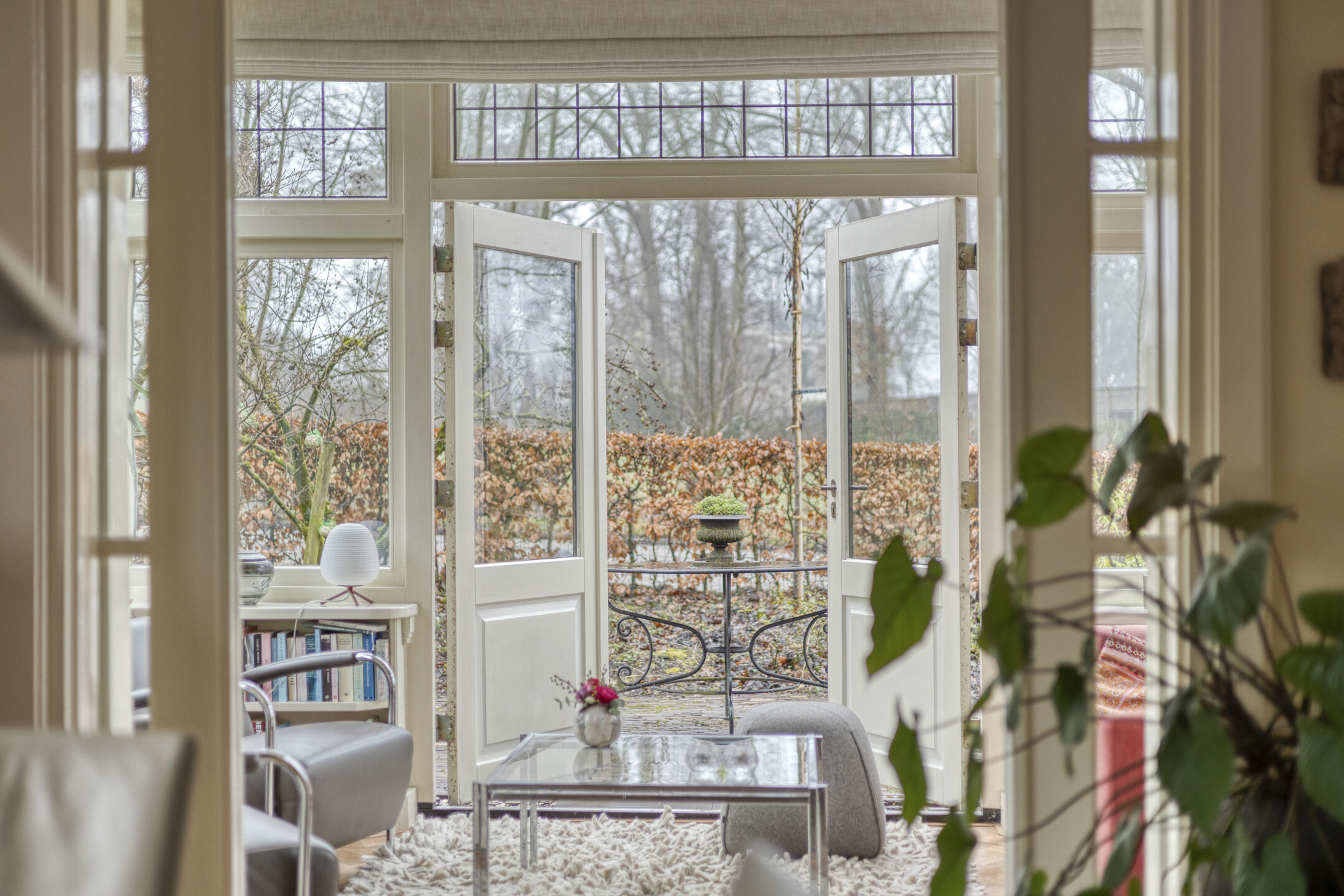 De ruime woonkamer heeft door de vele raampartijen en de karakteristieke erker een prachtige lichtinval. Vanuit de aangrenzende serre is er blijvend vrij uitzicht over het weiland. Zowel vanuit de woonkamer als vanuit de serre openen openslaande tuindeuren naar de royale tuin.