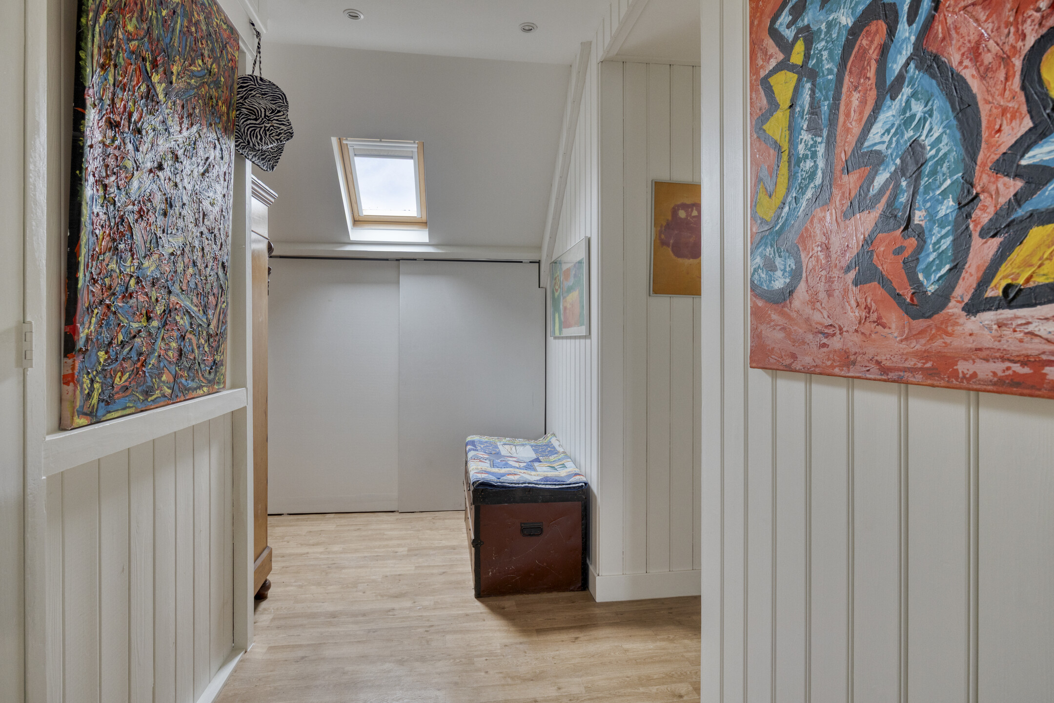 Tweede verdieping: de bordestrap geeft vervolgens toegang tot een mooie sfeervolle tweede verdieping met twee slaapkamers, een badkamer met wastafelmeubel en douche. Daarnaast is er dankzij de knieschotten op de slaapkamers en de overloop voldoende opbergruimte.