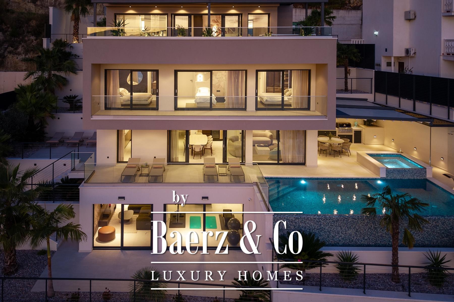 Throughout the villa, underfloor heating, inverter air conditioning, and advanced insulation deliver comfort and efficiency. High-quality stone, anthracite aluminium, and triple-glazed glass affirm a commitment to construction detail and sound privacy. The top floor hosts a secluded suite with a private terrace, jacuzzi, and movable pergola.