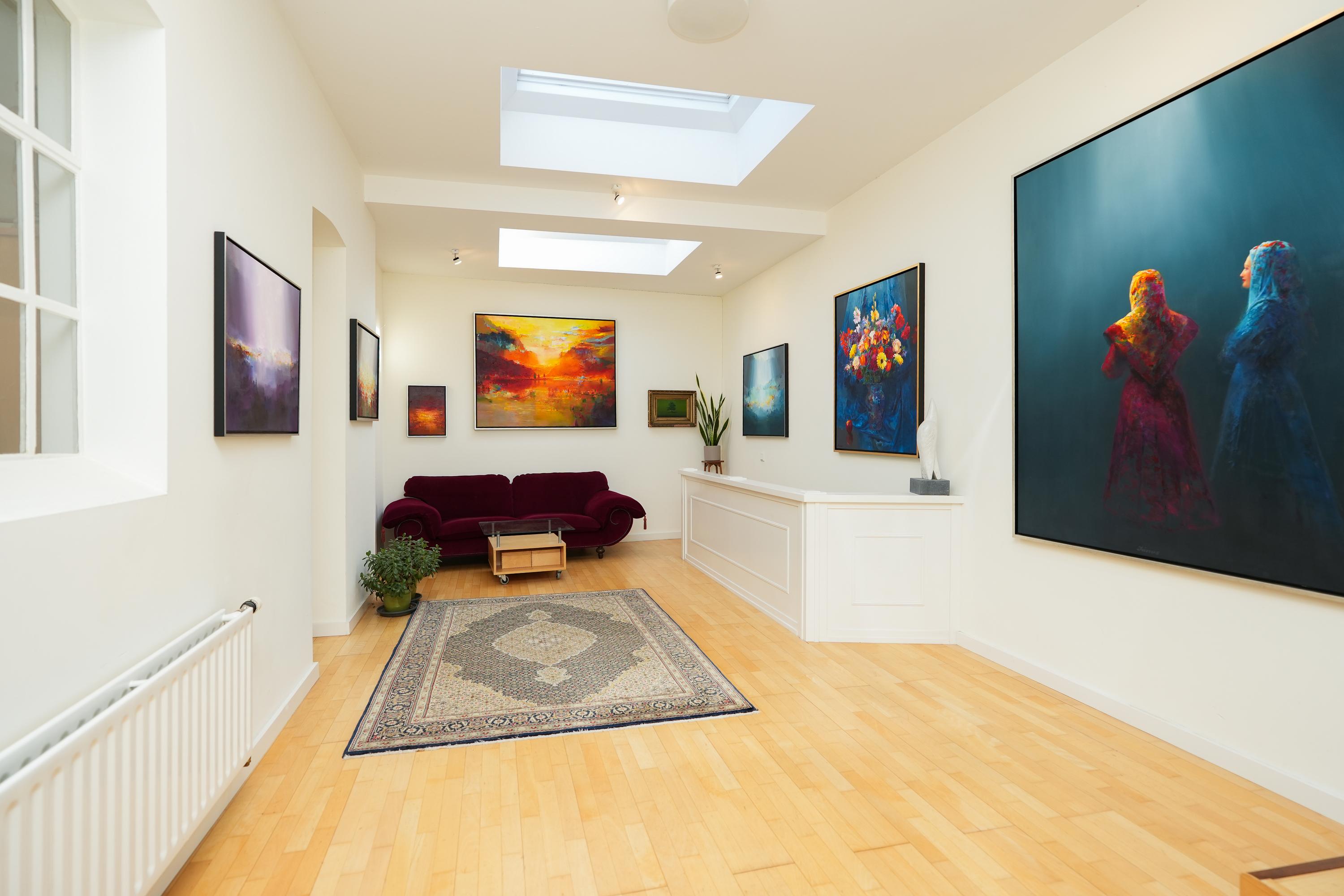 Entering the impressive hallway, elegant spatial connections unfold between the kitchen with dining area, the living room, and a private library. The gallery, accessible both from the kitchen and a separate exterior entrance, leads into the sunlit atelier, making it a tranquil workspace with panoramic rural vistas. Upstairs, a broad landing opens to the main bedroom, a comfortable bathroom, an additional smaller bedroom, and practical attic storage. In total, the house offers 287 m² of living area on a plot of 2,445 m².