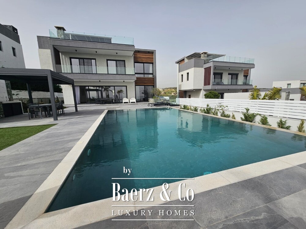 The primary living areas are oriented for natural light, while the villa’s layout accommodates four bedrooms, three bathrooms, and two guest WCs. Premium materials include tiled floors and aluminium double-glazed, energy-efficient windows. Underfloor heating, air conditioning, a ventilation system, and sound and thermal insulation ensure year-round comfort. An internal elevator and staircase connect all floors, emphasizing convenience and accessibility.