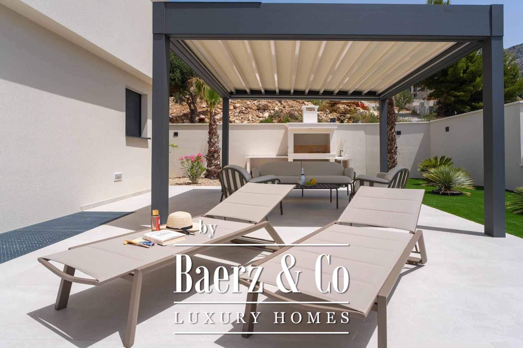 The ground floor flows seamlessly from its open-plan living, dining, and kitchen space onto two partially covered terraces, one of which hosts an outdoor summer kitchen, while a large sundeck introduces the 36 m² infinity pool with massage waterfall. On the lower level, a fun room, sauna, and mini kitchen create a setting for both relaxation and entertaining, complemented by technical rooms and a double garage. The residence reflects high energy efficiency, with solar hot water, integrated LED stone staircase, and advanced filtration systems.