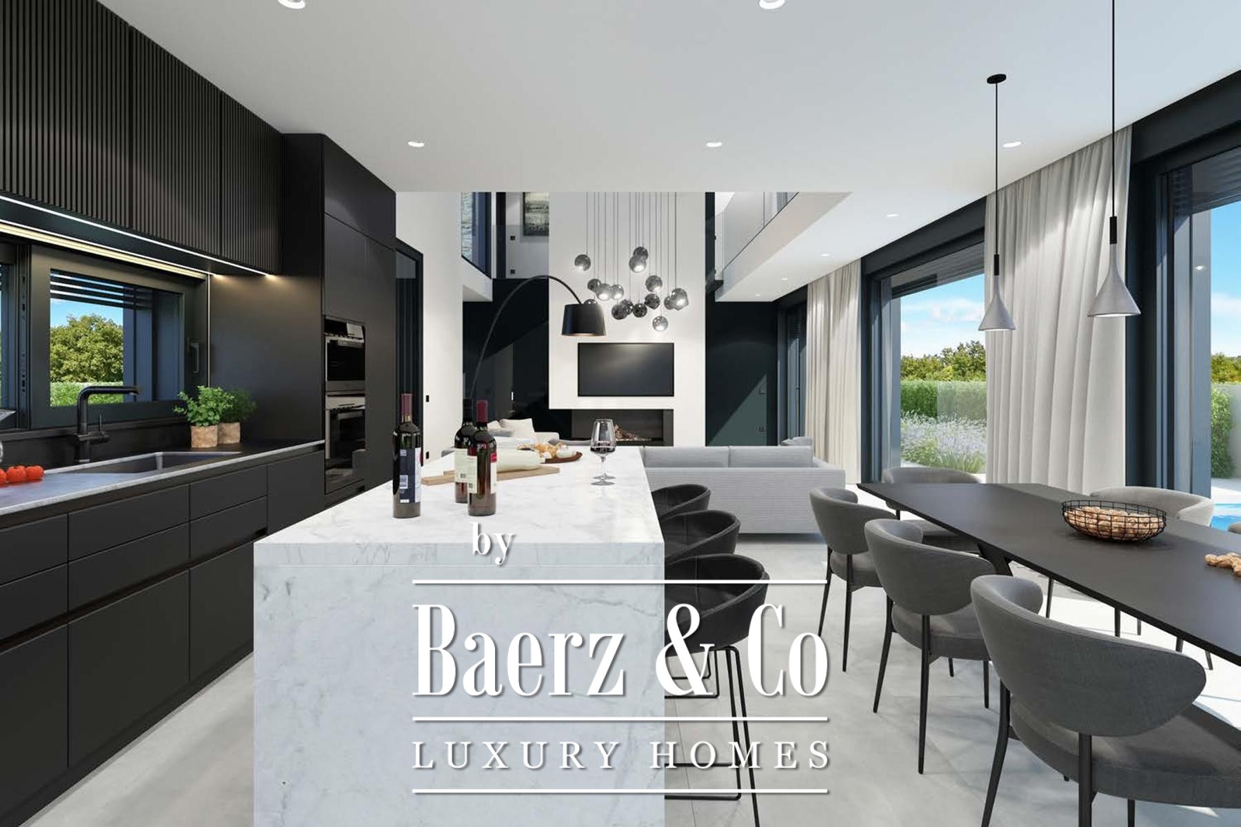 The first floor houses three additional bedrooms, each with private bathrooms, walk-in wardrobes, and direct access to spacious terraces overlooking the sea and surrounding landscape. Outdoors, a heated saltwater swimming pool and sunbathing area elevate the sense of relaxation. Picturesque wine country, renowned restaurants, and active leisure facilities enrich the local experience. The villa's purchase price reflects the completed construction stage without furniture, leaving scope for the future owner to tailor the interiors. VAT is included in the listed price with no real estate transfer tax for the buyer.