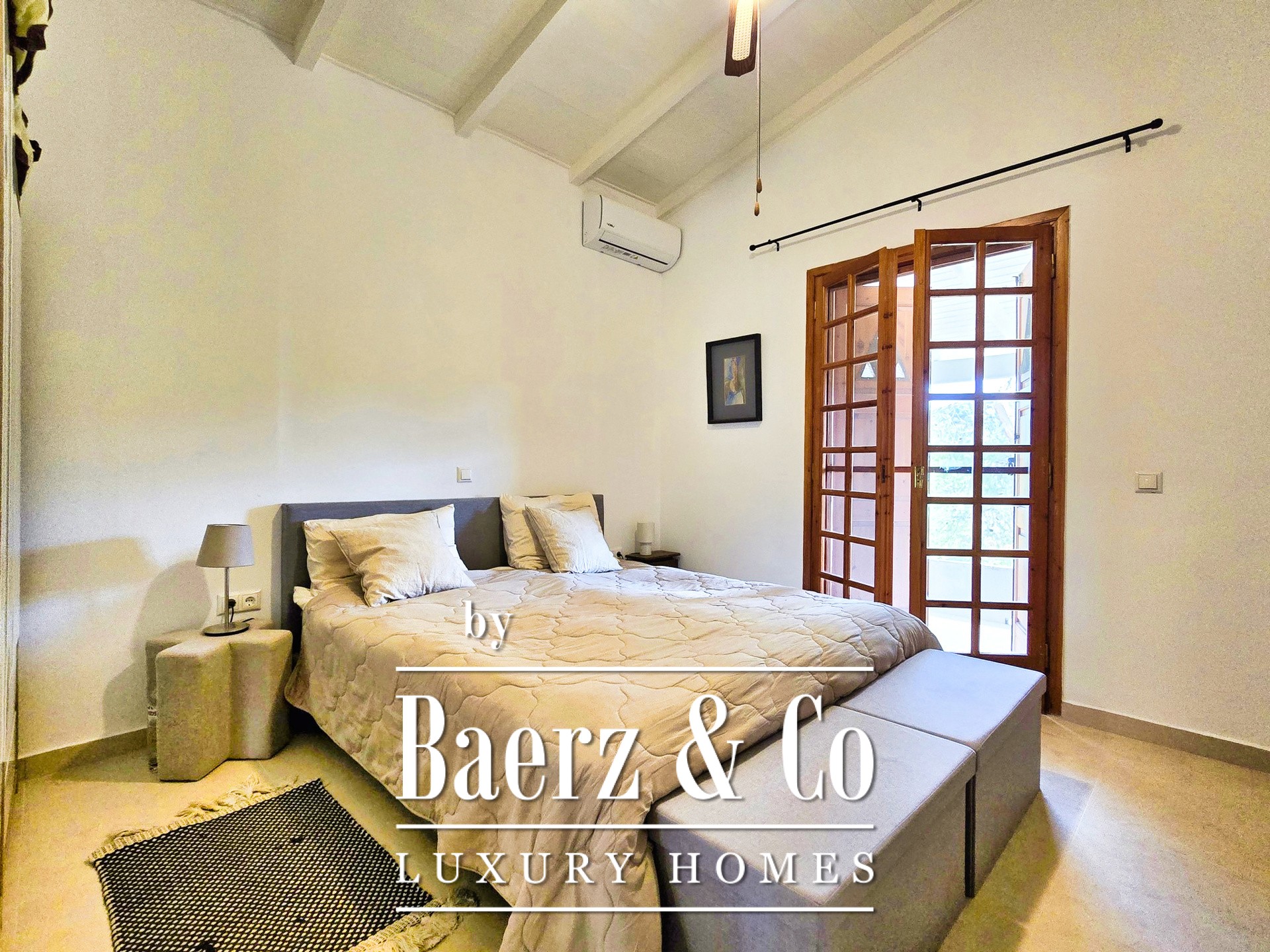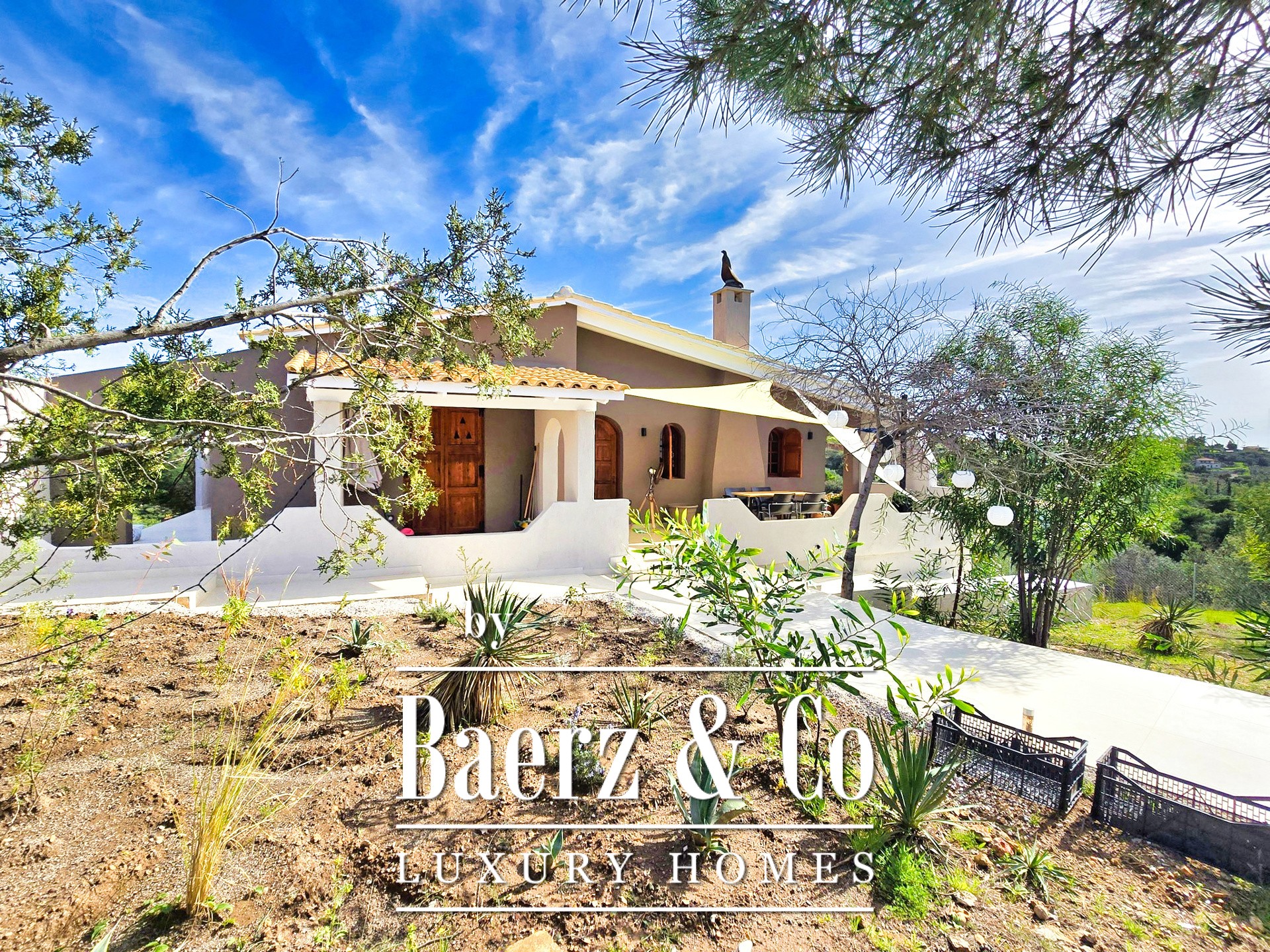 Detached house Portocheli presents a rare opportunity to experience refined living amidst natural beauty. This independent residence, with a total living area of 126 m², is set within a 2,100 m² fenced and partially landscaped plot. The house stands elevated on a quiet hillside, surrounded by elegant country homes and enriched by panoramic views of the natural landscape and the sea.