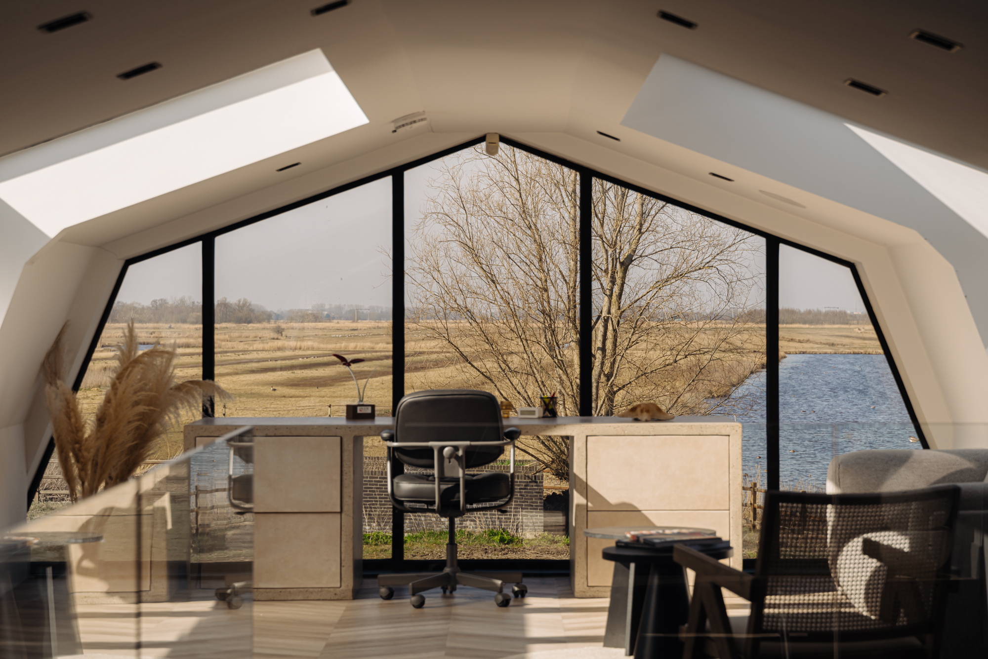 The beautiful detached guest house is a highly versatile space, offering stunning panoramic views of the water and surrounding fields. A central open atrium with a staircase connects the two floors. Its potential uses are endless.