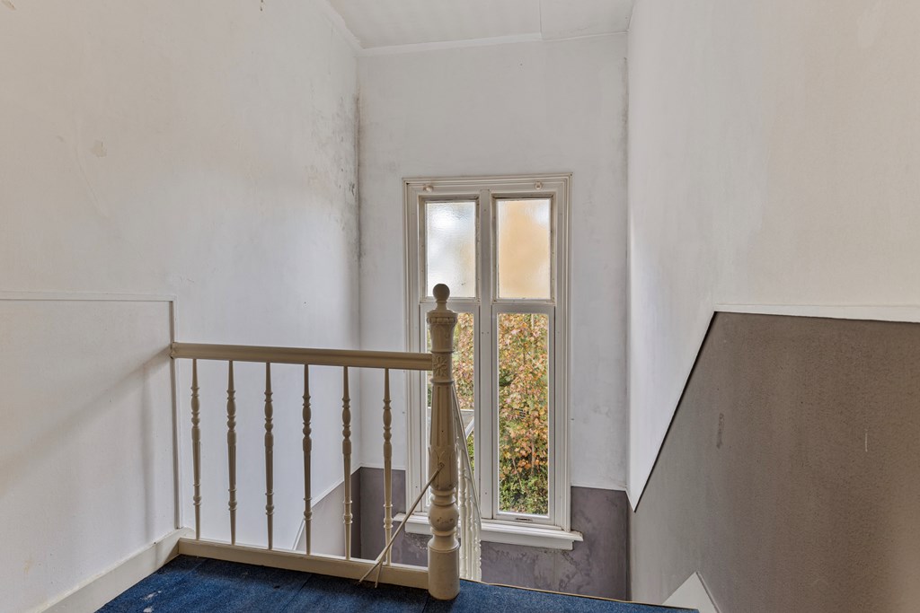 The staircase from the hallway leads to the first floor, where you’ll find three spacious bedrooms and a bathroom — all with plenty of daylight and potential for modernization and redesign.