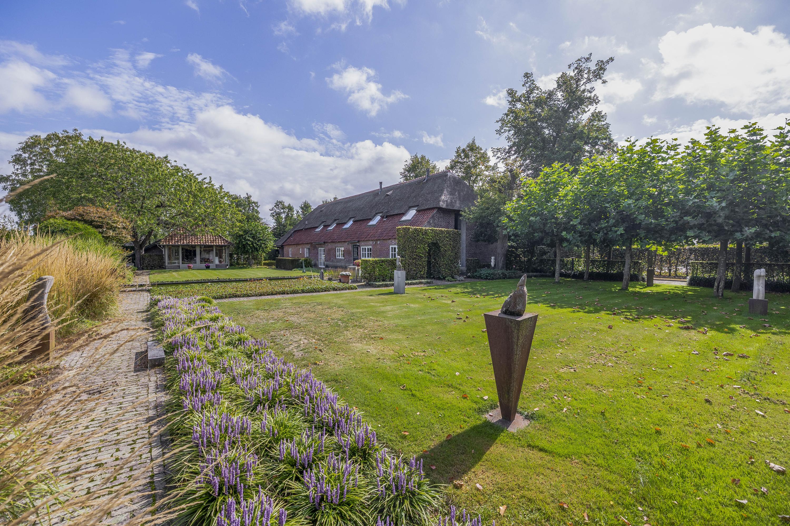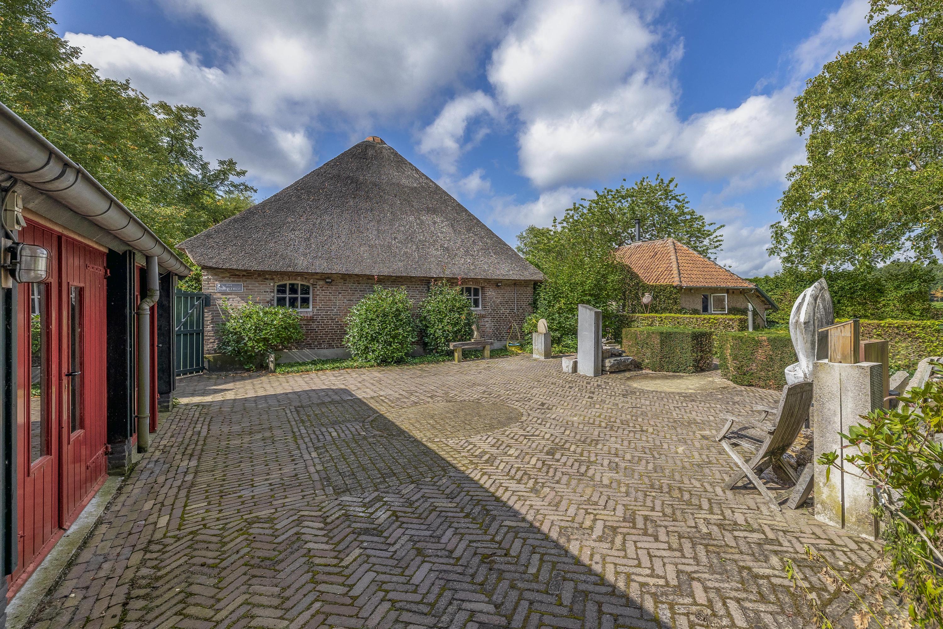 Behind the house and on the sides is a beautifully landscaped garden. On the left side is a nice, spacious area with a lawn, plant borders, old baked clinker paving, and various beech hedges. At the rear, you can enjoy a beautiful view, a large pond (with biological filter), a spacious lawn, plant borders, and mature vegetation. The garden is well laid out and well maintained. There is a double driveway on the right side of the property. The garden even offers the possibility of keeping small animals. There is also a section of the garden with a “lovers' lane.” To the left of the house is a landscaped jeu-de-boules court.