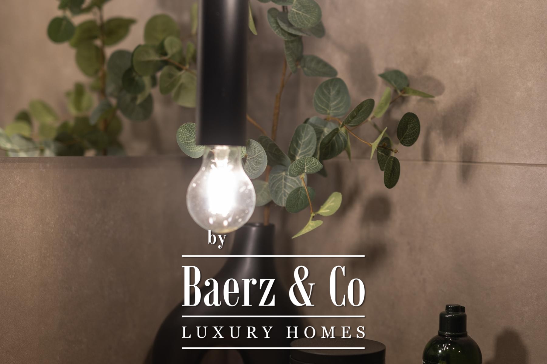 The interiors are shaped by a refined use of warm beige and anthracite, highlighted by gold details and custom lighting. Italian furnishings, large-format porcelain tiles, and matte black Veneta Cucine kitchens with sophisticated stone-marble backsplashes set an elevated tone. Frosted glass partitions, wooden wall slats with LED accents, and designer brass lighting complete the ambience.
