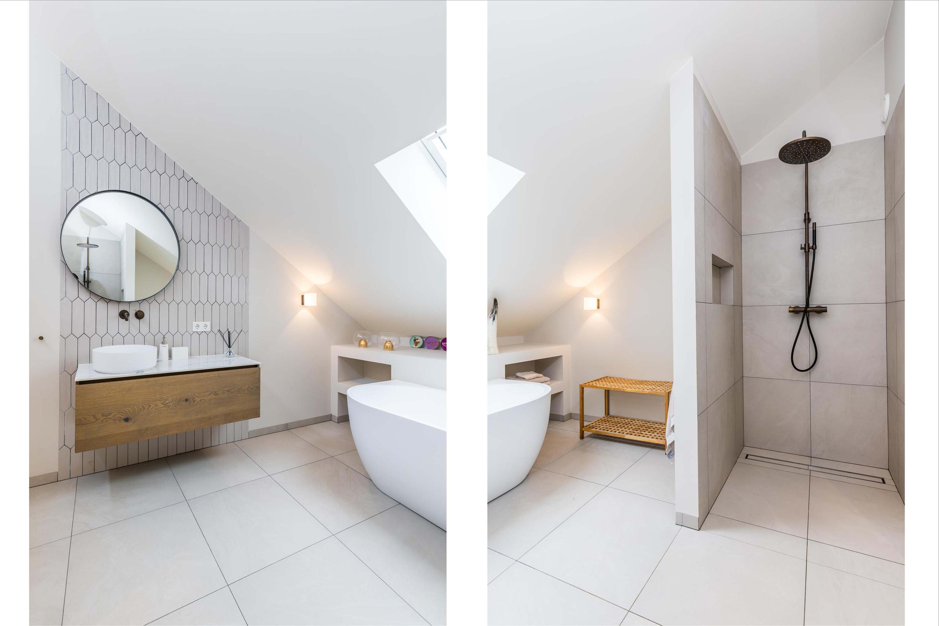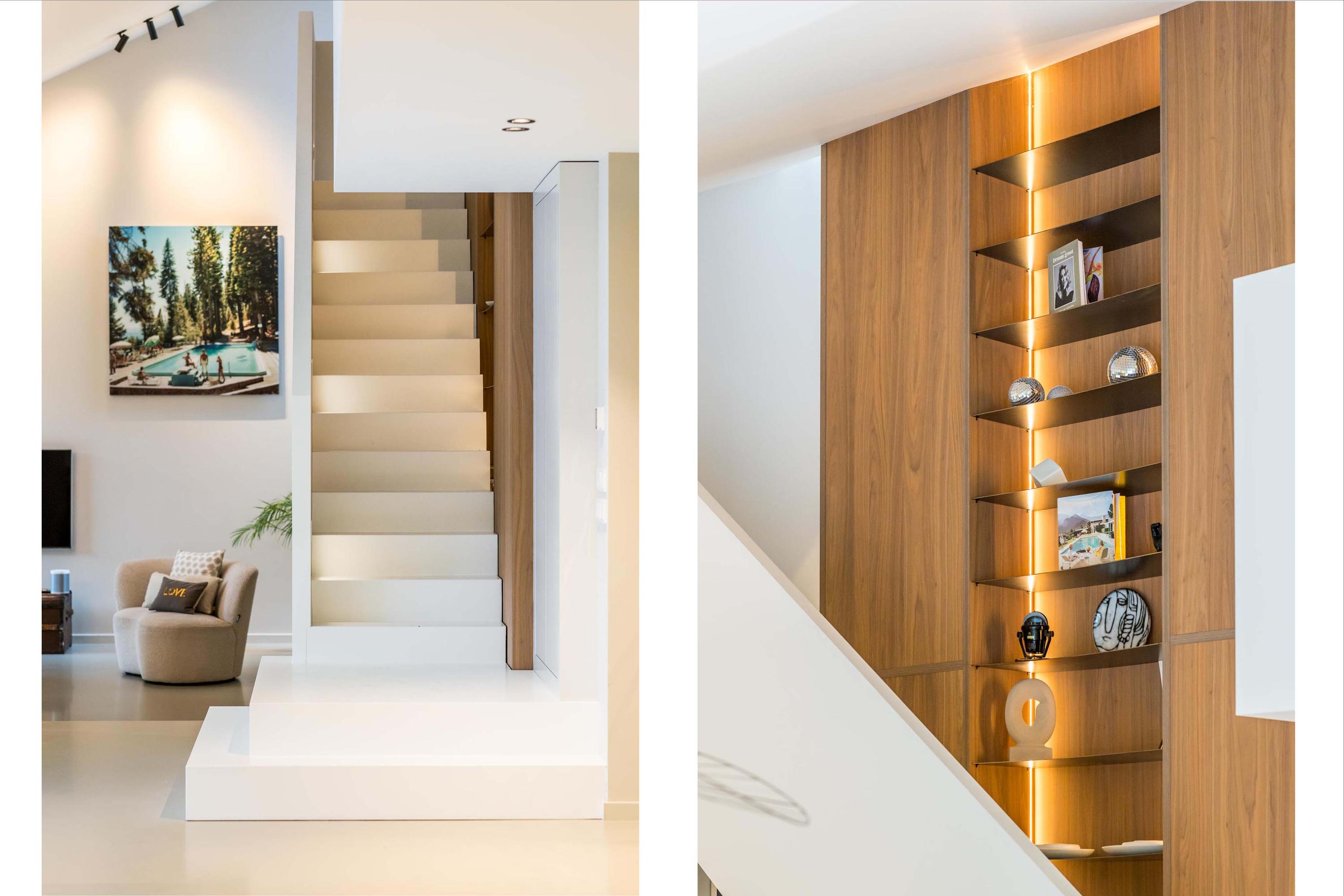 Spatial clarity is expressed through the garden-facing kitchen and living room, anchored by a sleek cooking island and fireplace, with sliding doors that open the space to sunlight and nature. Upstairs, the mezzanine connects four bedrooms, several with air conditioning and bespoke vanities, and a wood-burning fireplace in one suite.
