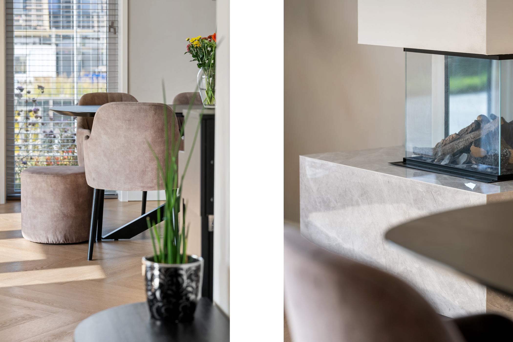 The bright and spacious living room is located at the rear of the house and includes a modern electric fireplace. At the front is the generous open-plan kitchen with a stylish cooking island.