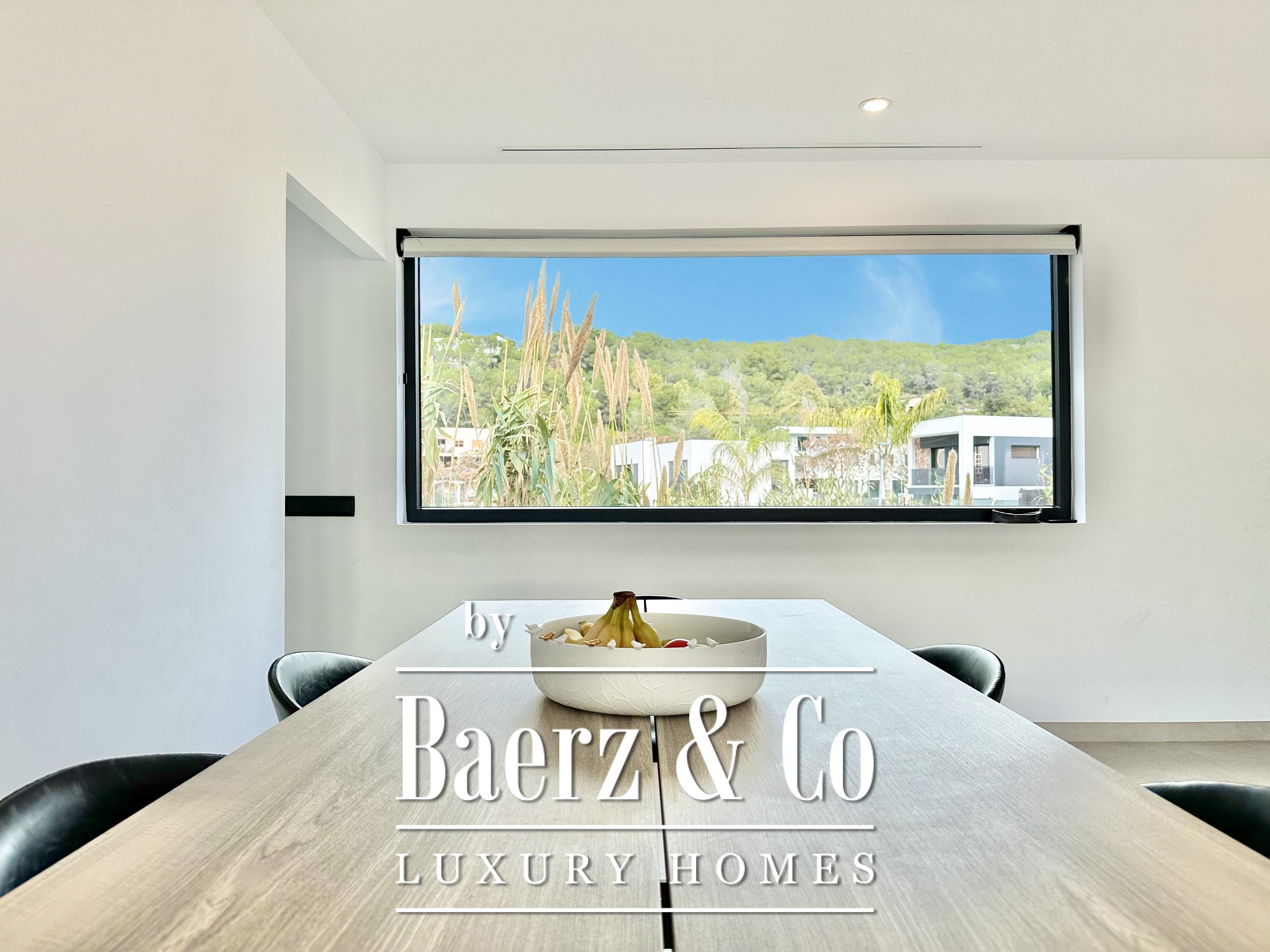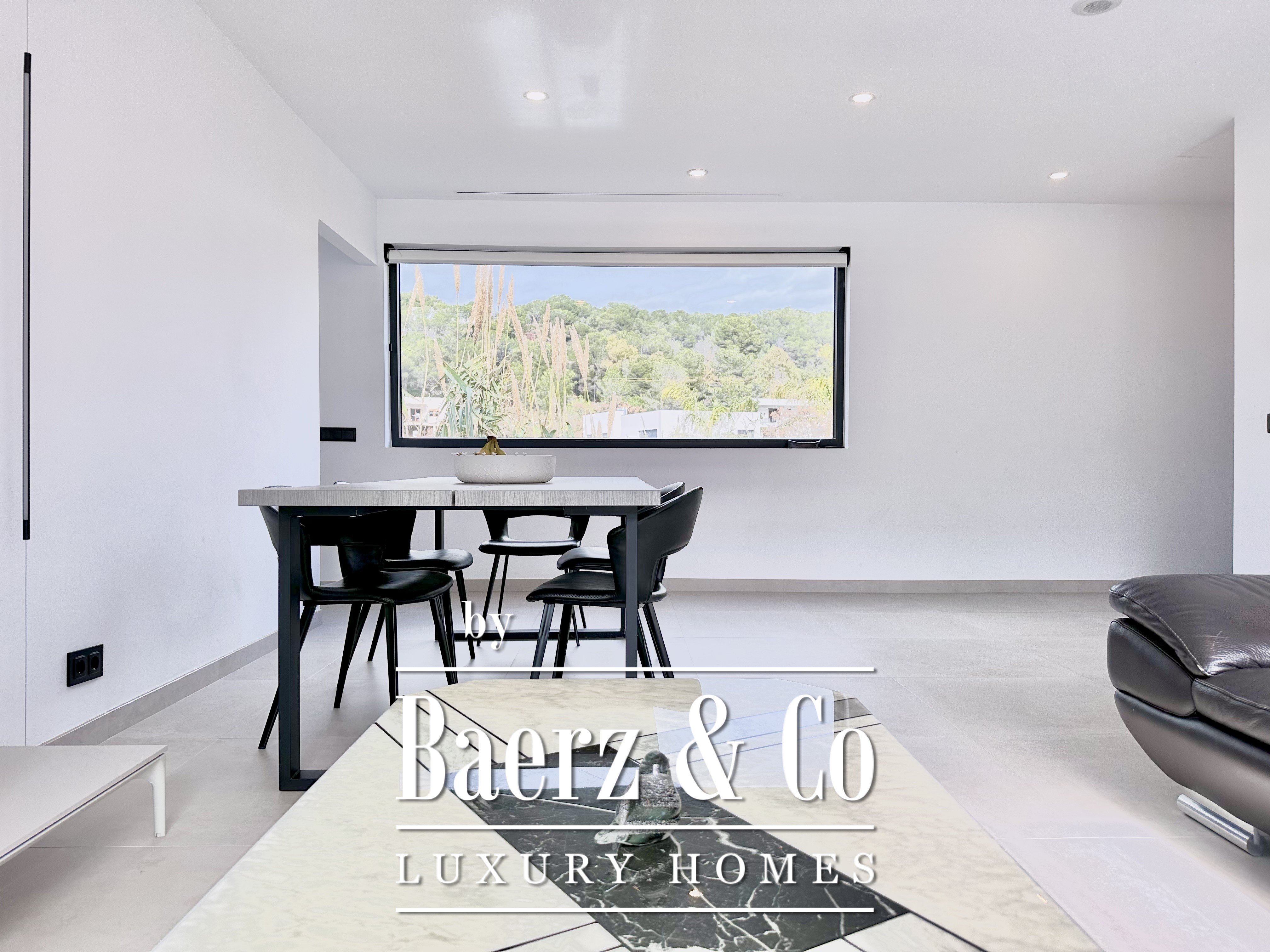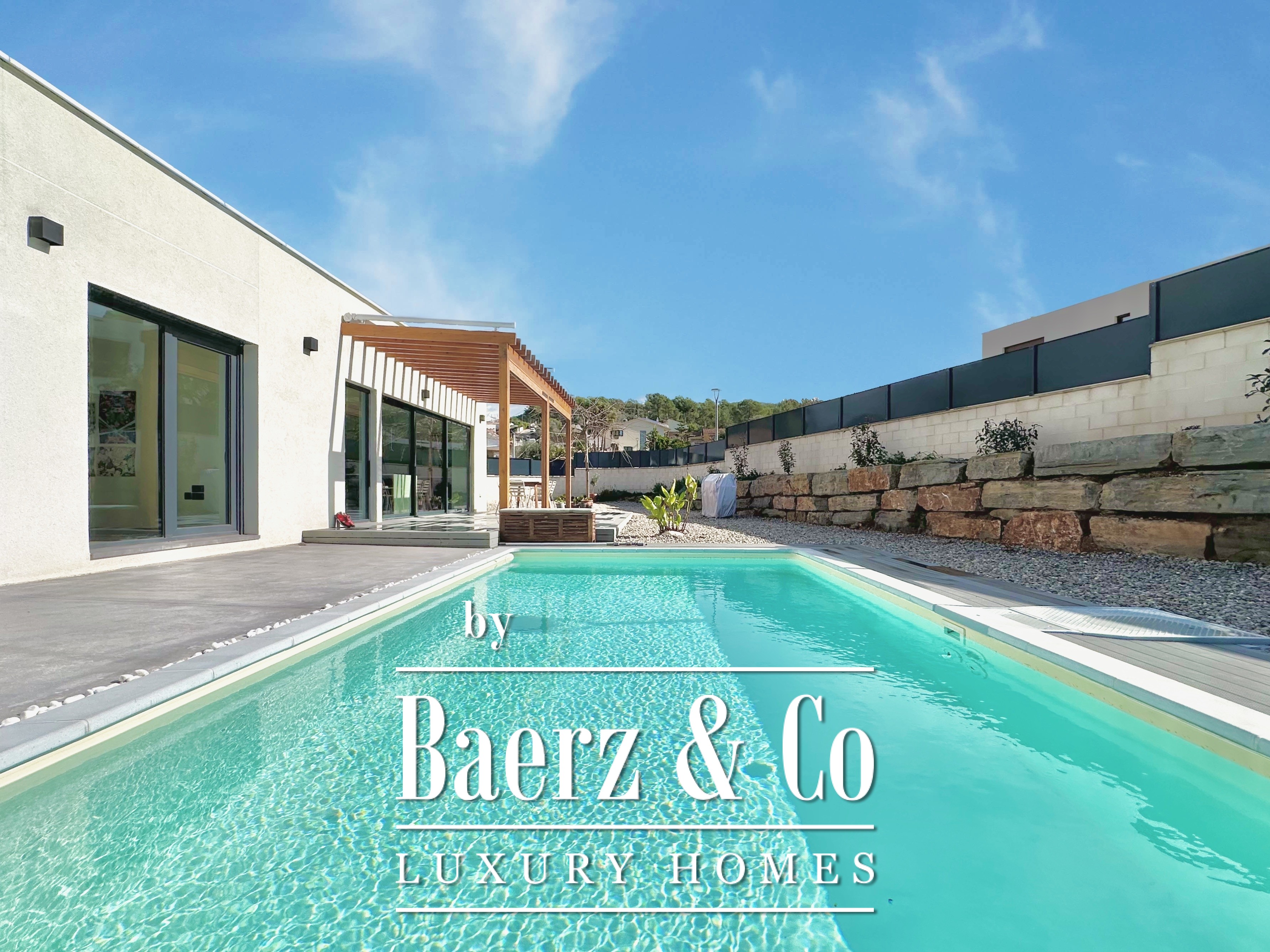 This modern villa Sitges is a newly completed, energy-efficient home designed with sustainability and contemporary minimalism at its core. Located in the tranquil Mas Alba area of Sitges, the property occupies an 860 m² double plot and offers 296 m² of living space, complemented by a 32 m² private pool and mountain views.