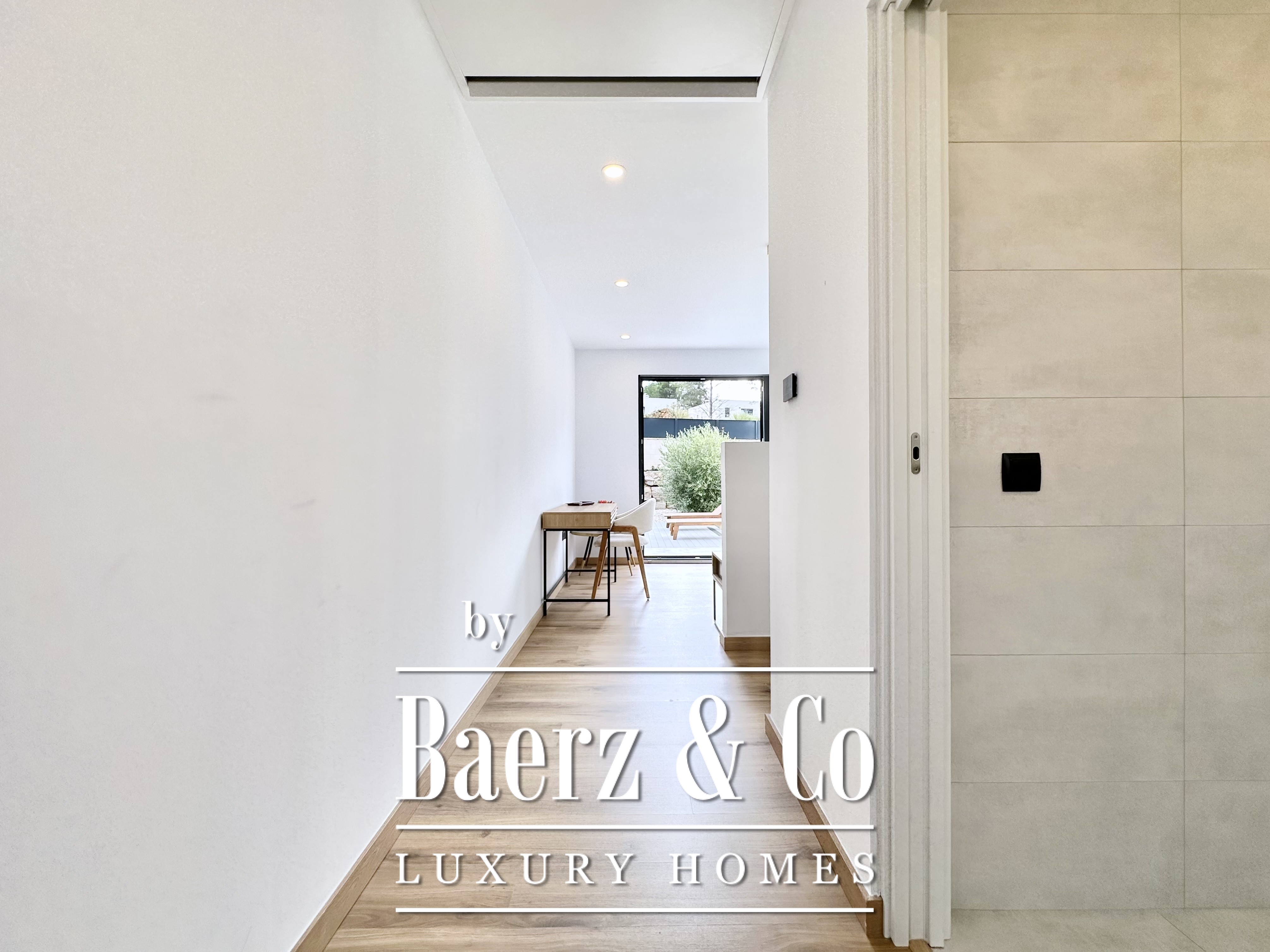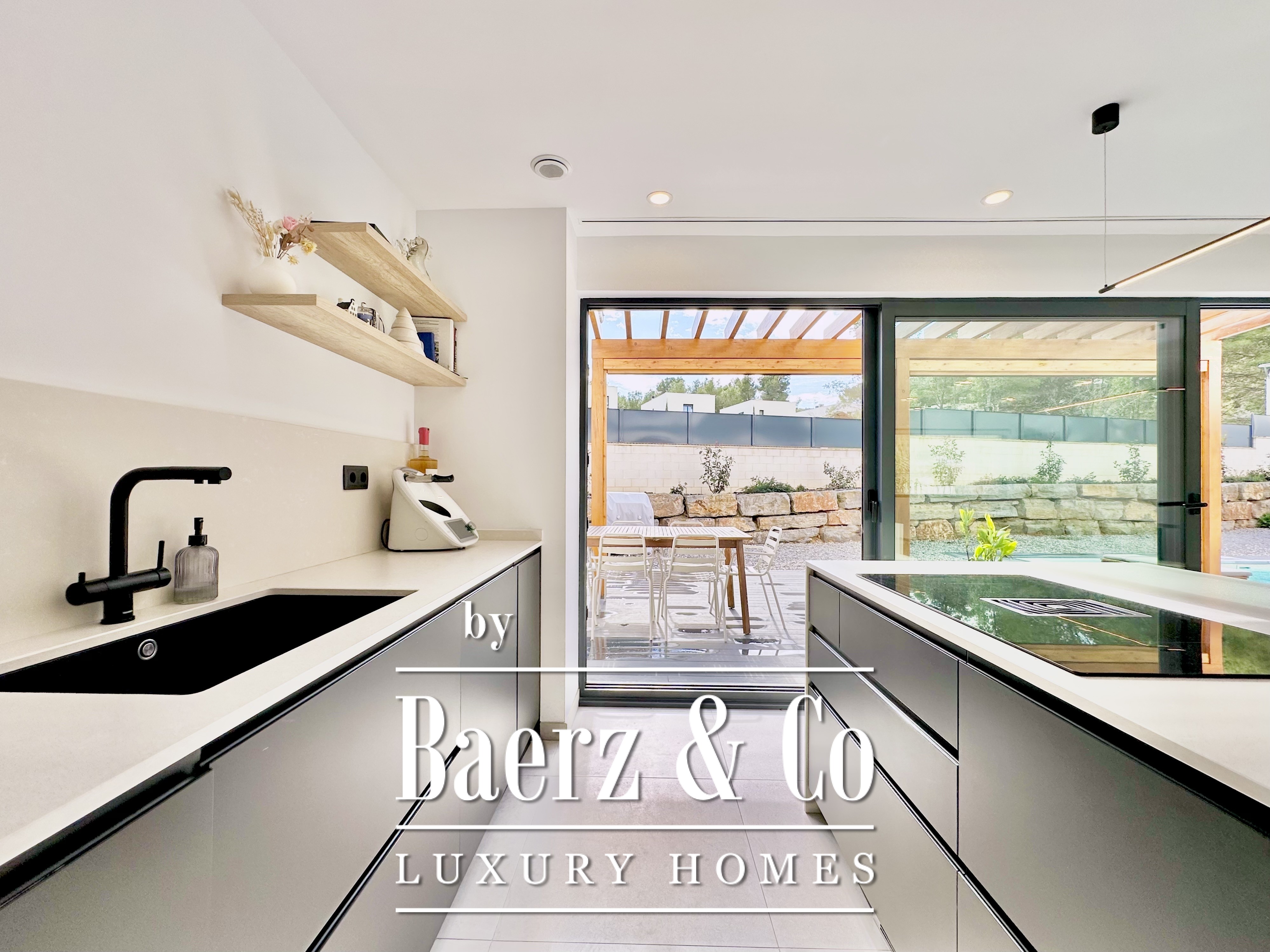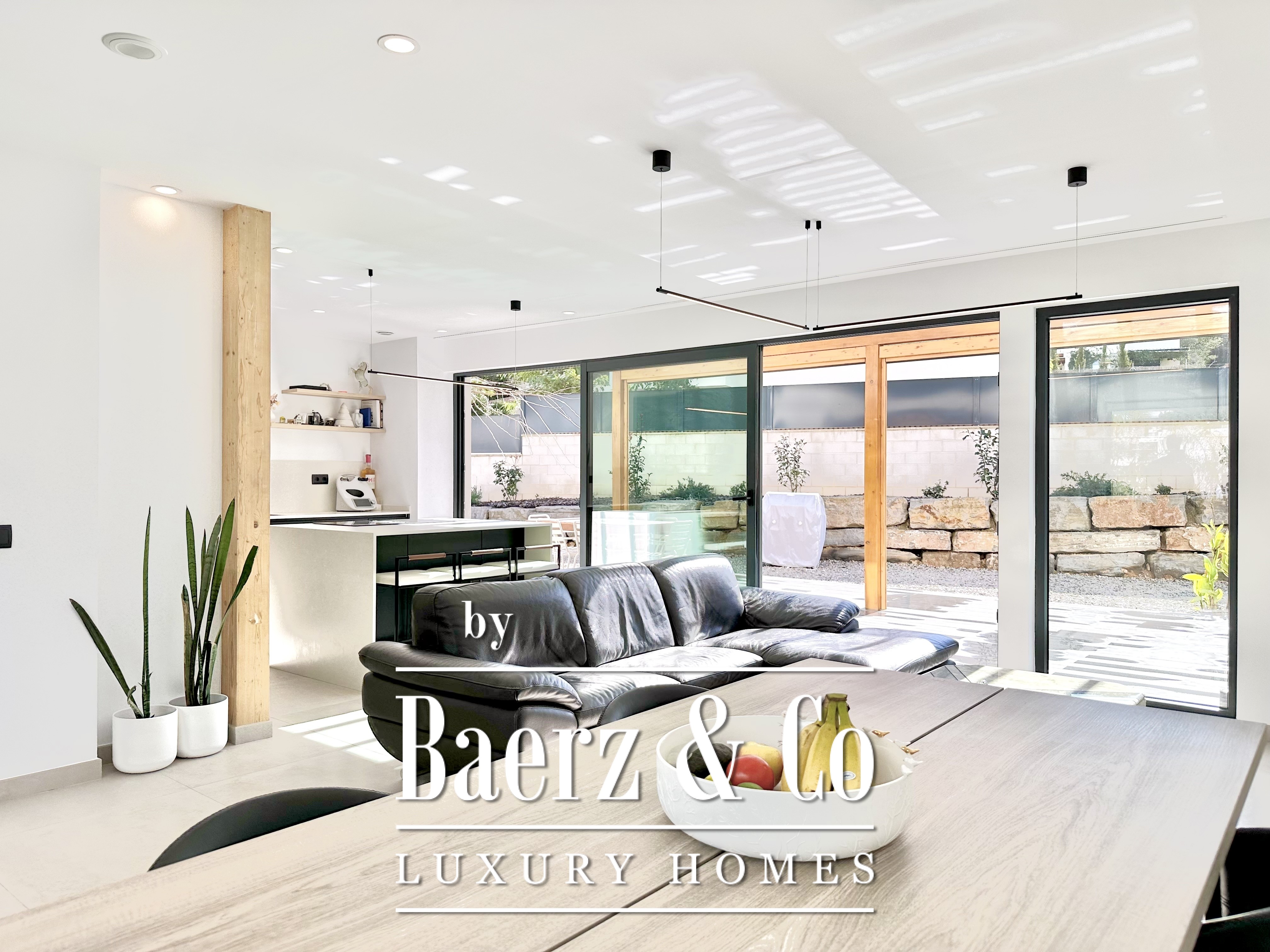 The layout is intentionally open and luminous. Floor-to-ceiling sliding glass doors in the spacious living and dining area connect seamlessly to the garden and pool, creating flow and bringing the outdoors into daily life. The modern, fully equipped kitchen is designed for both functionality and aesthetic clarity. Four bedrooms, including two en-suite, offer versatile accommodation. On the main floor, two double bedrooms share a full bath and open directly towards the pool, while the master suite features its own dressing room and private bathroom with garden views. On the lower floor, a guest suite and two large multipurpose rooms adapt to leisure, fitness, or work, alongside parking for two cars.