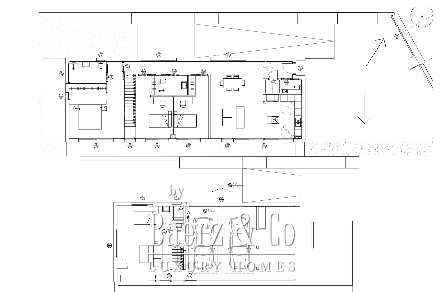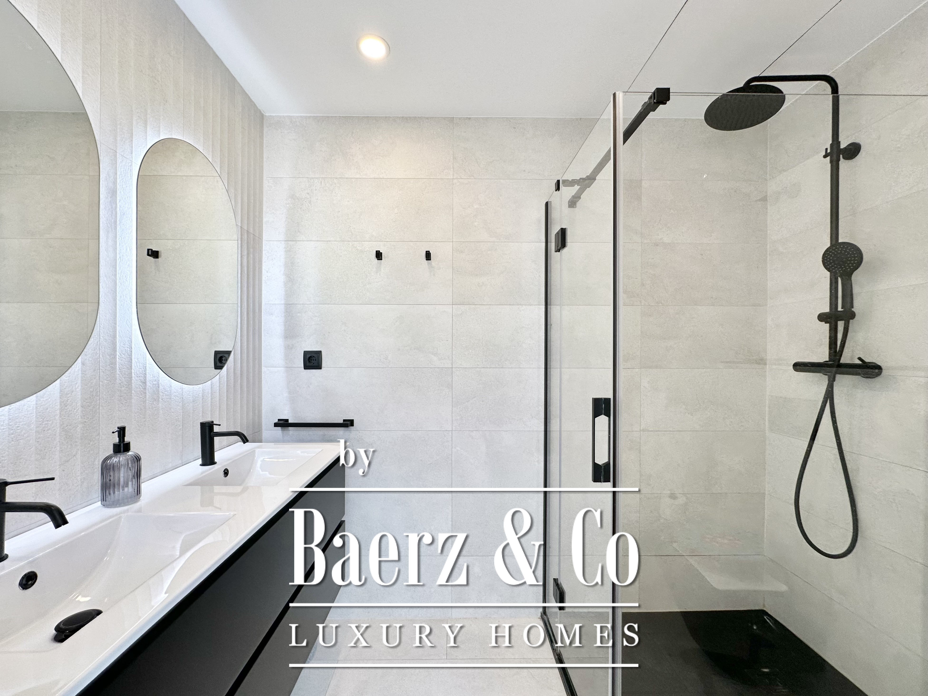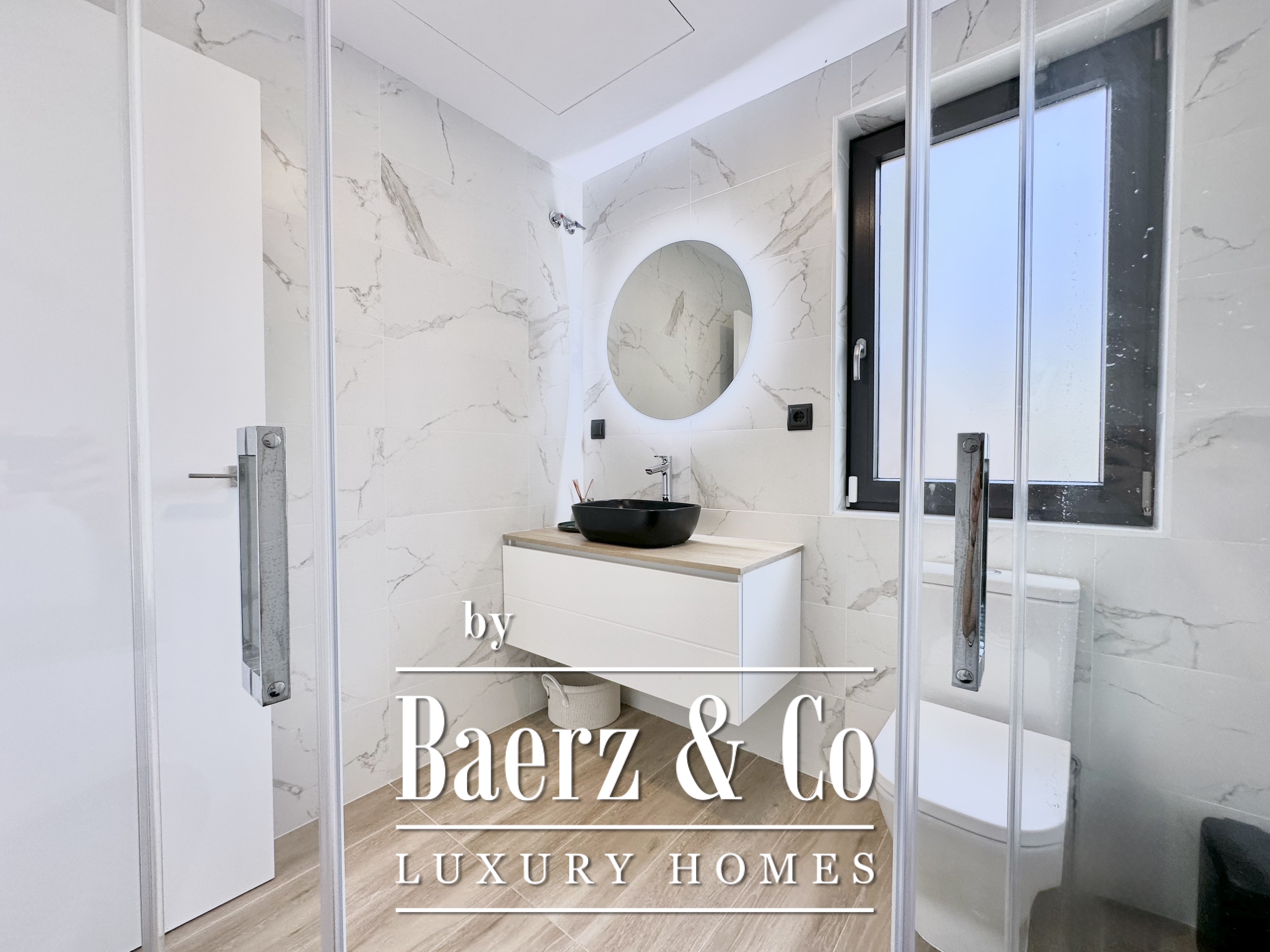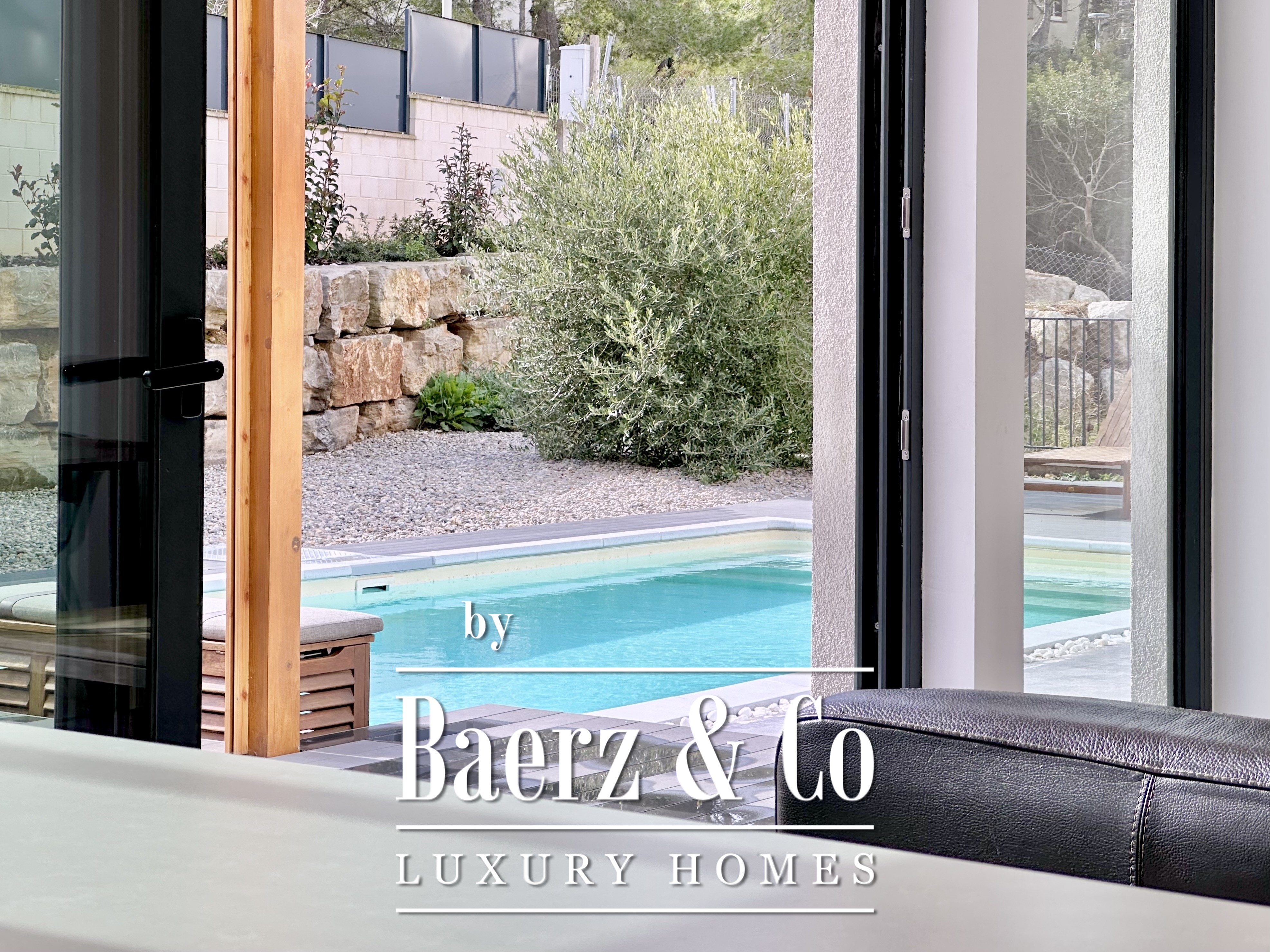 The layout is intentionally open and luminous. Floor-to-ceiling sliding glass doors in the spacious living and dining area connect seamlessly to the garden and pool, creating flow and bringing the outdoors into daily life. The modern, fully equipped kitchen is designed for both functionality and aesthetic clarity. Four bedrooms, including two en-suite, offer versatile accommodation. On the main floor, two double bedrooms share a full bath and open directly towards the pool, while the master suite features its own dressing room and private bathroom with garden views. On the lower floor, a guest suite and two large multipurpose rooms adapt to leisure, fitness, or work, alongside parking for two cars.