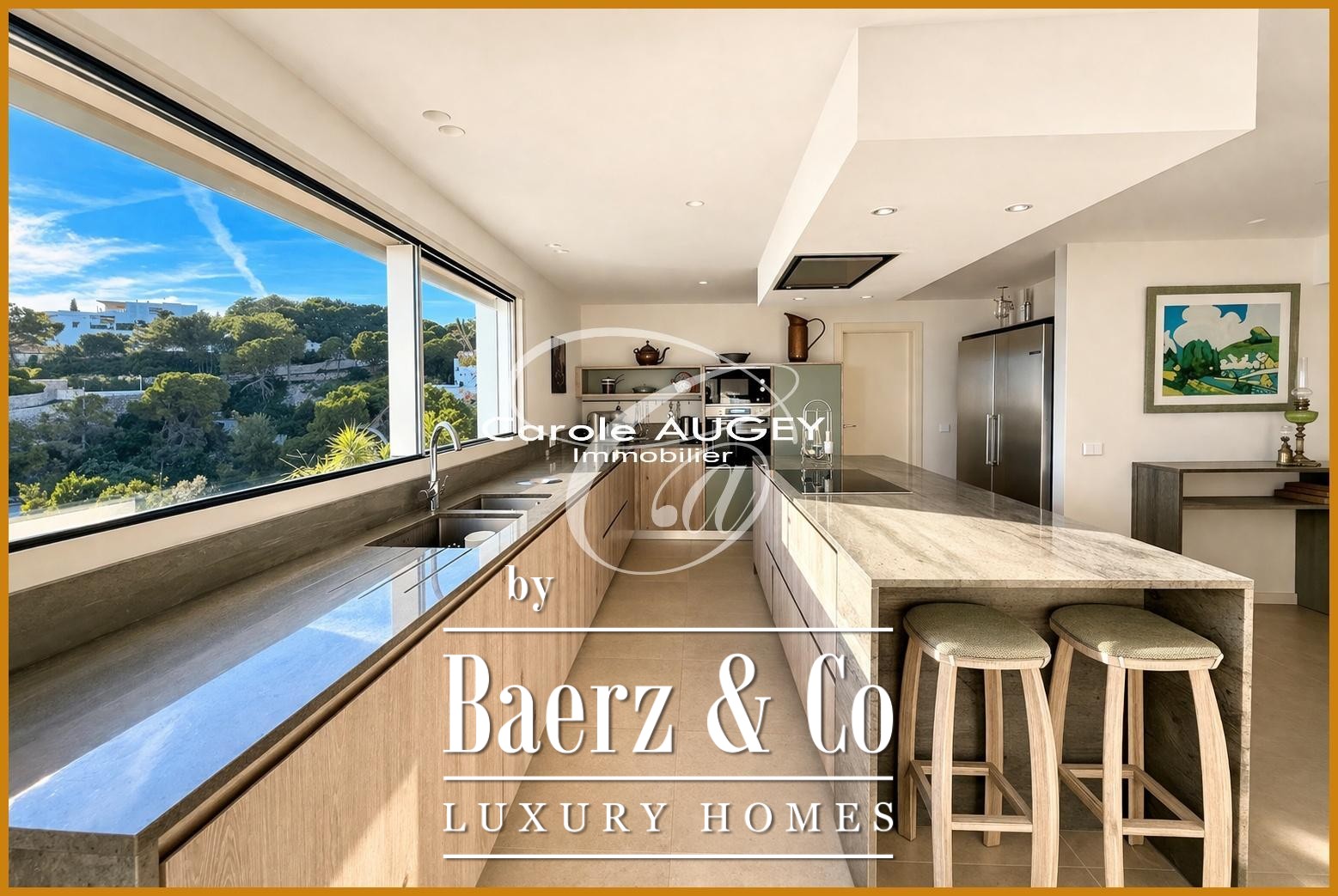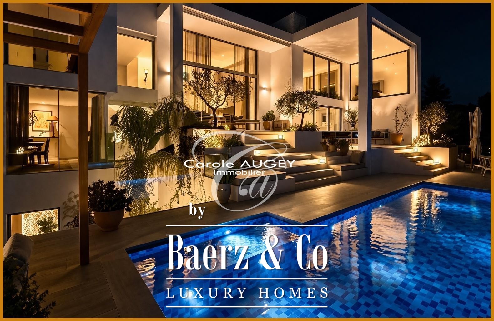 Fully rebuilt and completed in 2023, the villa reveals refined, contemporary design across its 345 m² of living area, with a total built space of over 400 m² on a 1,398 m² plot. Five suites, including a studio with separate access, provide privacy and effortless circulation. Floor-to-ceiling windows, generous terraces, and a striking XXL double-sided fireplace anchor the main living space, while the fully equipped kitchen opens seamlessly onto outdoor living areas.