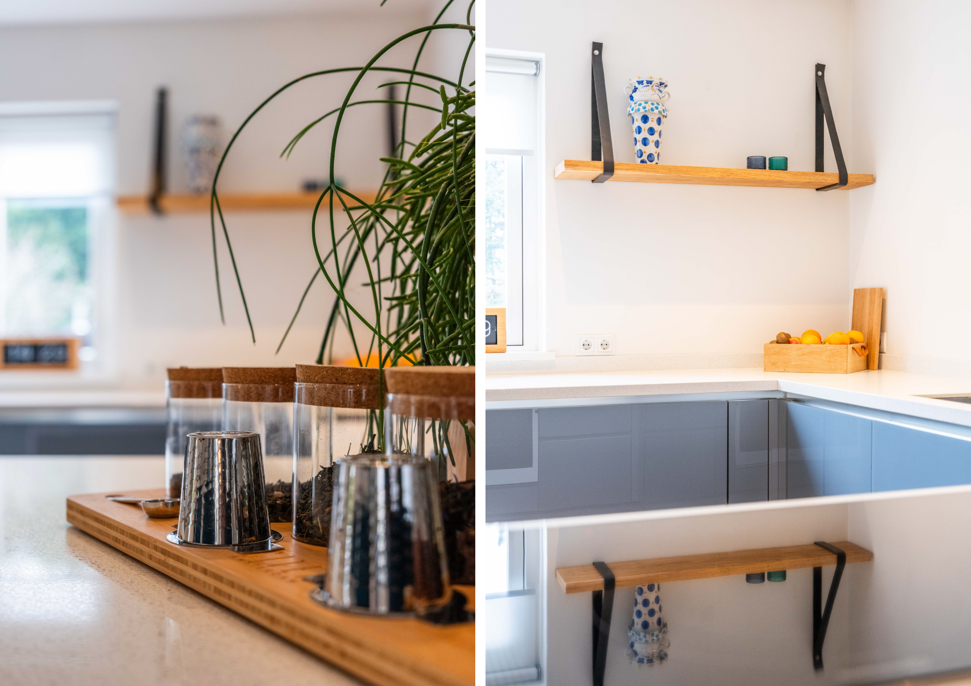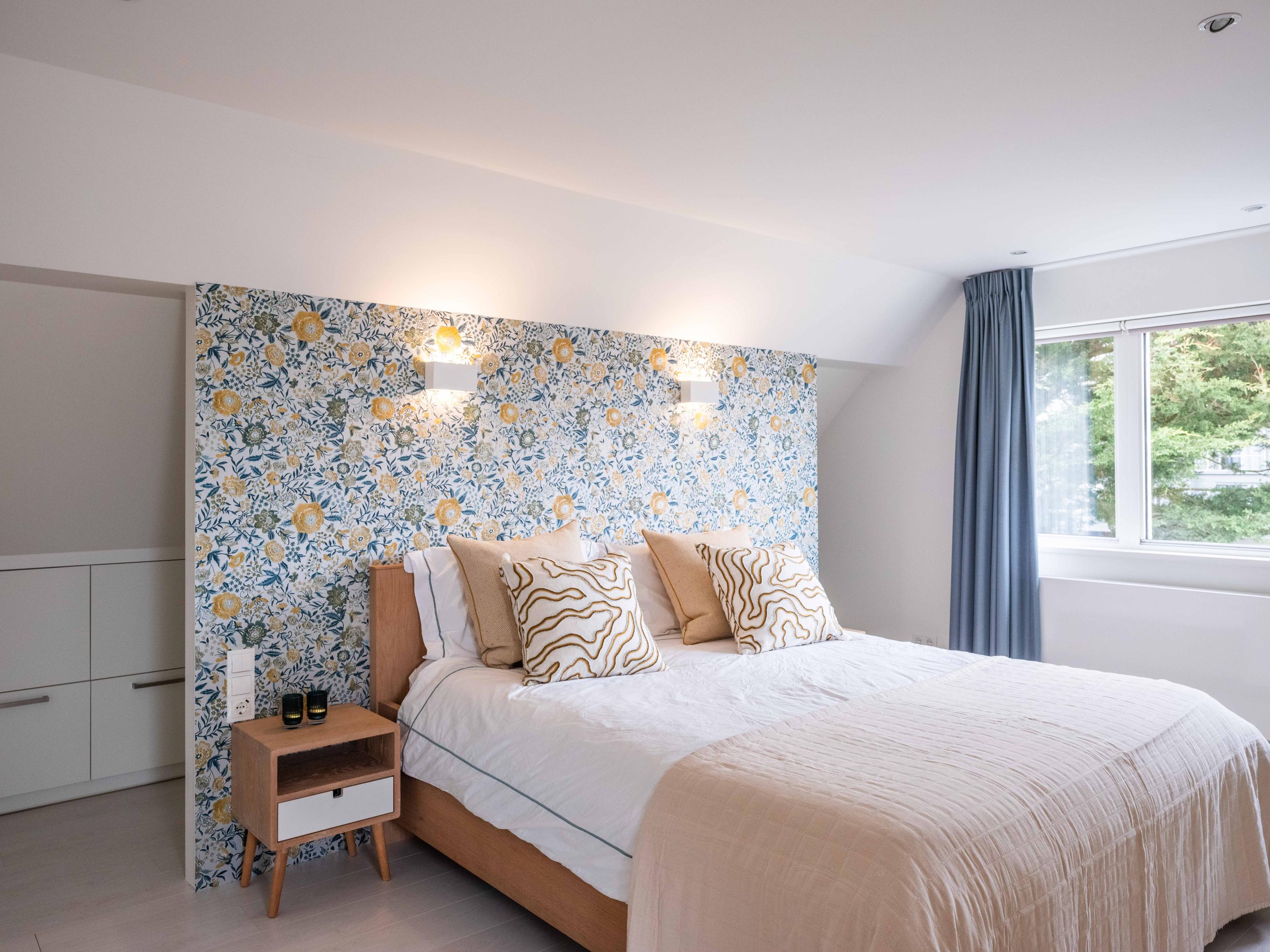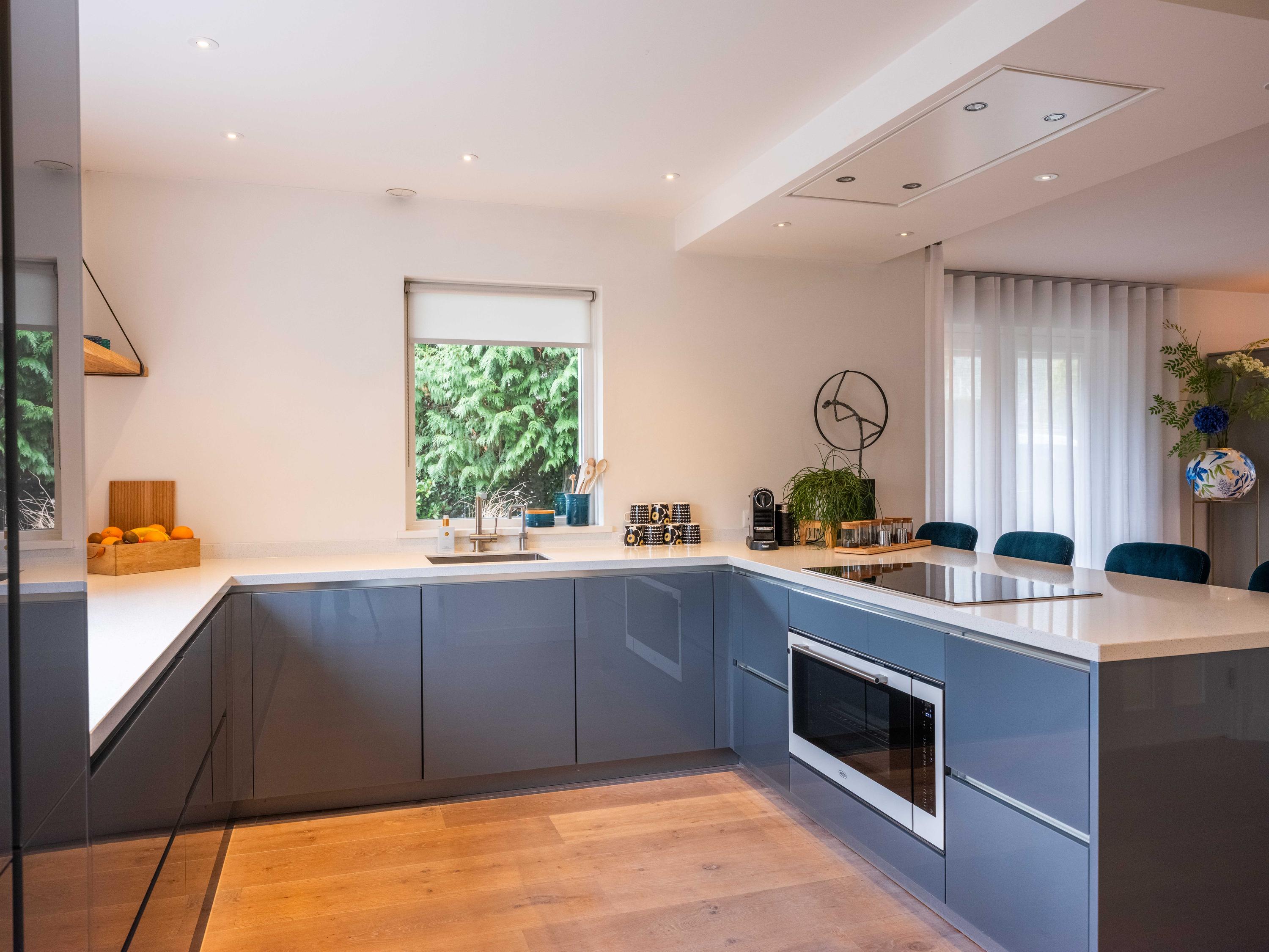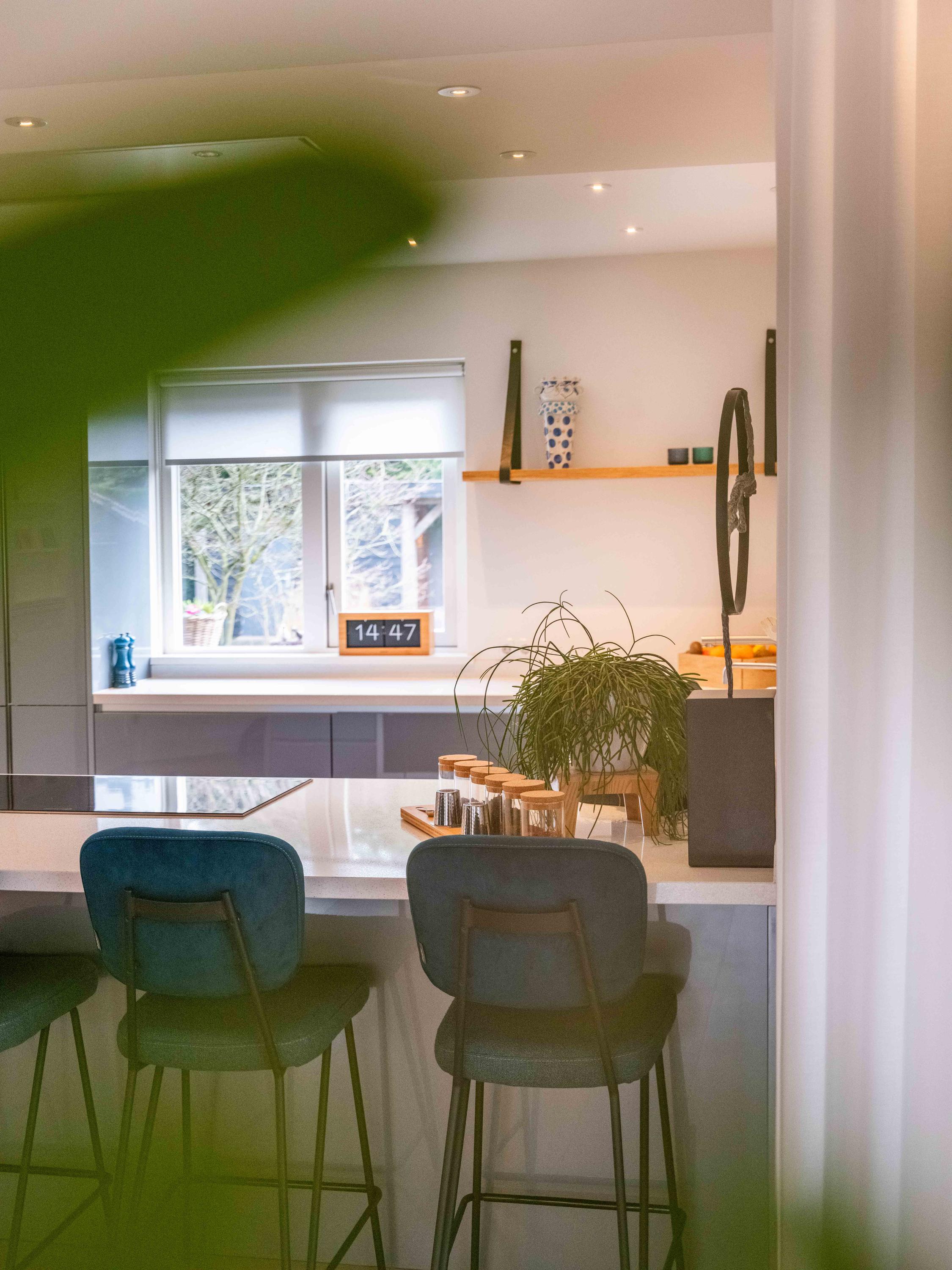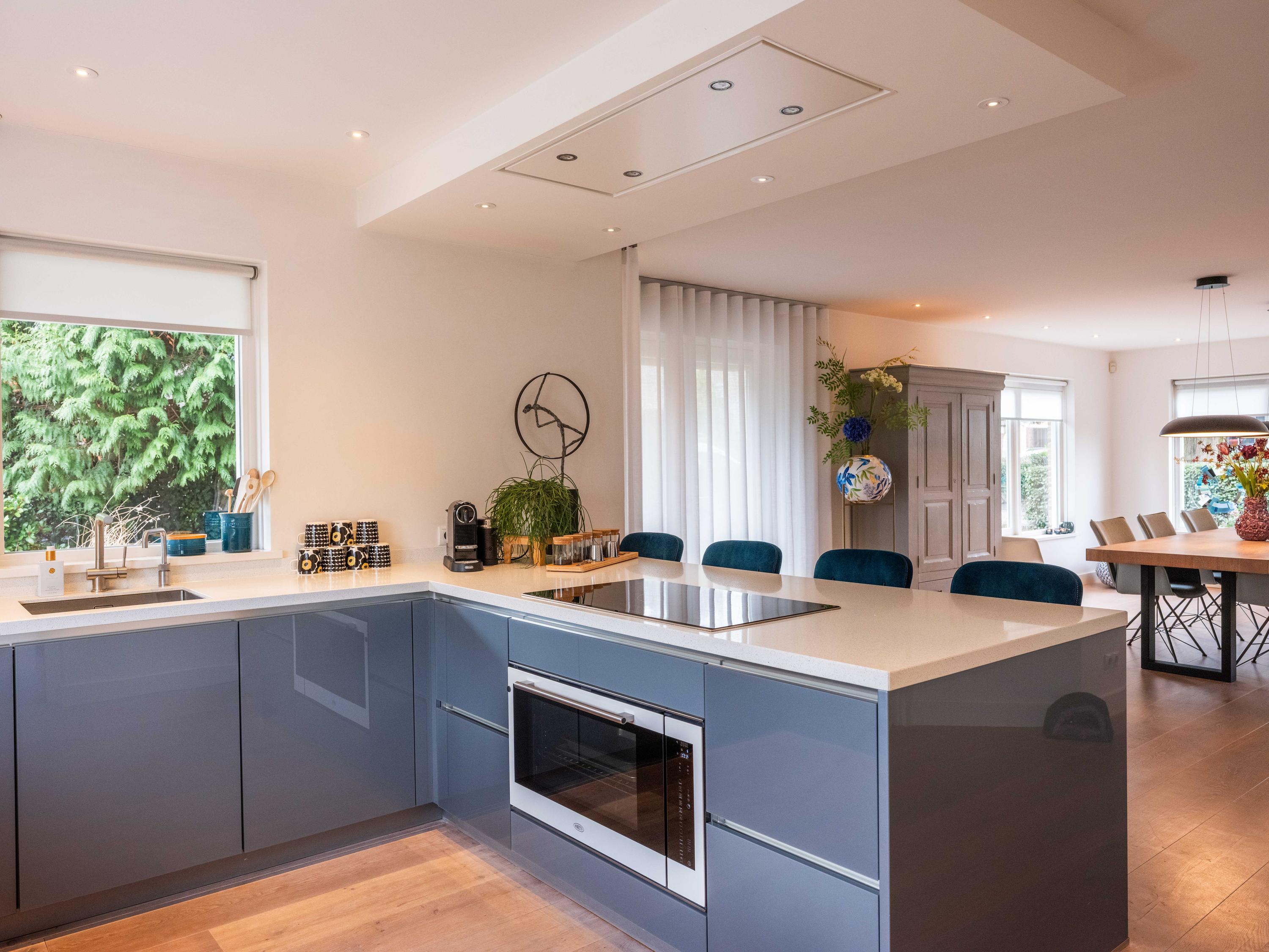 The open kitchen is attractively decorated and equipped with a cosy bar with seating. From the kitchen, you can enjoy a beautiful view of the garden and there is a direct connection to the living room. Thanks to the open layout and abundant light, everything feels spacious, fresh and inviting.