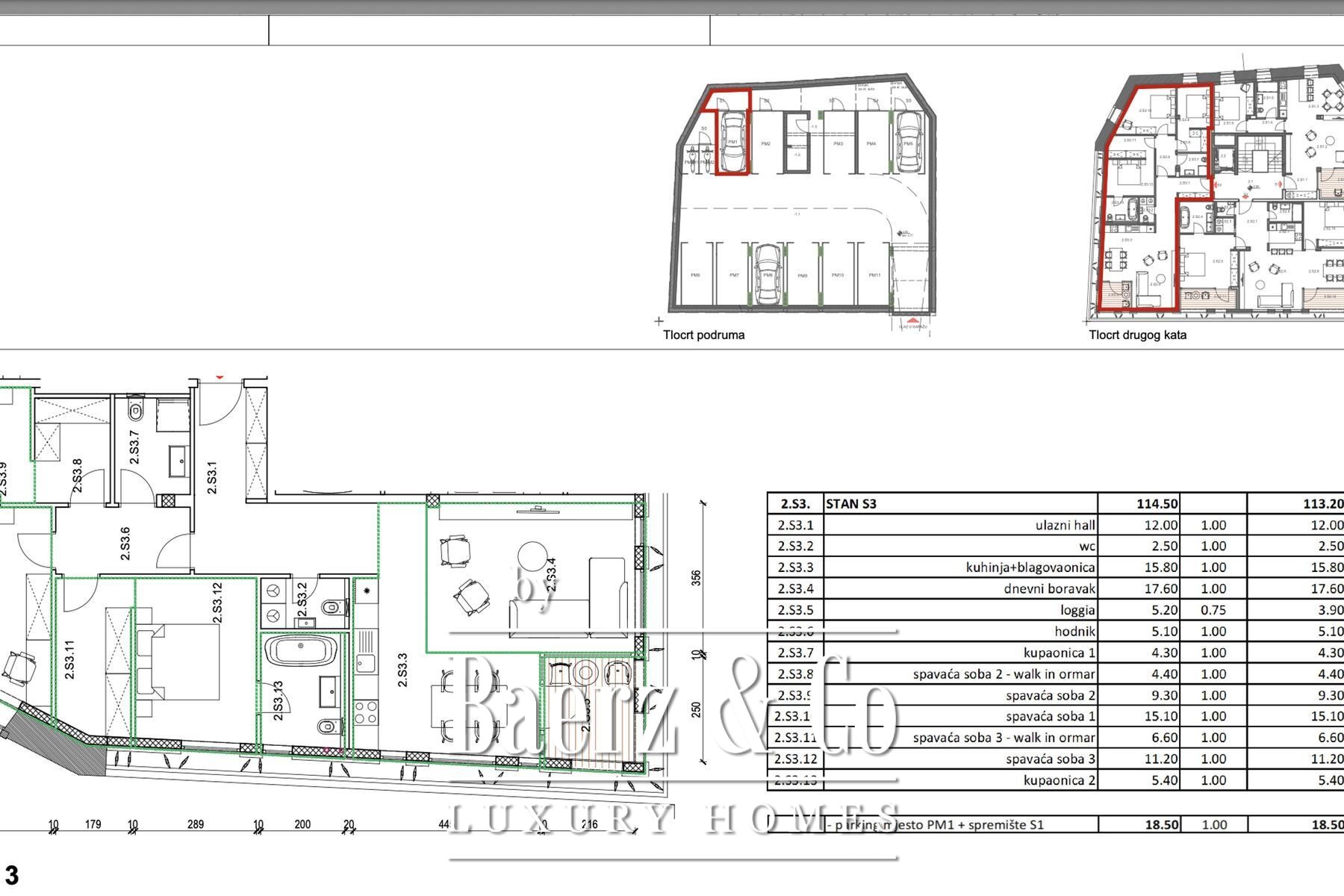 Inside, the spatial rhythm balances open living, kitchen, and dining areas with a discreet loggia, three bedrooms, and three bathrooms. Two bedrooms are enhanced with walk-in closets, while one features a private bathroom. The total closed interior area encompasses 115.7 m², underscoring a generous yet private ambiance.
