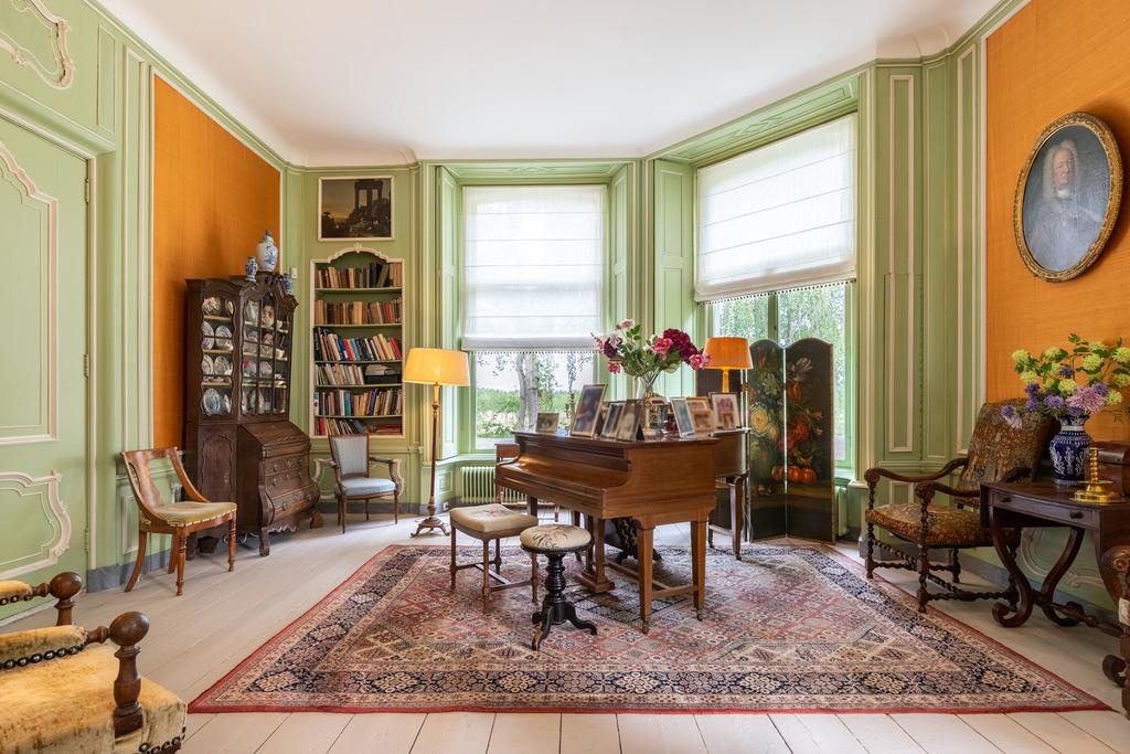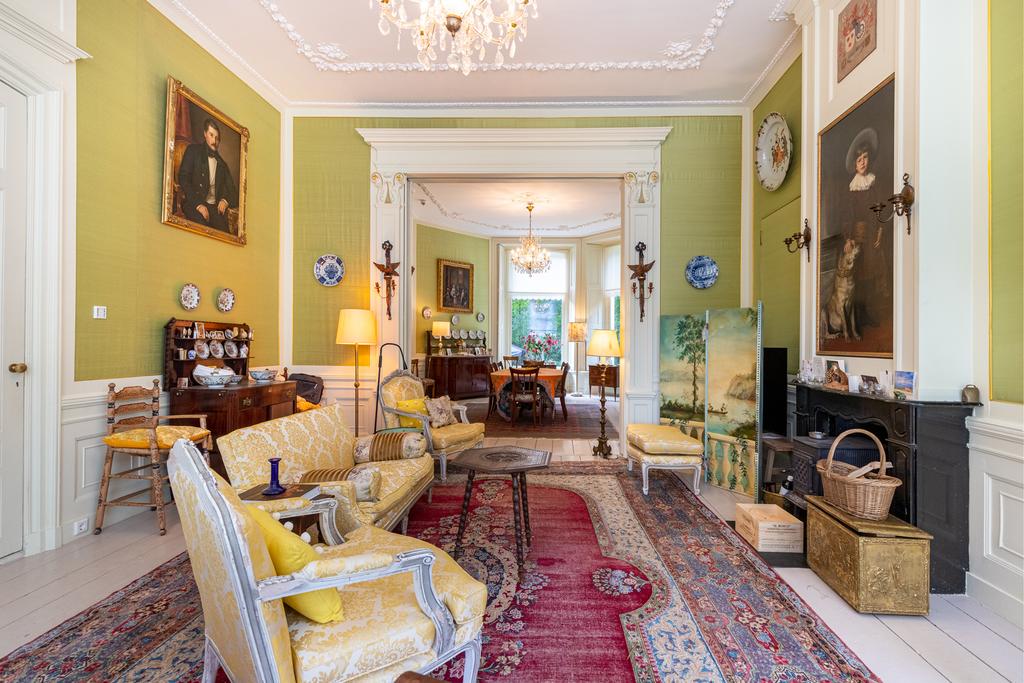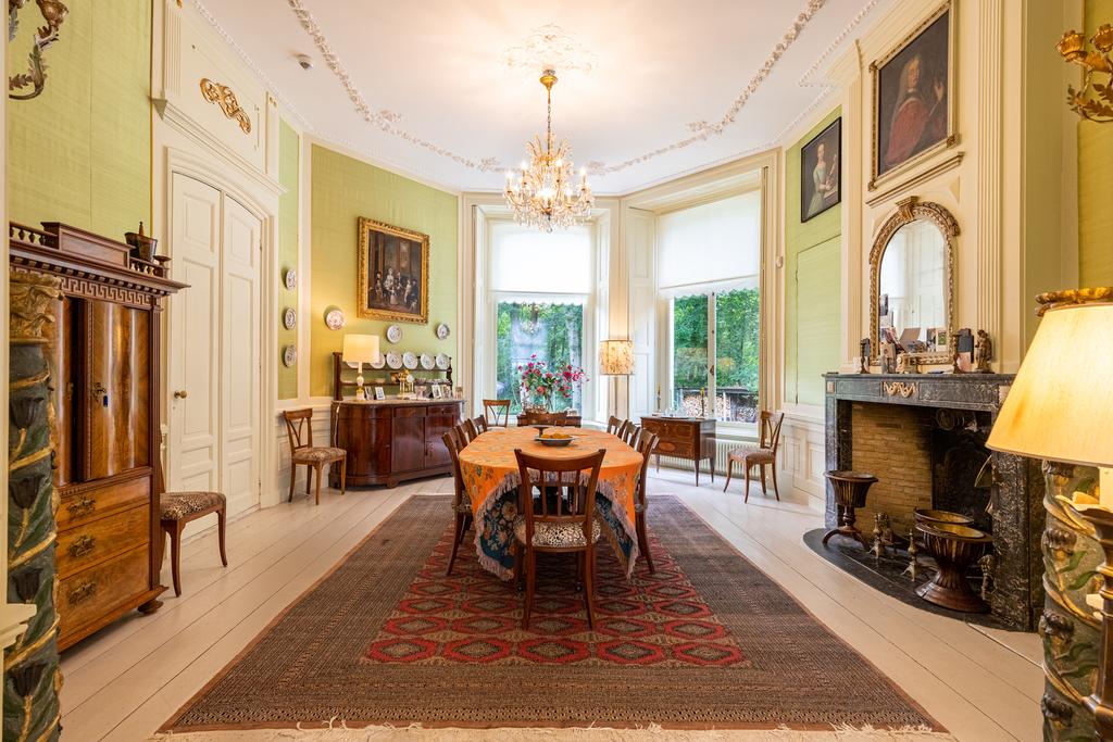 The interior is rich in period details, including ornate fireplaces, damask wall coverings, refined staircases and bespoke finishes.
