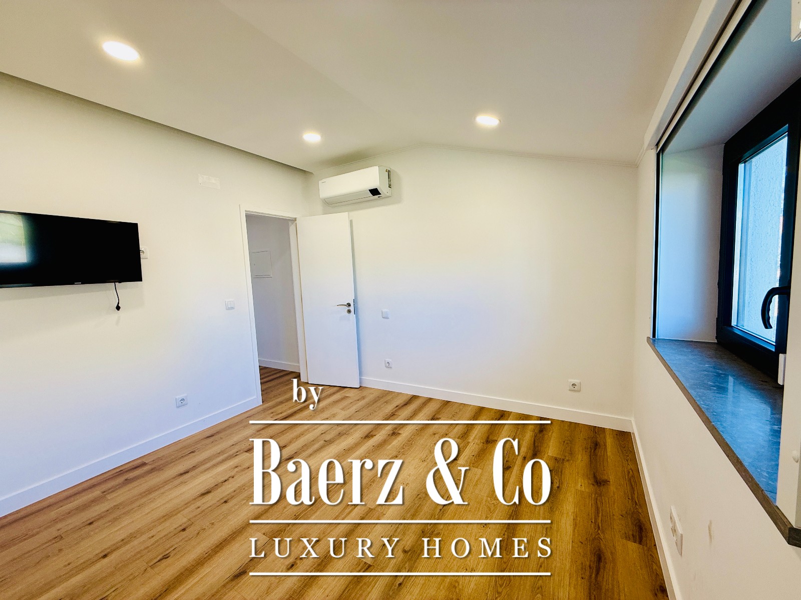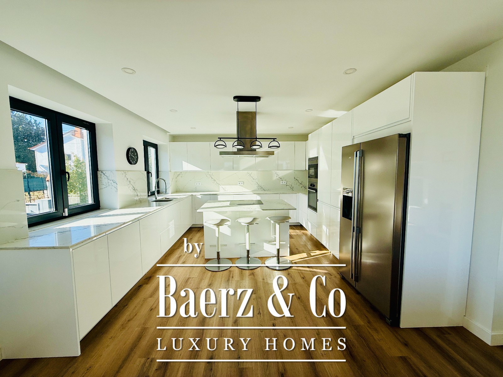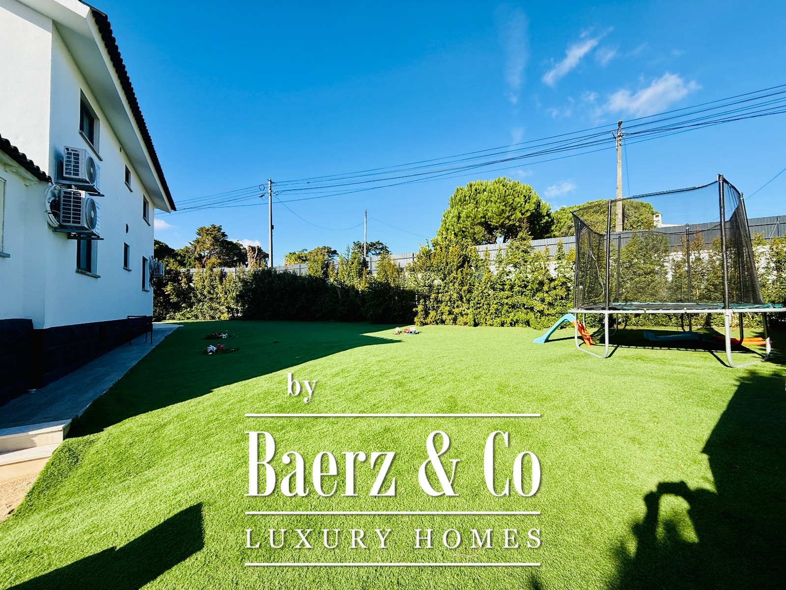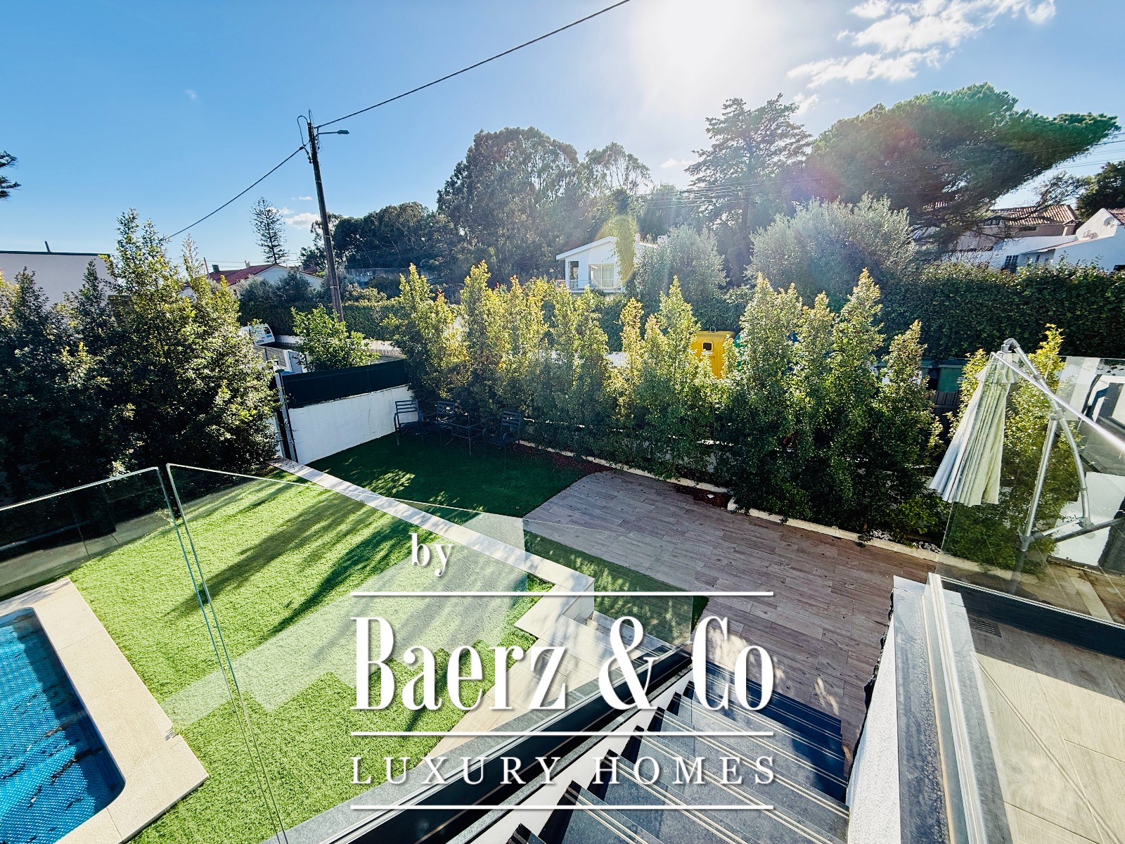 This house Sintra harmonizes contemporary renovation with a sense of privacy and calm, occupying 357 m² on an 868 m² plot. Natural light moves from east to west throughout its three levels, each thoughtfully arranged for both family life and quiet retreat. The ground floor offers a guest bedroom, additional bedroom, storage with a window, a laundry room, and an internal garage for one car. Upstairs, an American-style kitchen with a double refrigerator supports entertaining and everyday rhythm. The adjoining dining and living spaces feature a fireplace and open onto a terrace that leads directly to the heated swimming pool and garden. Two bedrooms on this level provide fitted wardrobes and are served by a well-appointed bathroom. The upper floor holds a principal suite with a walk-in closet and private bath, another suite with wardrobes, and an extra room for flexibility. Air conditioning throughout ensures comfort in every season, with the living spaces quietly set along a tranquil street. From here, Tasis School is ten minutes away, Caisl School twelve minutes, and the center of Lisbon within twenty-five kilometers, connecting daily life to the best of Sintra and the Portuguese capital. This house for sale in Sintra brings together refined practicality with understated elegance.