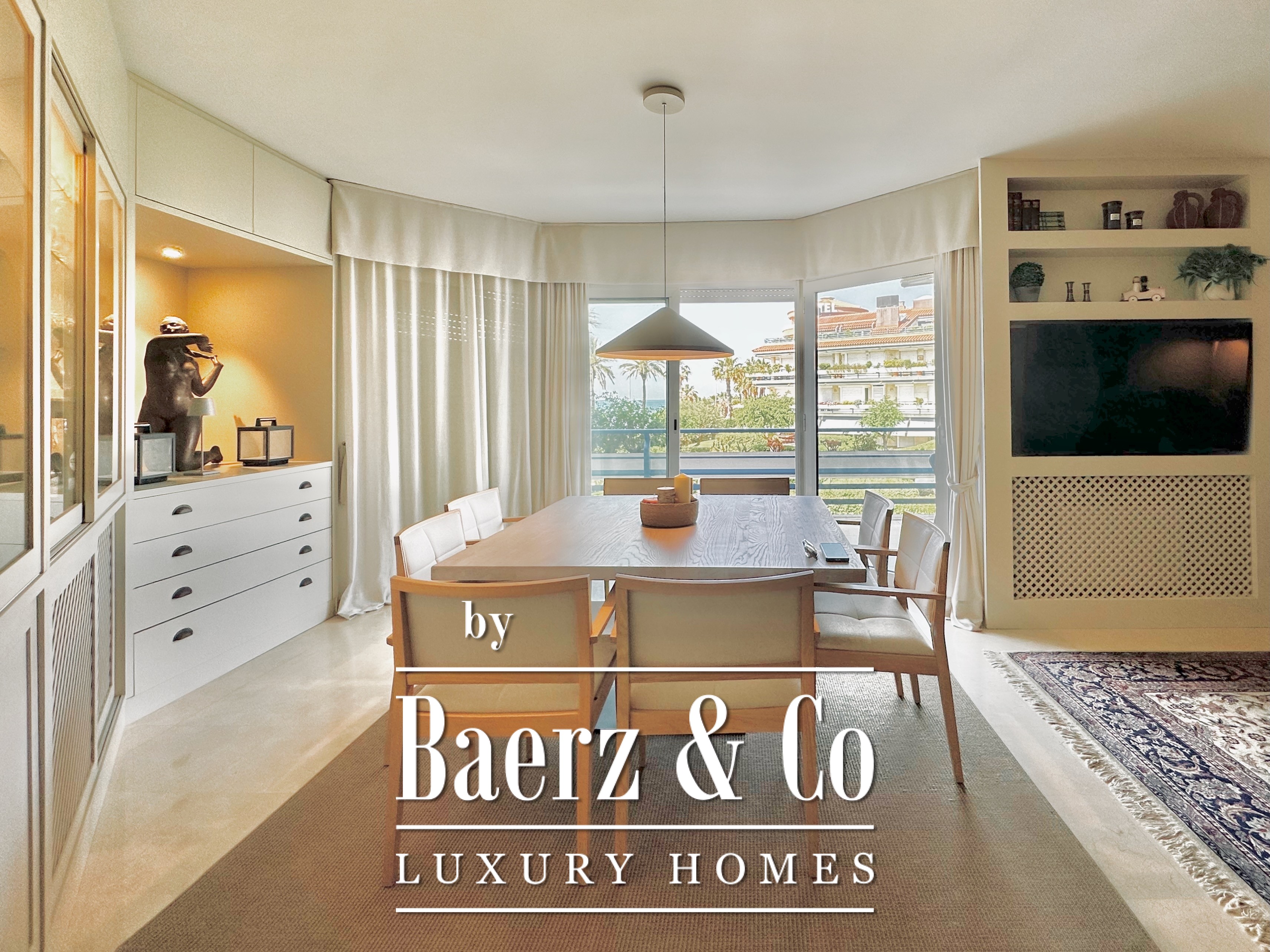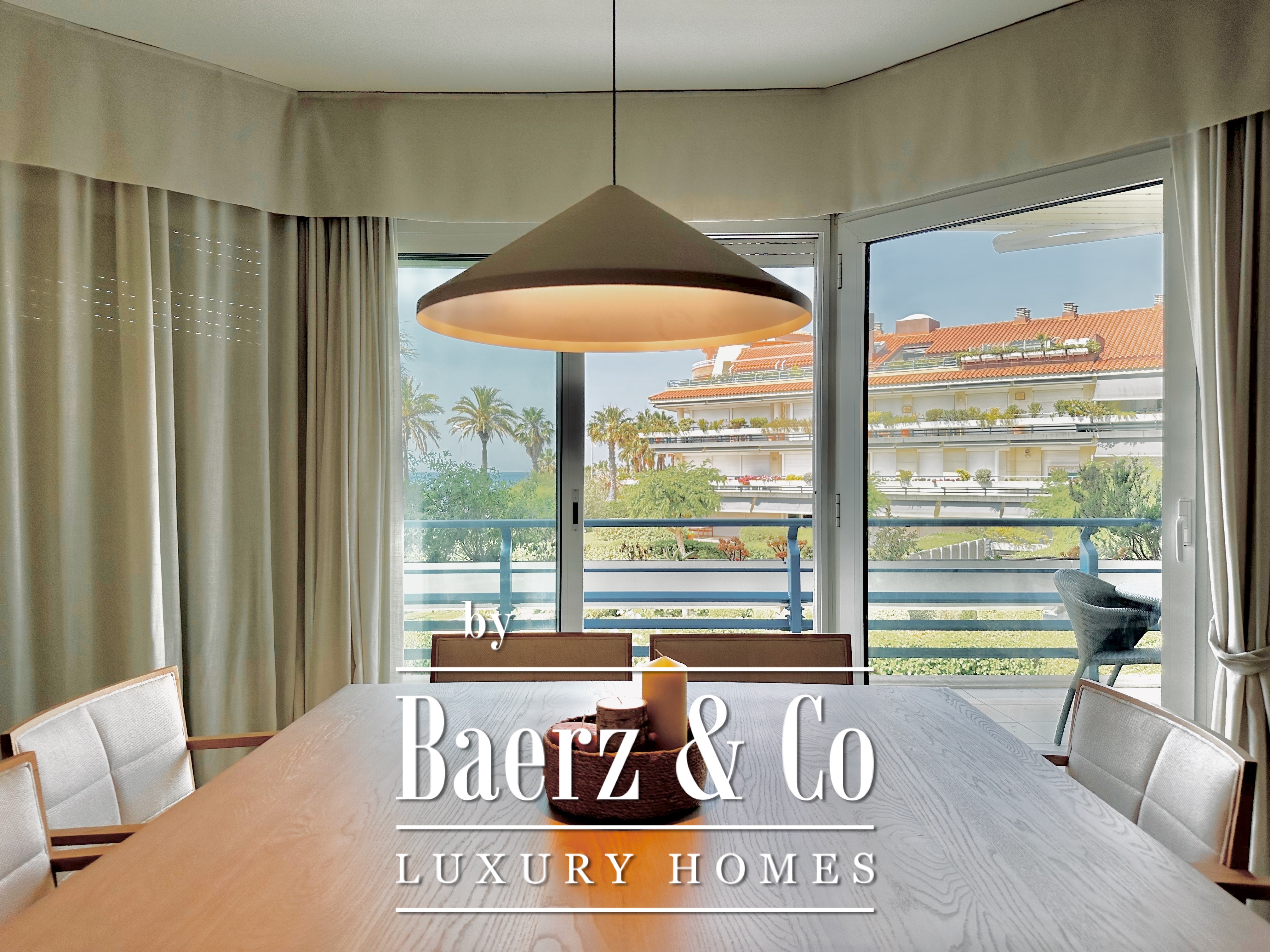 Two expansive terraces, totalling 71 m², trace the apartment’s perimeter, one overlooking the serene communal gardens and the other set directly above the shoreline for unobstructed views. The kitchen and dining space blend functionality and openness, extending onto a terrace framed by greenery. The property has been recently updated and includes two parking spaces and a 14 m² storage unit.