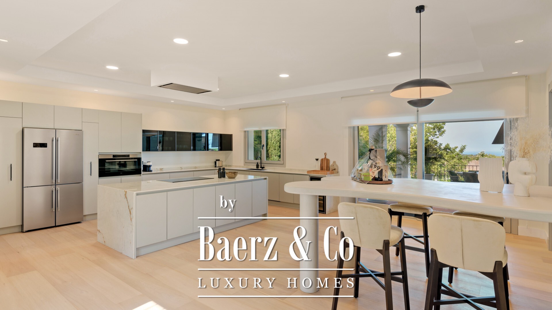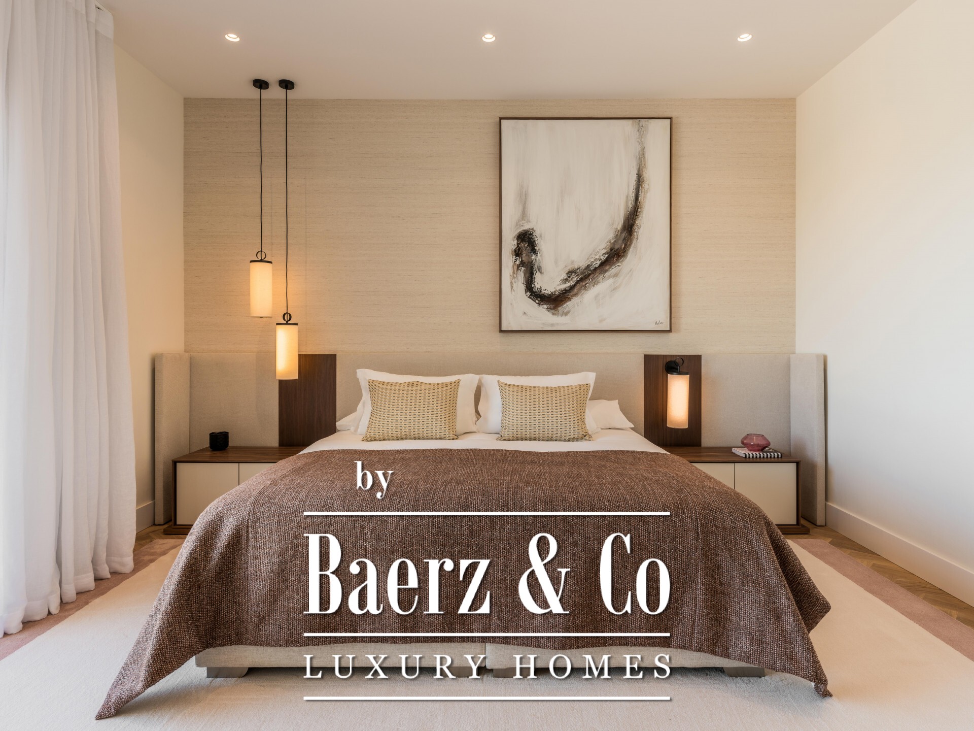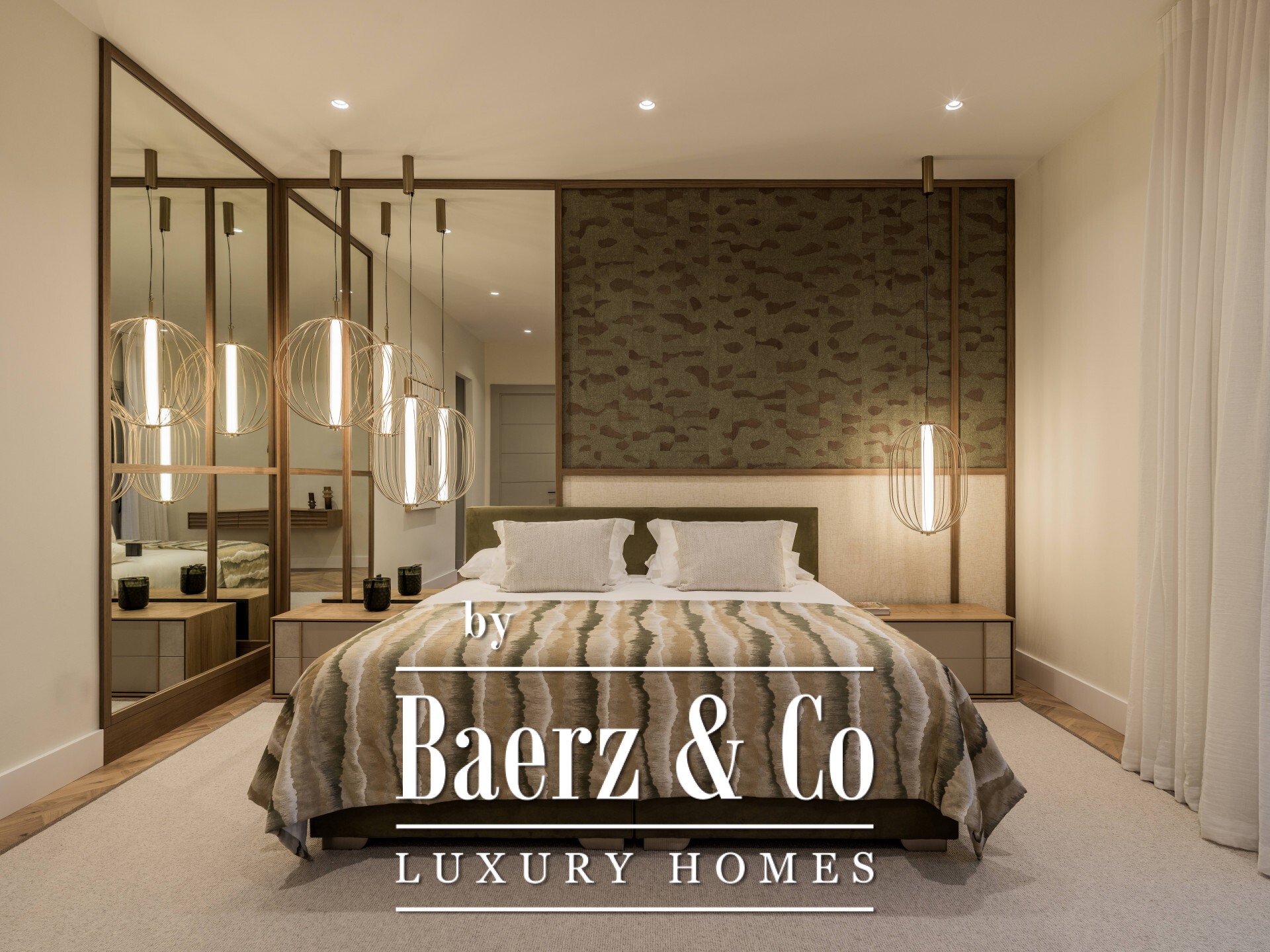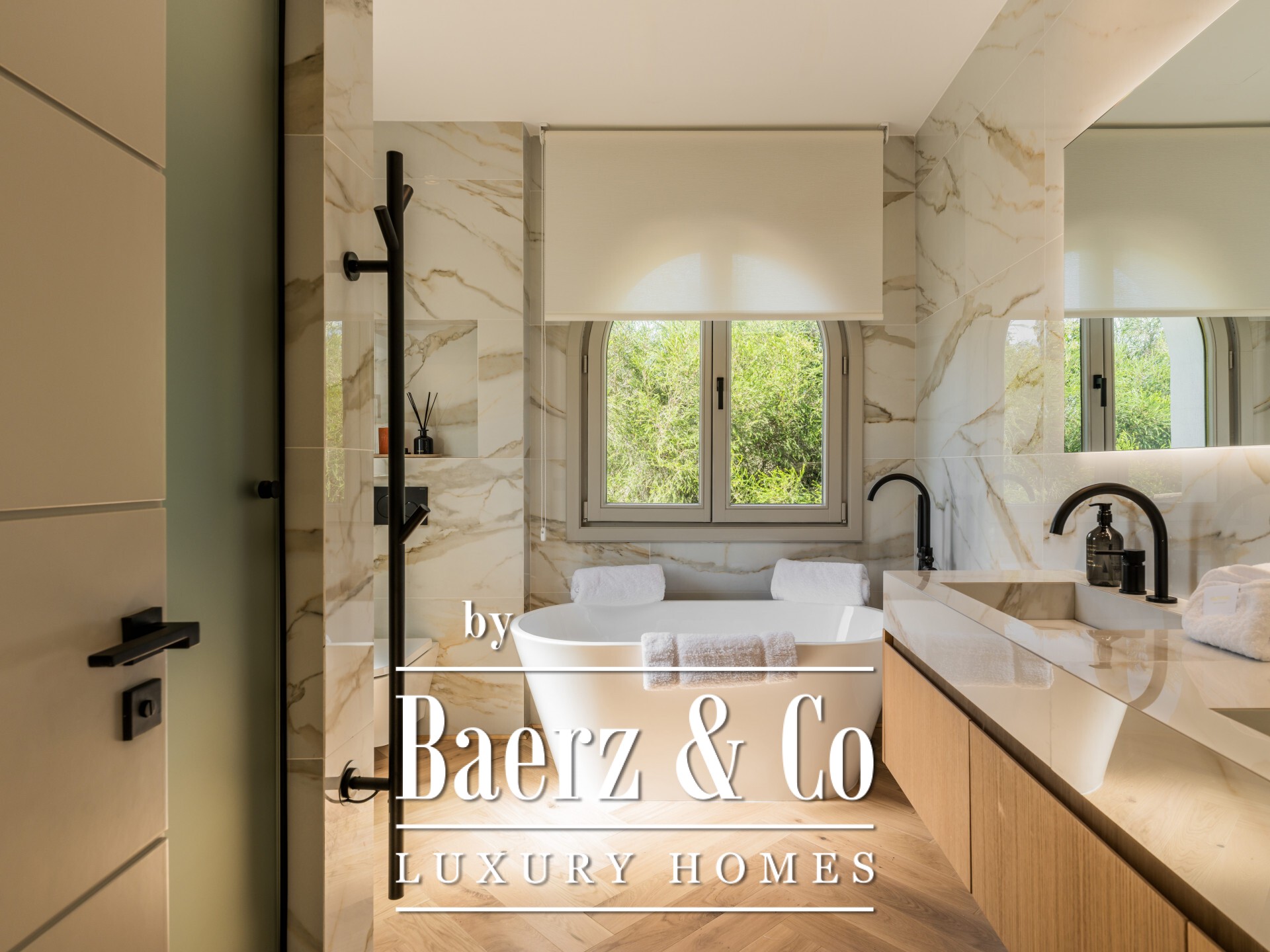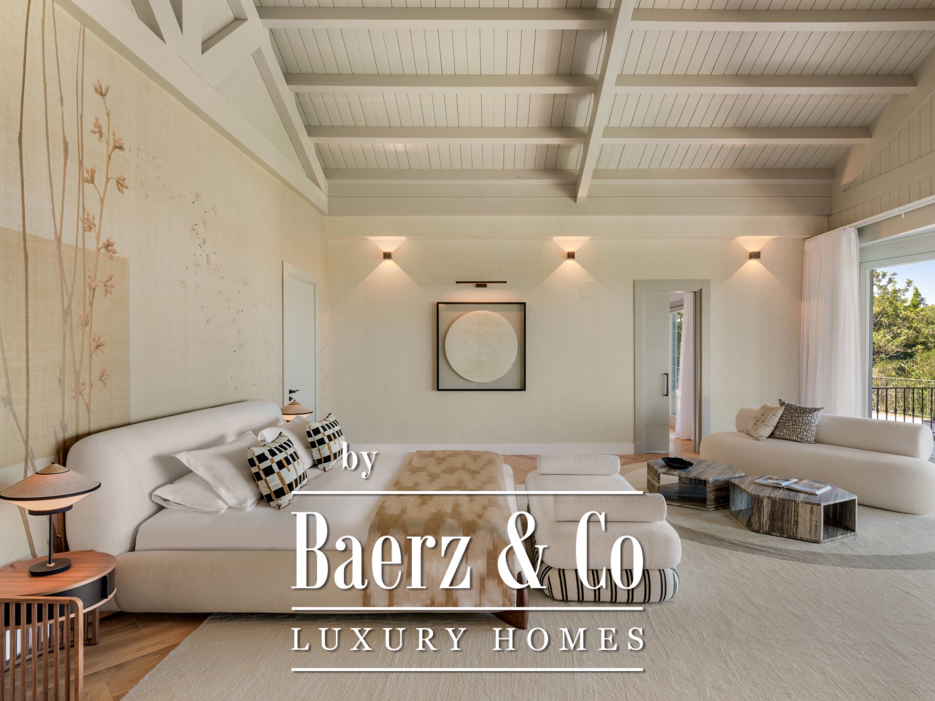 The garden level houses a versatile space for leisure, including a games room, cinema, bar, and four further bedrooms, three with private bathrooms. A two-storey pool house with barbecue encourages relaxed entertaining amid shaded greenery or evening light. Throughout the villa, underfloor heating and air conditioning maintain comfort, while amenities include a sauna, Turkish bath, saltwater pool, wine cellar, and security within a gated community.