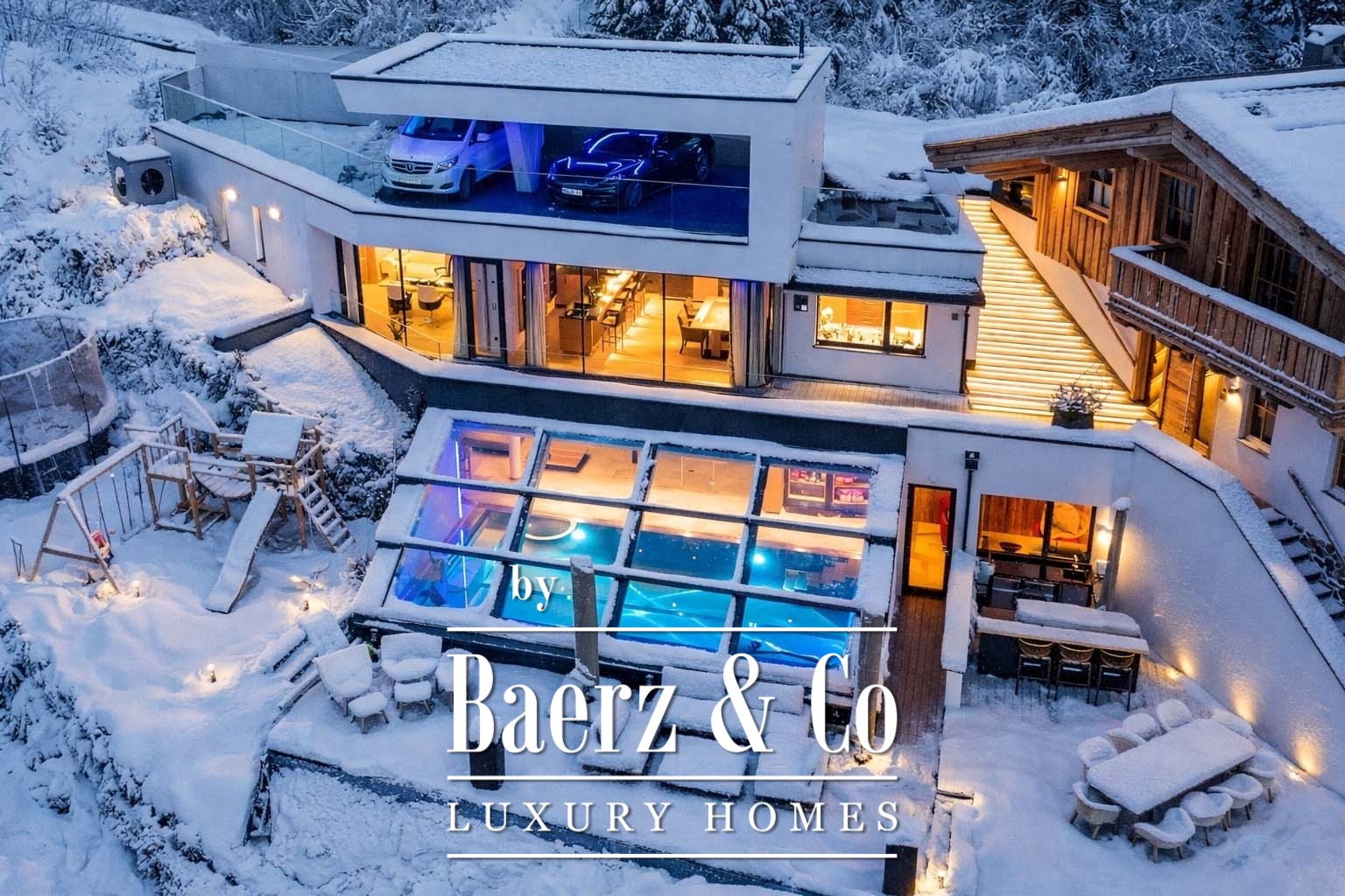 The private wellness area unfolds with an indoor pool, flexible glazing, and a sauna—inviting year-round retreat with views of the mountains. Security and comfort are quietly assured by an alarm system, video surveillance, floor heating, three carports, and additional parking.