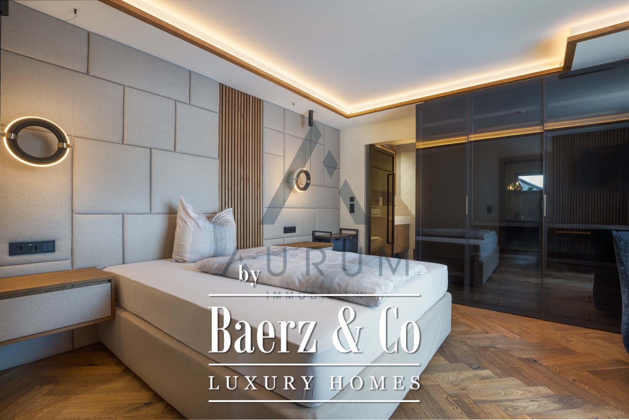 Throughout the interiors, elegant designer furniture, bespoke joinery, and reclaimed timber features reveal a devotion to craftsmanship. The kitchen is fitted with Gaggenau appliances and high-end fixtures, complemented by exclusive hardwood floors and a designer lighting concept. Two distinct apartments within the residence offer complete privacy, each equipped with their own kitchen and bathroom, allowing for flexibility in family living, guest accommodation, or remote work.