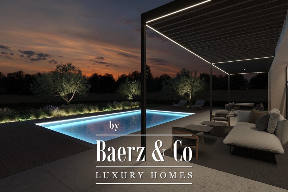 Outdoors, daily rhythms transition to a partially covered terrace, sunbathing space, and a swimming pool adjacent to a spa with sauna and dedicated poolside facilities. Quality materials and furnishings are evident at every touchpoint, with heat pump heating for year-round comfort. Two private parking spaces, one covered, and curated horticulture complete this haven. Sveti Lovreč’s tranquil pace, together with the nearby coastal cities, positions this property as an exceptional residence for those seeking privacy and timeless design. Luxury villa for sale in Sveti Lovreč.