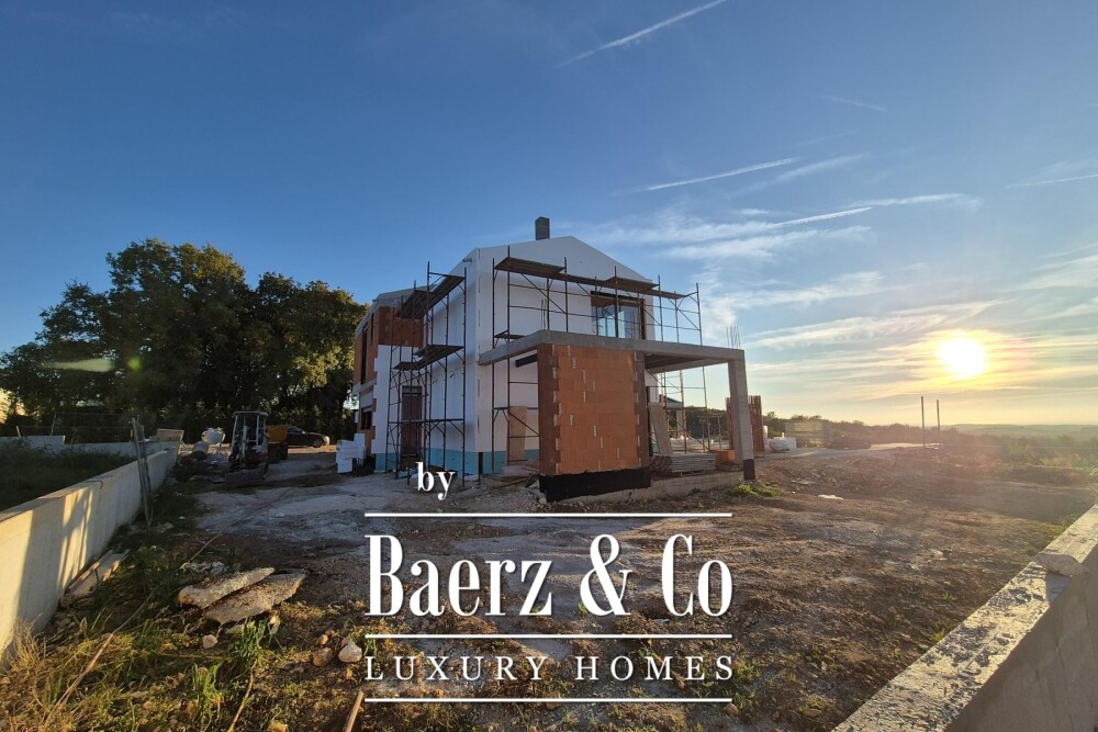Villa Sveti Lovreč stands atop a generous 1,408 m² plot, offering a rare panoramic view that sweeps from the Alps to the softly rising steeple of St. Euphemia in Rovinj. This villa Sveti Lovreč embodies understated Mediterranean living, composed across 291.68 m² where natural light and timeless materials converge.
