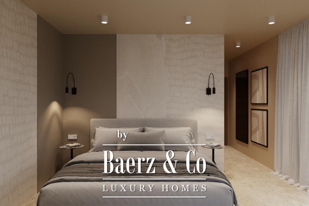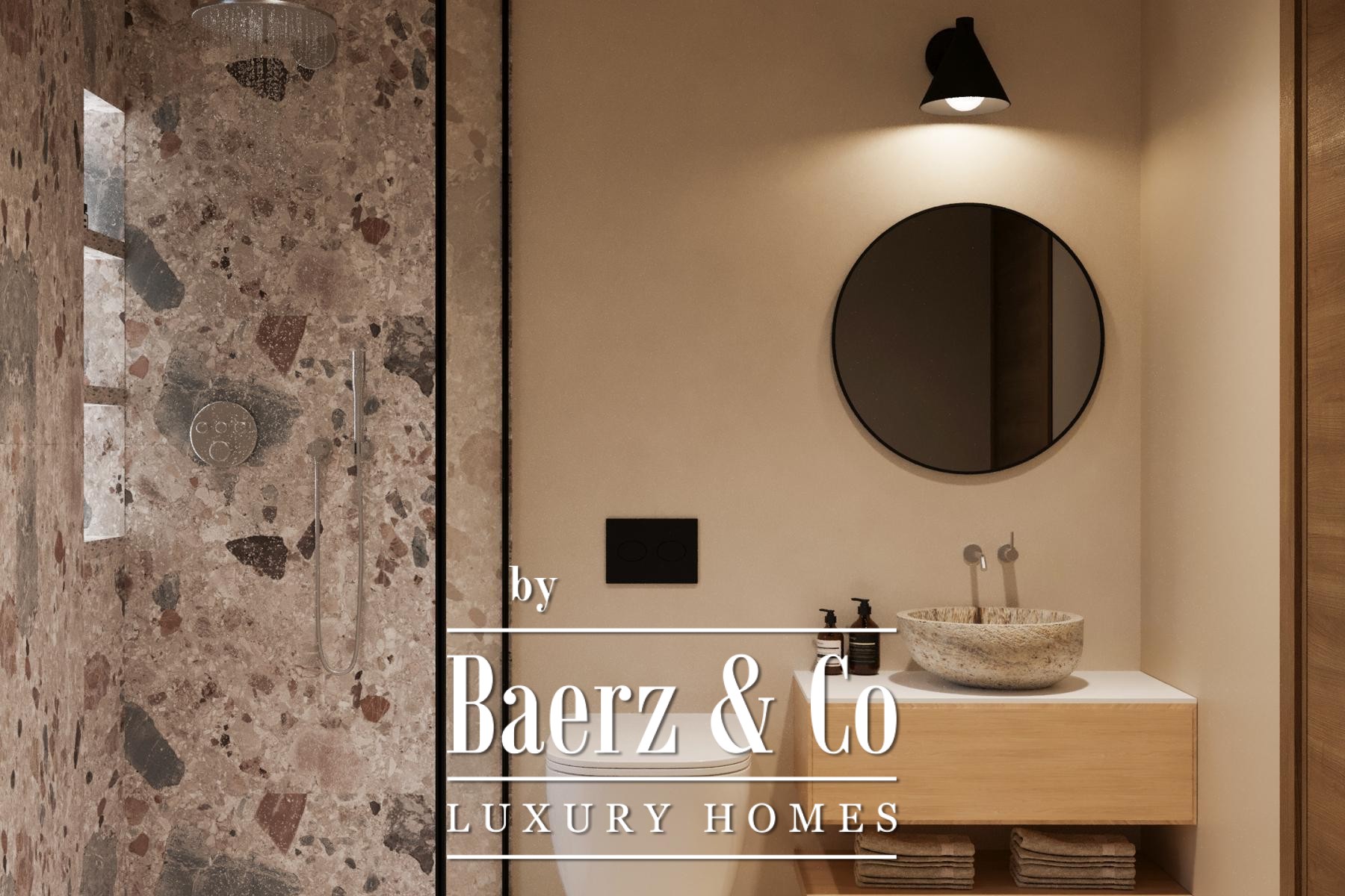 Upstairs, three additional bedrooms each offer an en suite bathroom and direct access to a spacious terrace. Here, sweeping views of the sea and olive groves frame daily rituals with a sense of quiet grandeur. Expansive glass and carefully selected finishes draw light and landscape inward, inviting outdoor living year-round.