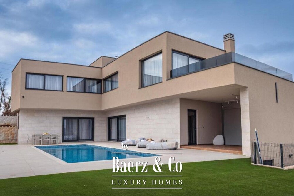 Luxury villa Tinjan offers a rare blend of privacy, elegance, and expansive views in the heart of central Istria. This contemporary home is set on a landscaped plot of 781 m², where large glass walls invite natural light across the 370 m² living area, framing breathtaking vistas of Mount Učka and bringing the beauty of the outdoors inside.