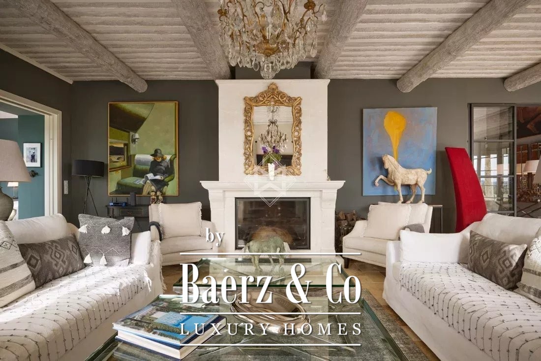 With a living space of 350 sqm, it features a spacious entrance hall with guest toilets, a living room with dining area, a large fully equipped kitchen with pantry opening onto a covered terrace and the swimming pool. A TV lounge, an office/library, five bedrooms with en-suite shower rooms, a fitness room, a wine cellar, a laundry room, and a carport complete this refined property.