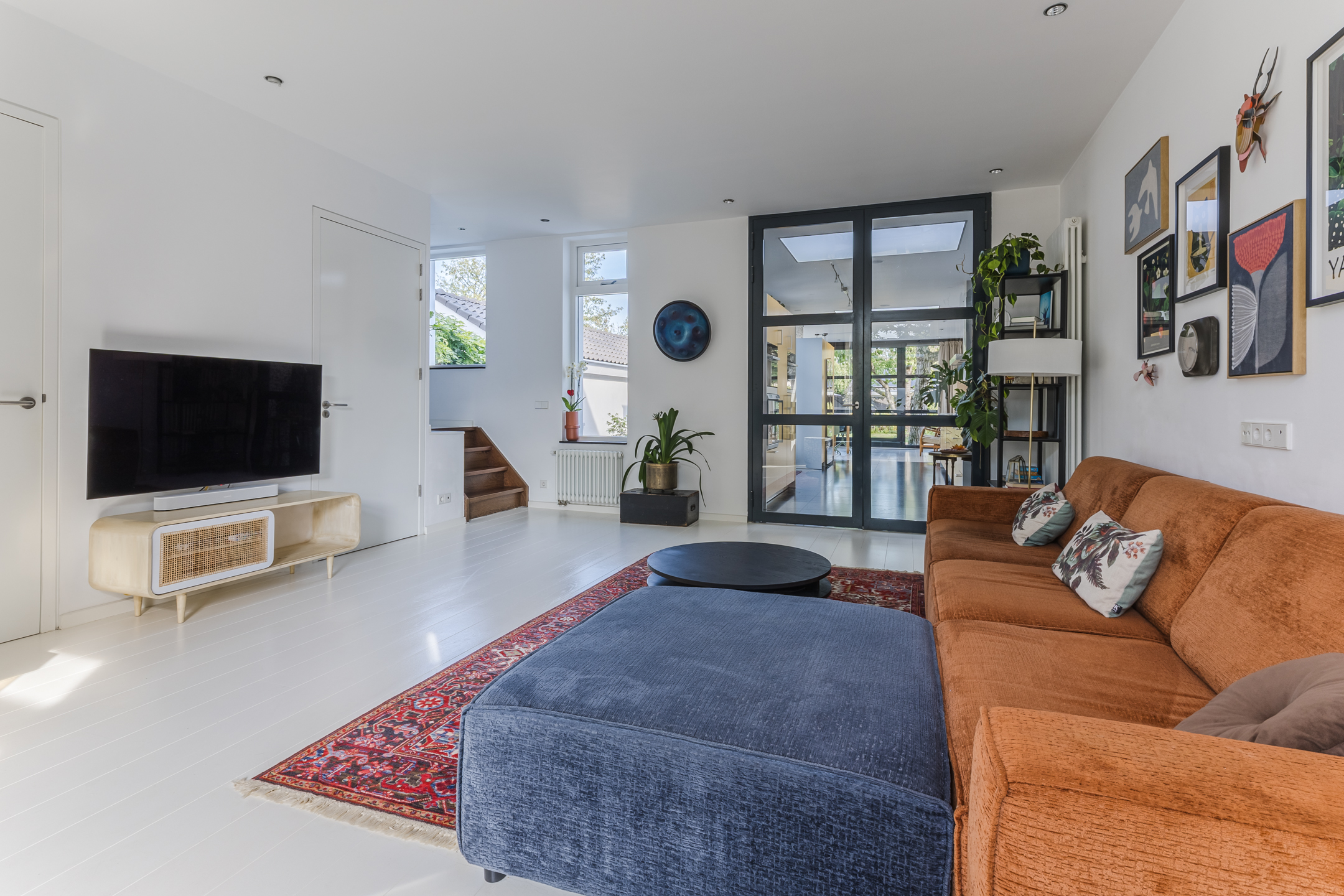 The spacious living area benefits from abundant natural light, underfloor heating, and a gas fireplace. The living room connects openly to the kitchen-diner but can be separated by elegant pivot doors. A practical cellar provides additional storage, and the unique raised room (opkamer) offers access to the first floor.