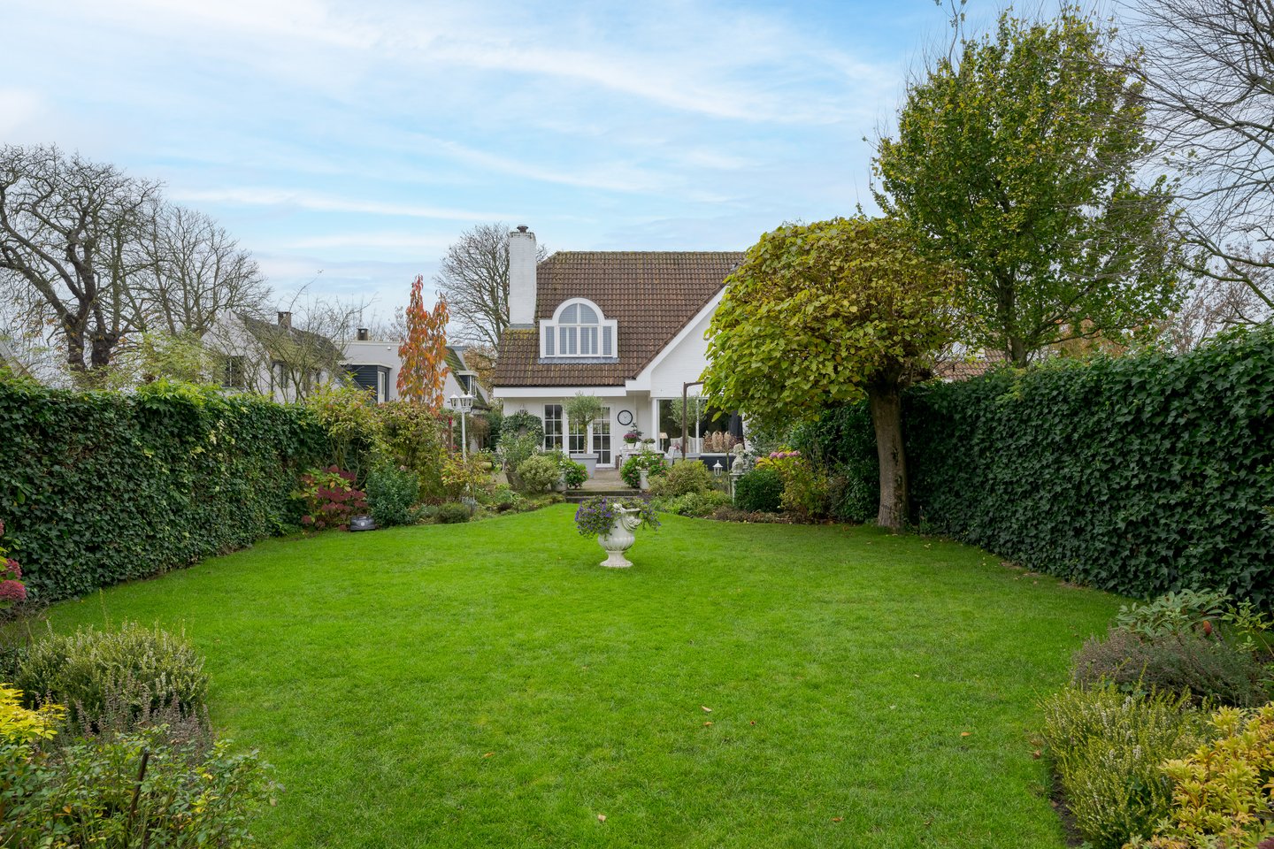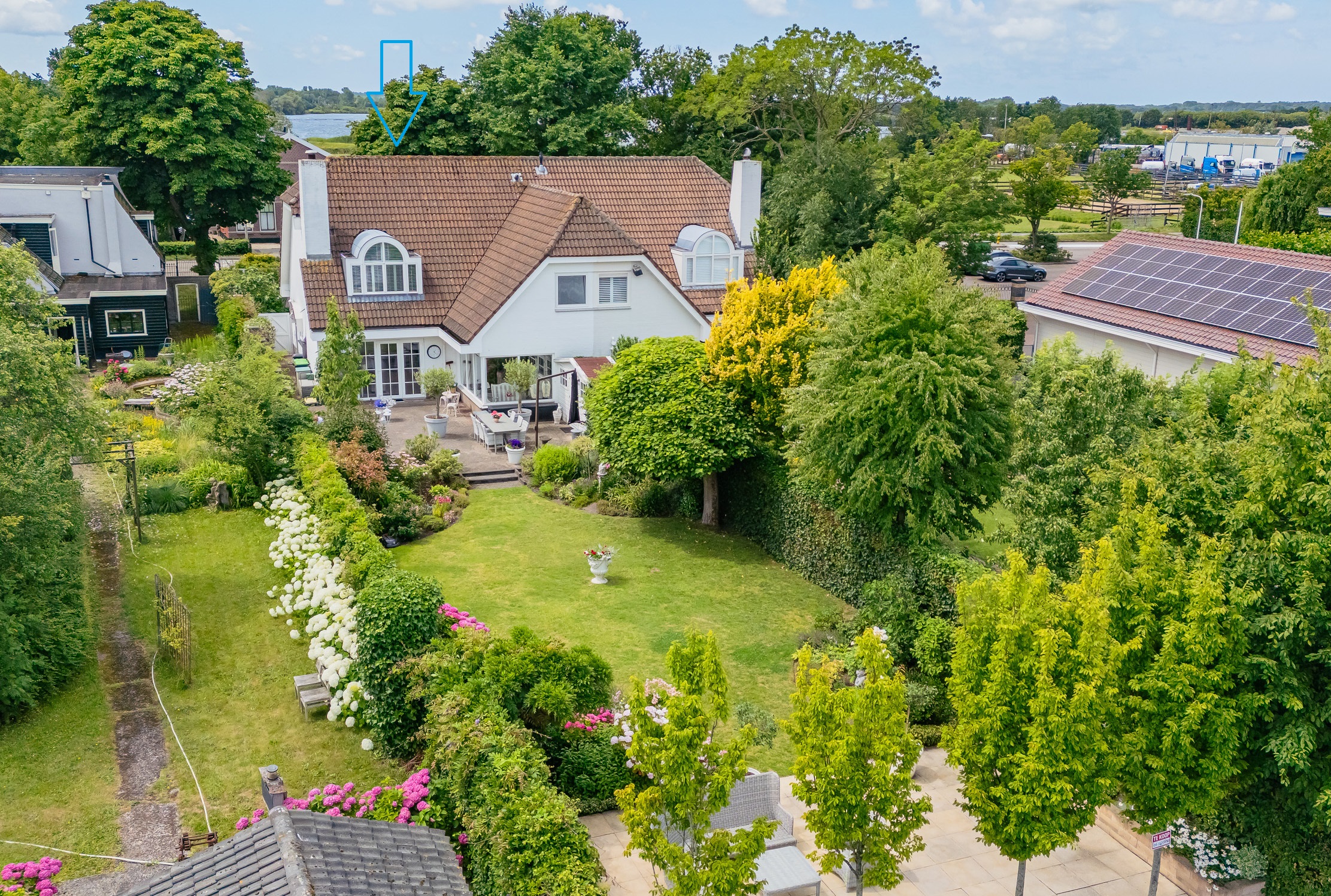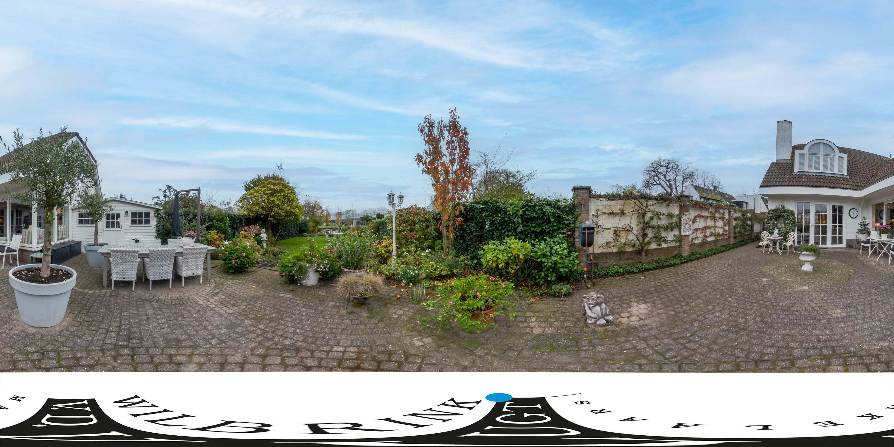 The beautifully landscaped, sunny backyard borders directly on water of the Old Rhine and features a shed and a private jetty. In the front yard is a cozy terrace. In the afternoon and evening you can relax in the sun. The entire garden is equipped with a sprinkler system. In the front garden is parking for three cars on site.