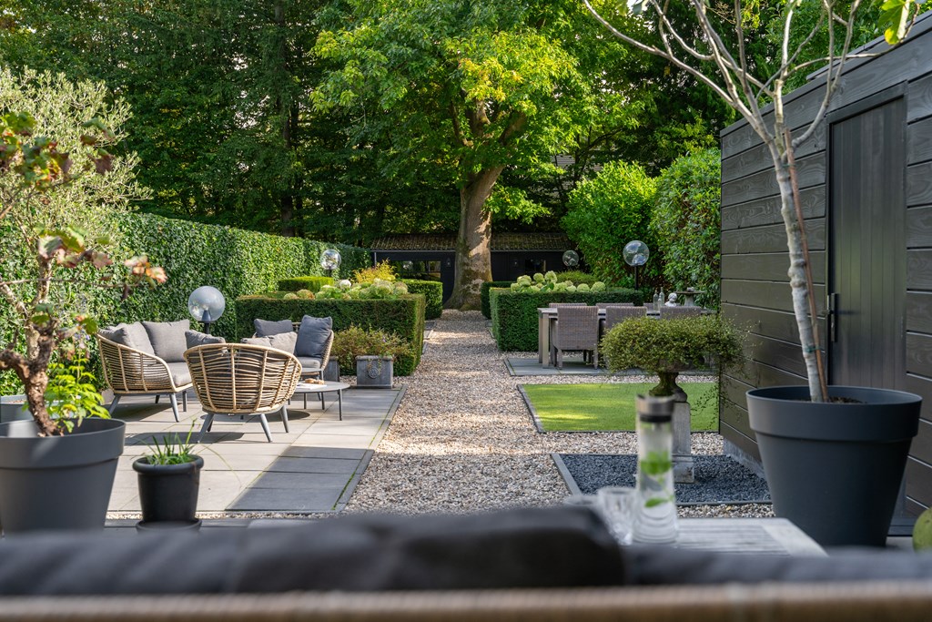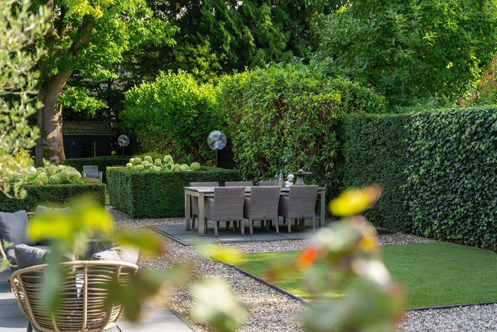The back garden is beautifully maintained and generously sized—ideal for families and outdoor enthusiasts. With a depth of approximately 45 meters, it offers plenty of space to enjoy multiple seating areas, both in the sun and in the shade. The layout is elegant and functional, with artificial grass and colorful flowerbeds providing a low-maintenance yet charming atmosphere.